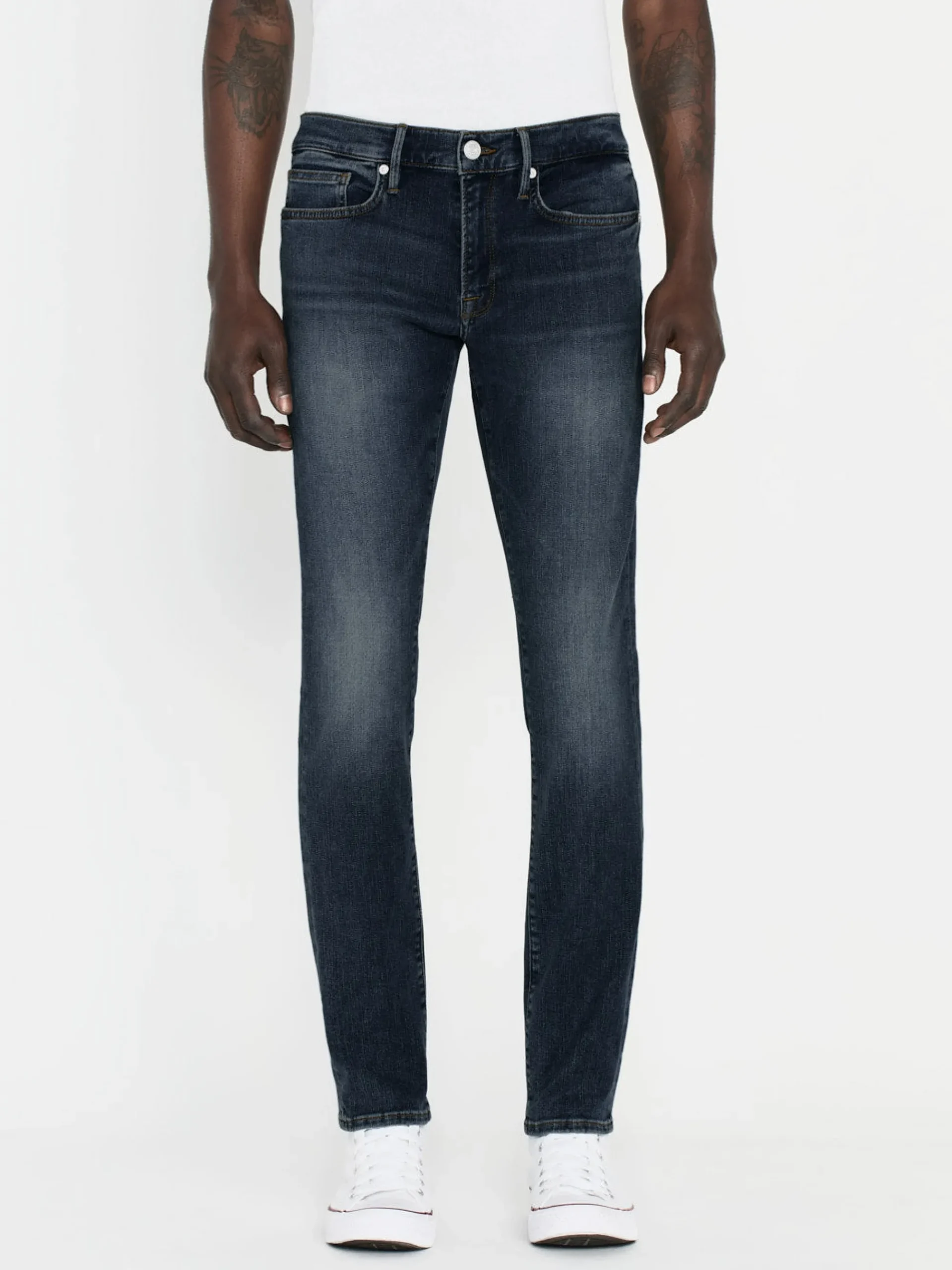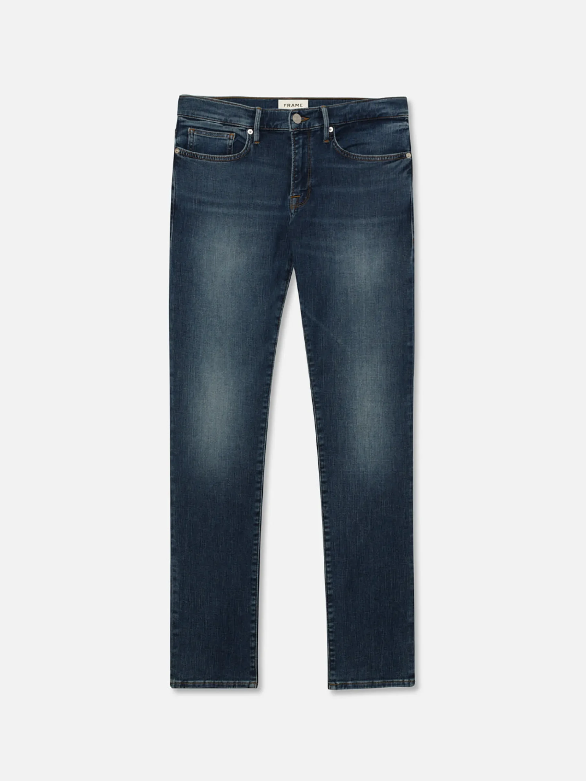 A FRAME signature jean, this style is designed with a classic 5-pocket construction, comfortable mid rise, flattering straight leg, and tapered slim fit at the leg opening. Crafted from smooth super stretch denim.