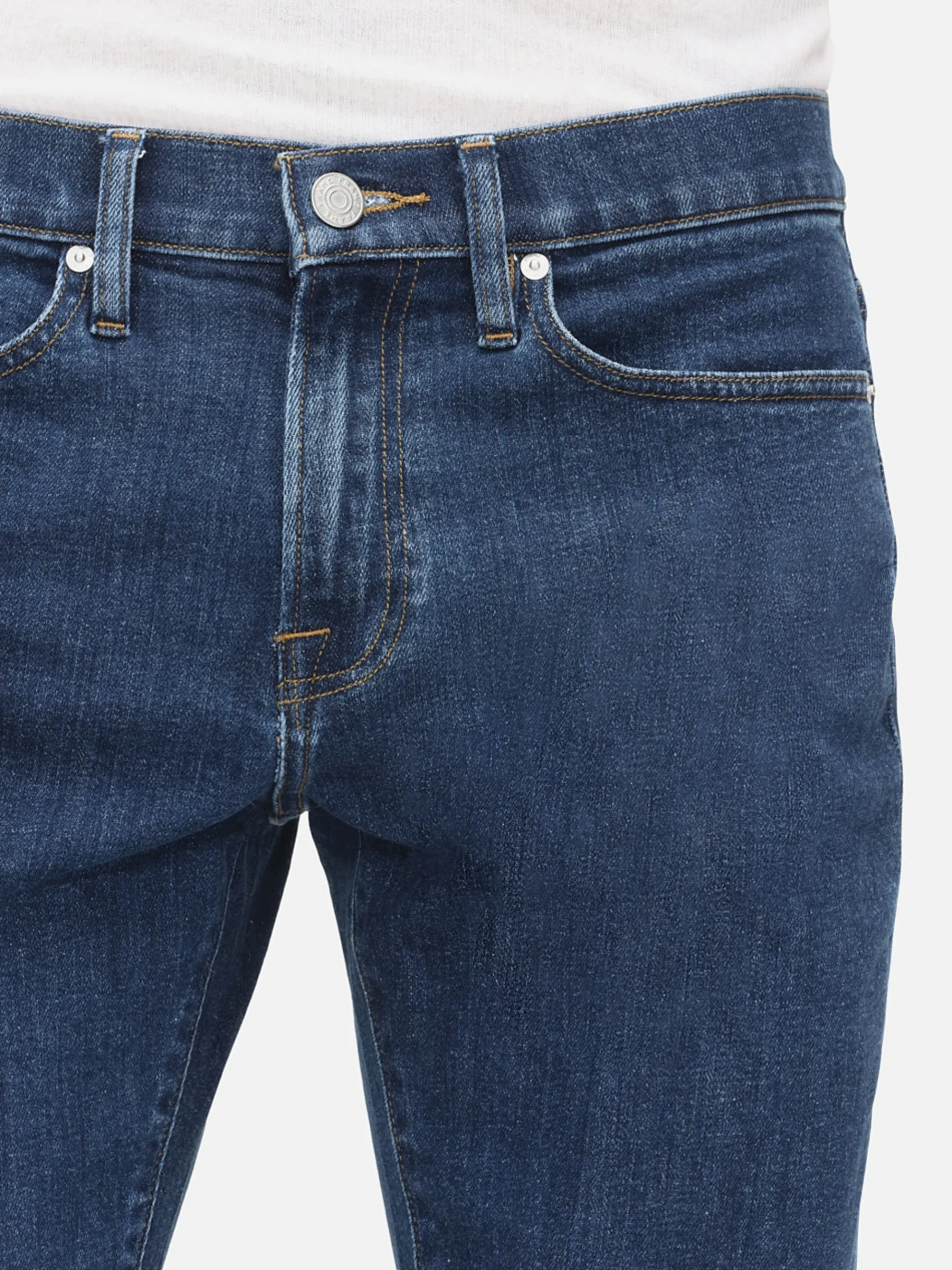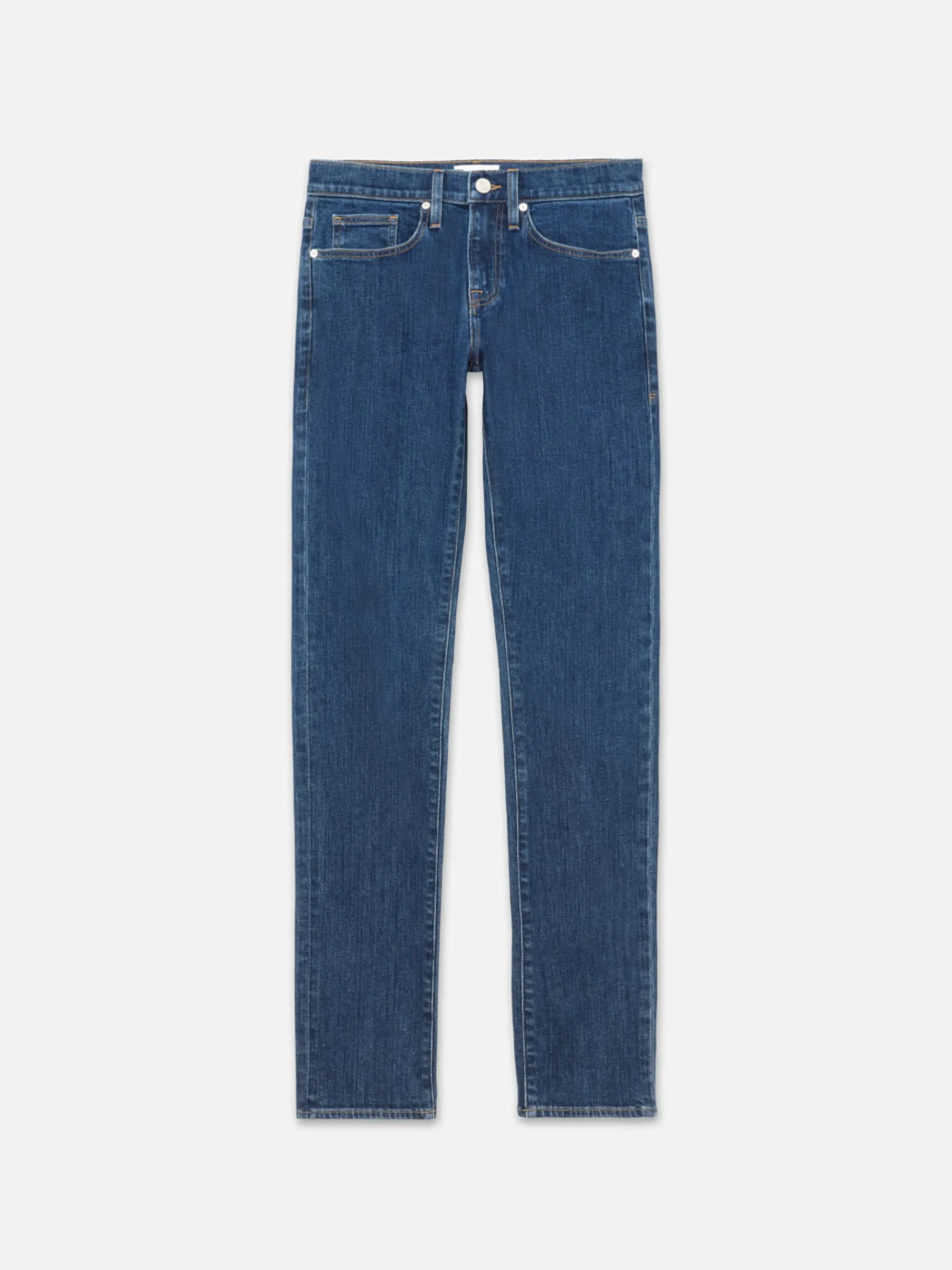 A FRAME signature jean designed with a classic 5-pocket construction, comfortable mid-rise waist, straight leg, and tapered slim fit at the leg opening. Crafted from smooth comfort stretch denim.