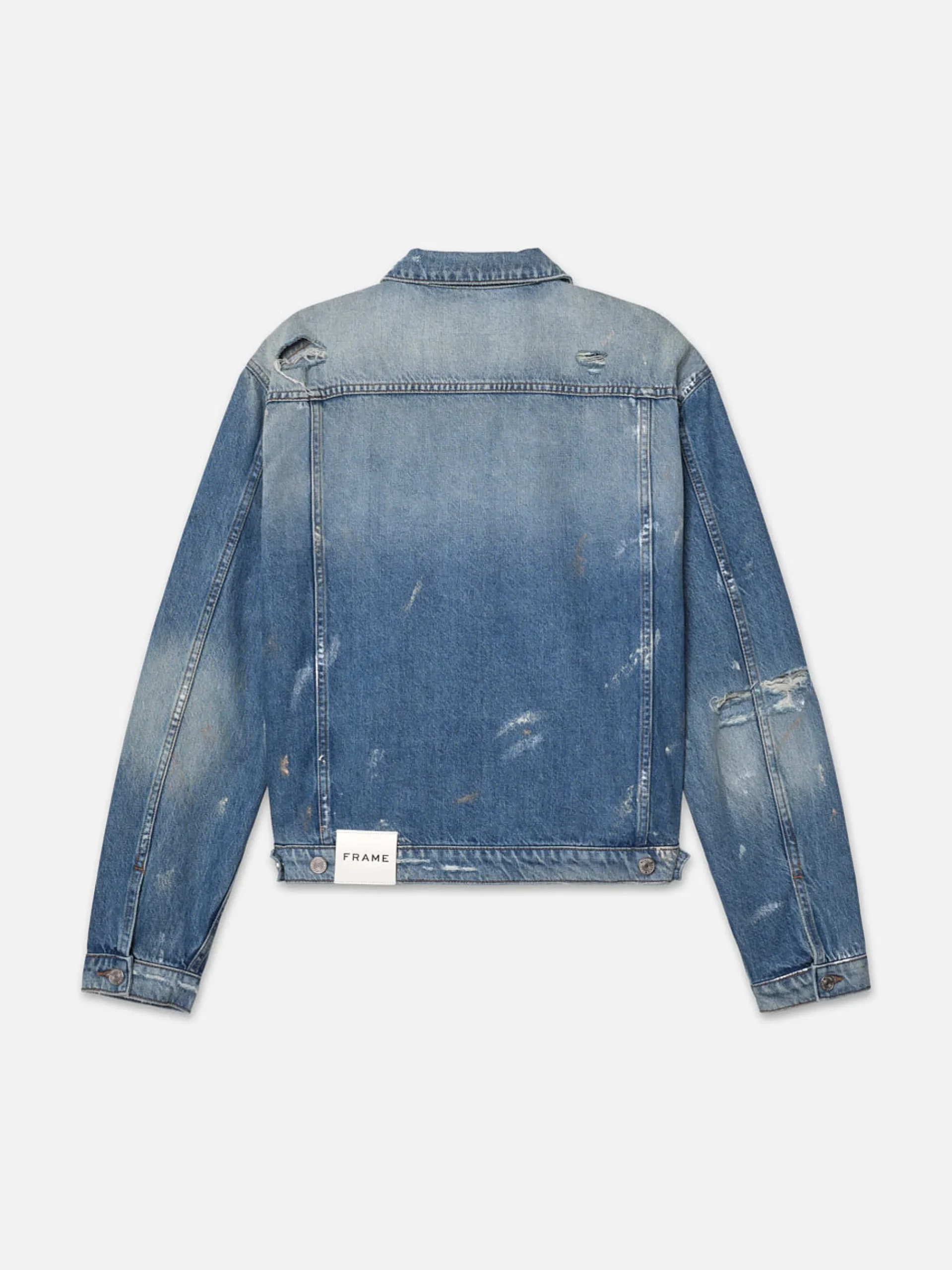 A fresh take on a classic style, this denim jacket features a pointed collar, a button placket, chest and side pockets, and pleats. Crafted from rigid 100% cotton denim with distress marks and paint splatters for an extra lived-in look.