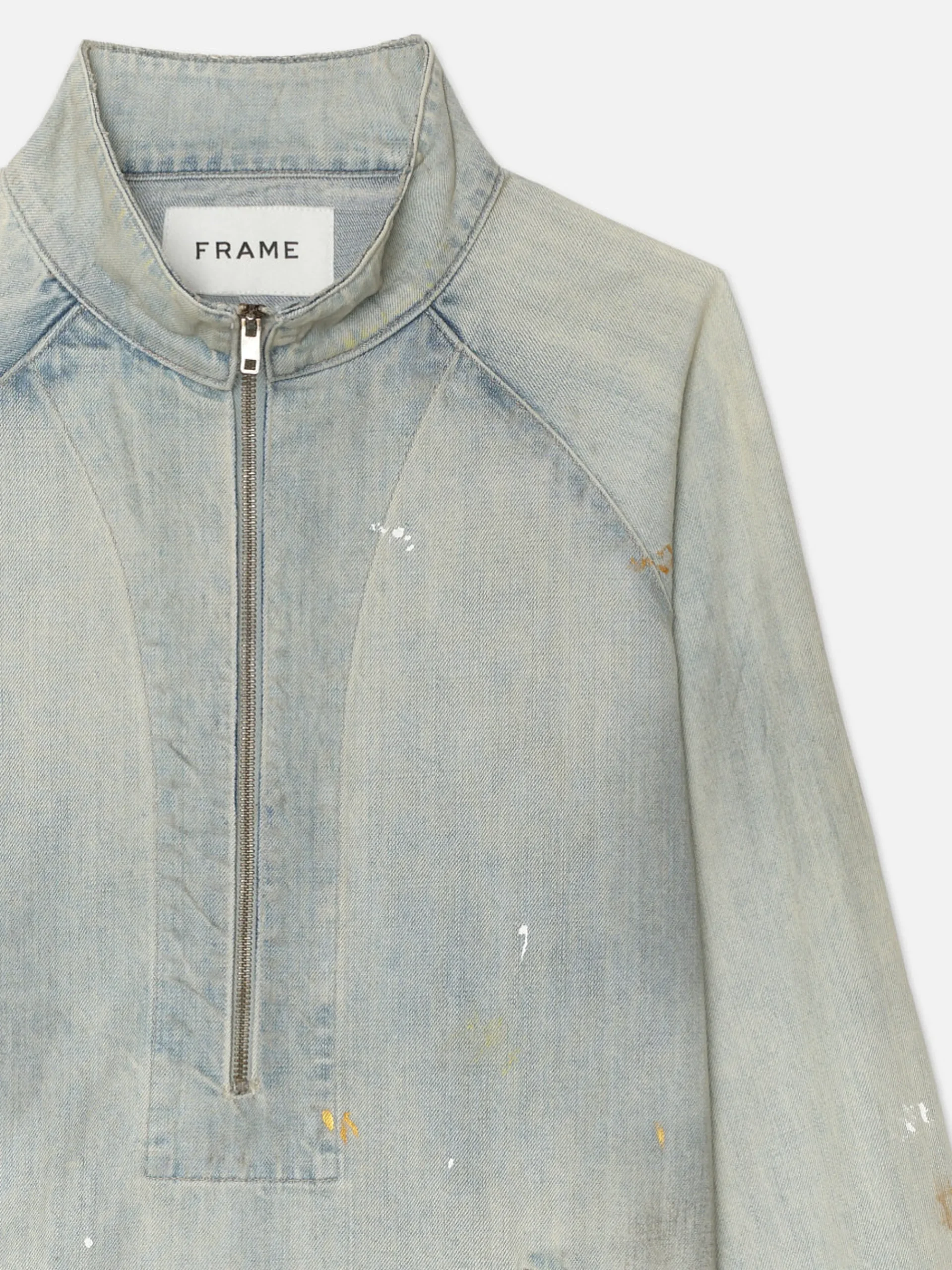 A fresh take on vintage California skate style, this denim jacket features a stand collar, a halfway zipper, side pockets, elastic cuffs, and a drawstring hem. Crafted from rigid 100% cotton denim with fade marks and paint splatters for an extra lived-in look.