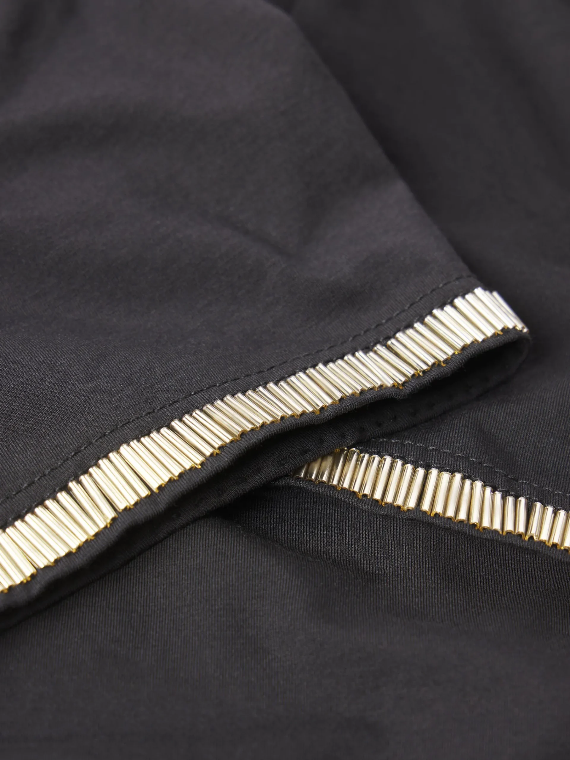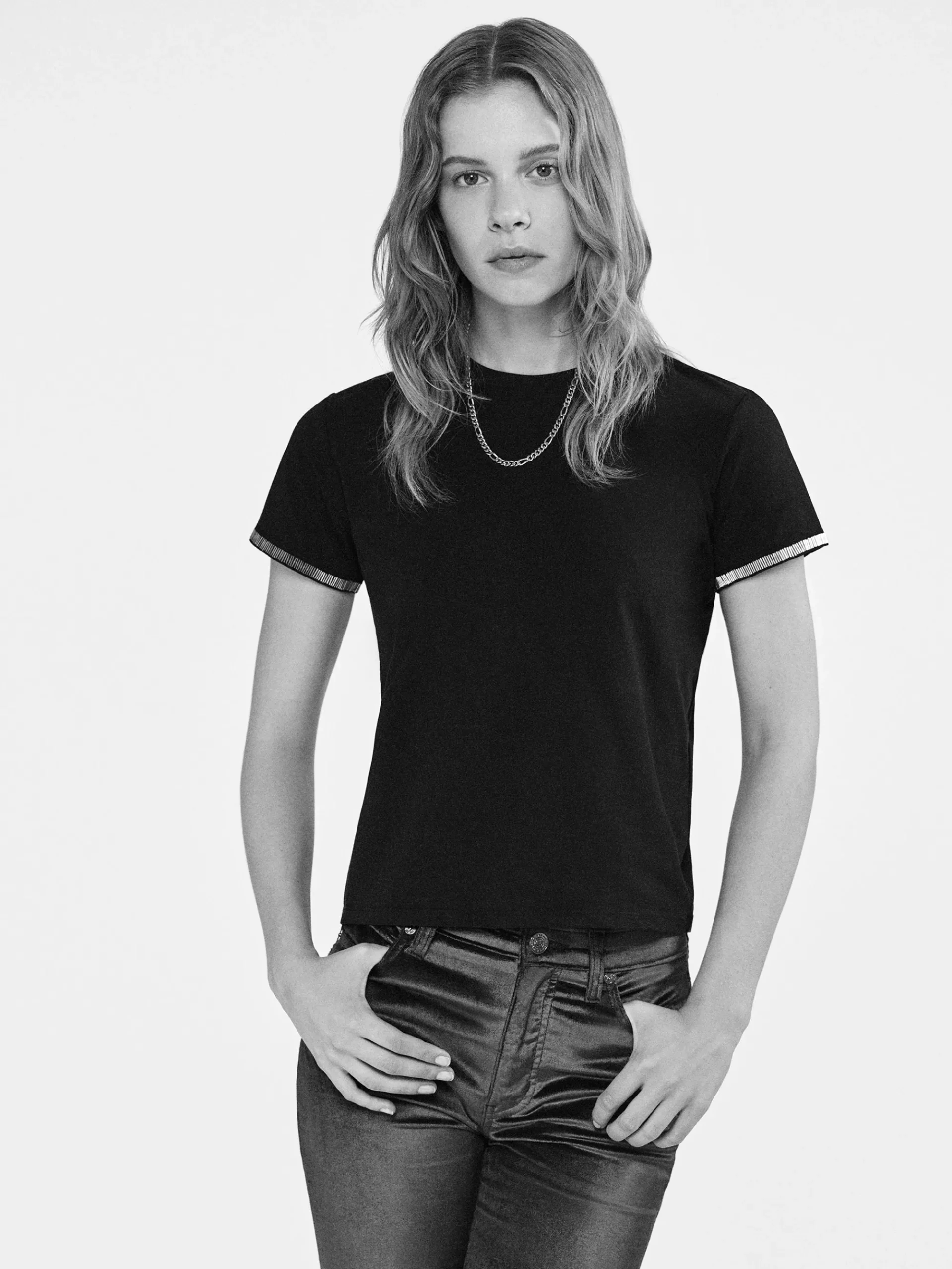 The Beaded Tee adds a scosche of sparkle to the everyday wardrobe. The classic crewneck tee is crafted from soft and slightly stretchy mercerized cotton, embellished by reflective beads that line the short sleeves’ hems. Designed to be dressed up or down, this tee strikes the perfect balance.