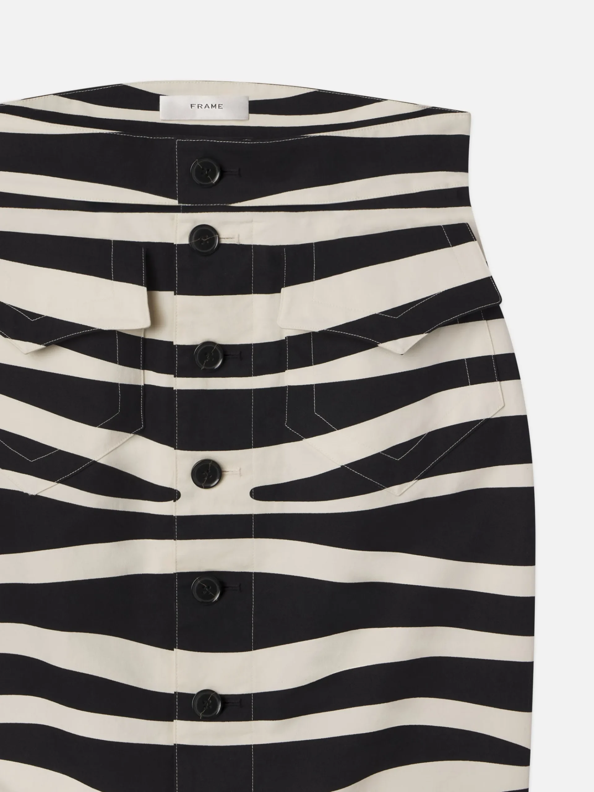 Walk on the wild side in the Button Front Skirt. Zebra-esque stripes revamp a classic silhouette with a cinched waist and western-inspired pockets. Note how they gently flare at the hip for an hourglass effect, and the slight splay at the bottom for enhanced mobility.
