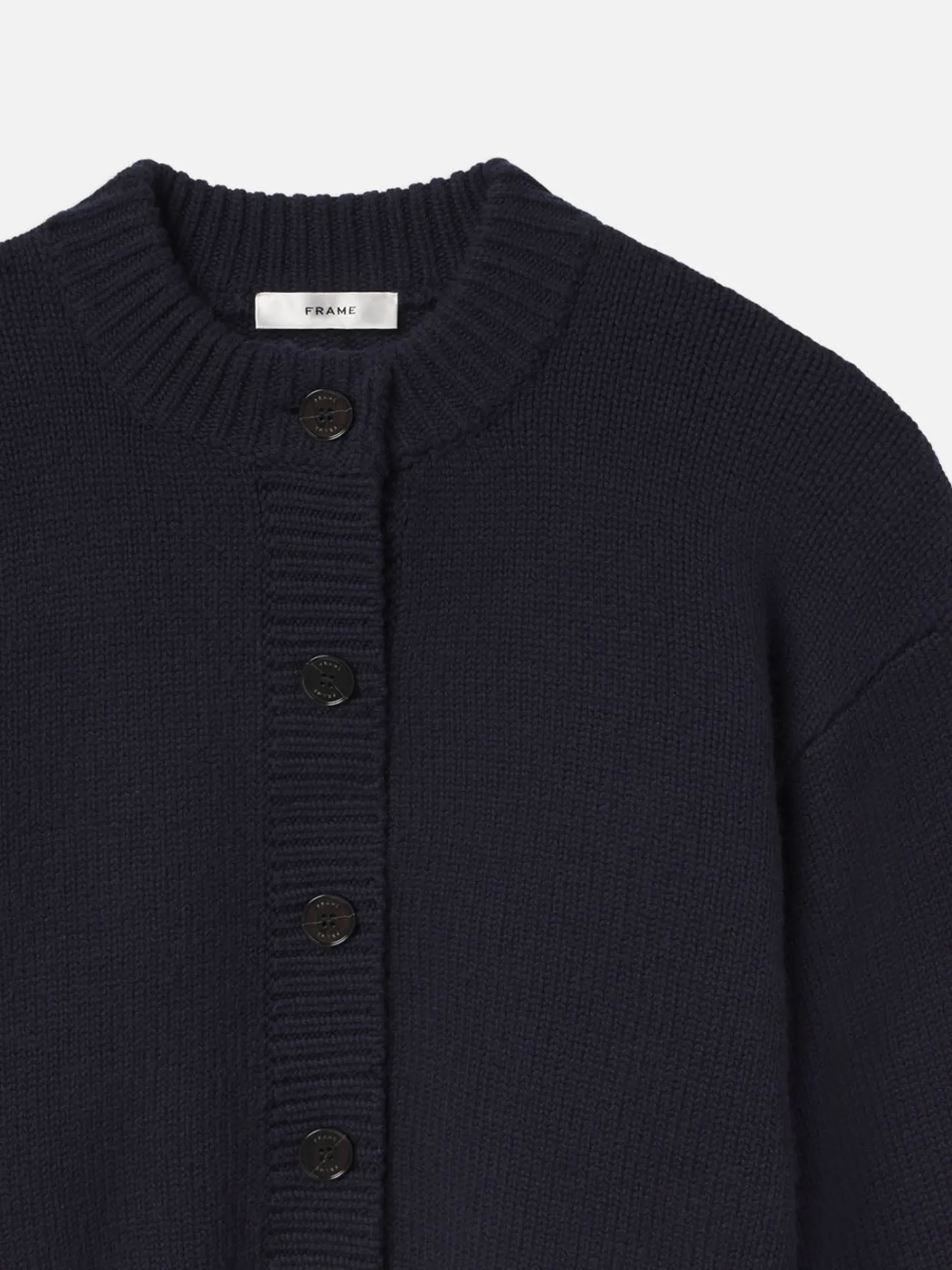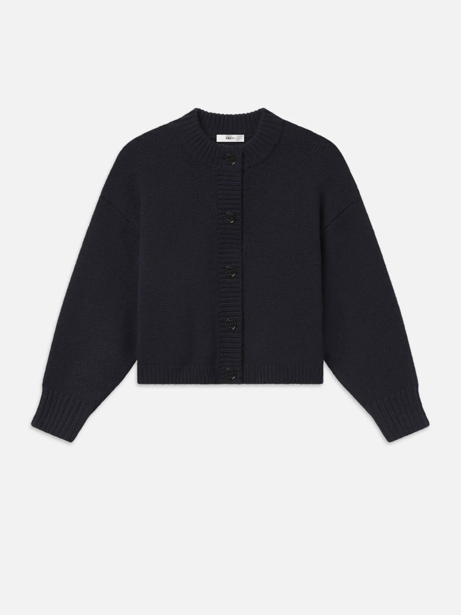 A chunky, oversized silhouette with batwing sleeves, large tonal buttons and finished with chunky ribbed trim. This crewneck cardi is knit from a responsible wool-cashmere blend.