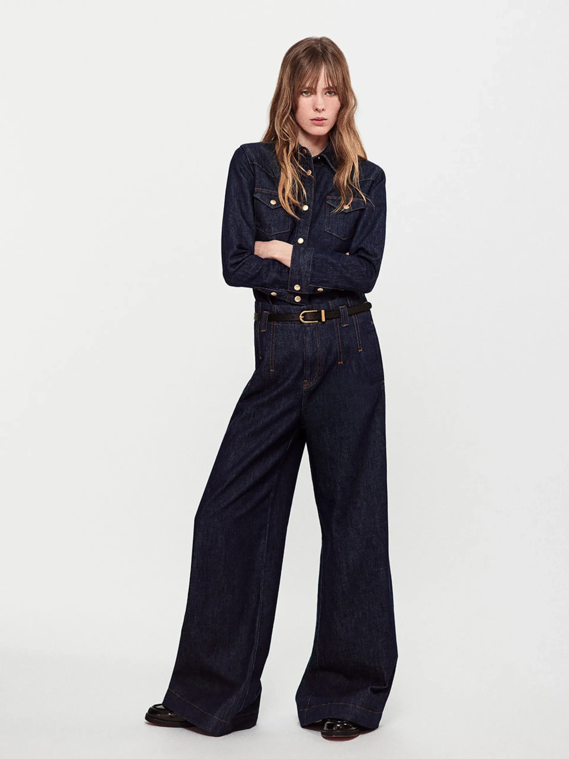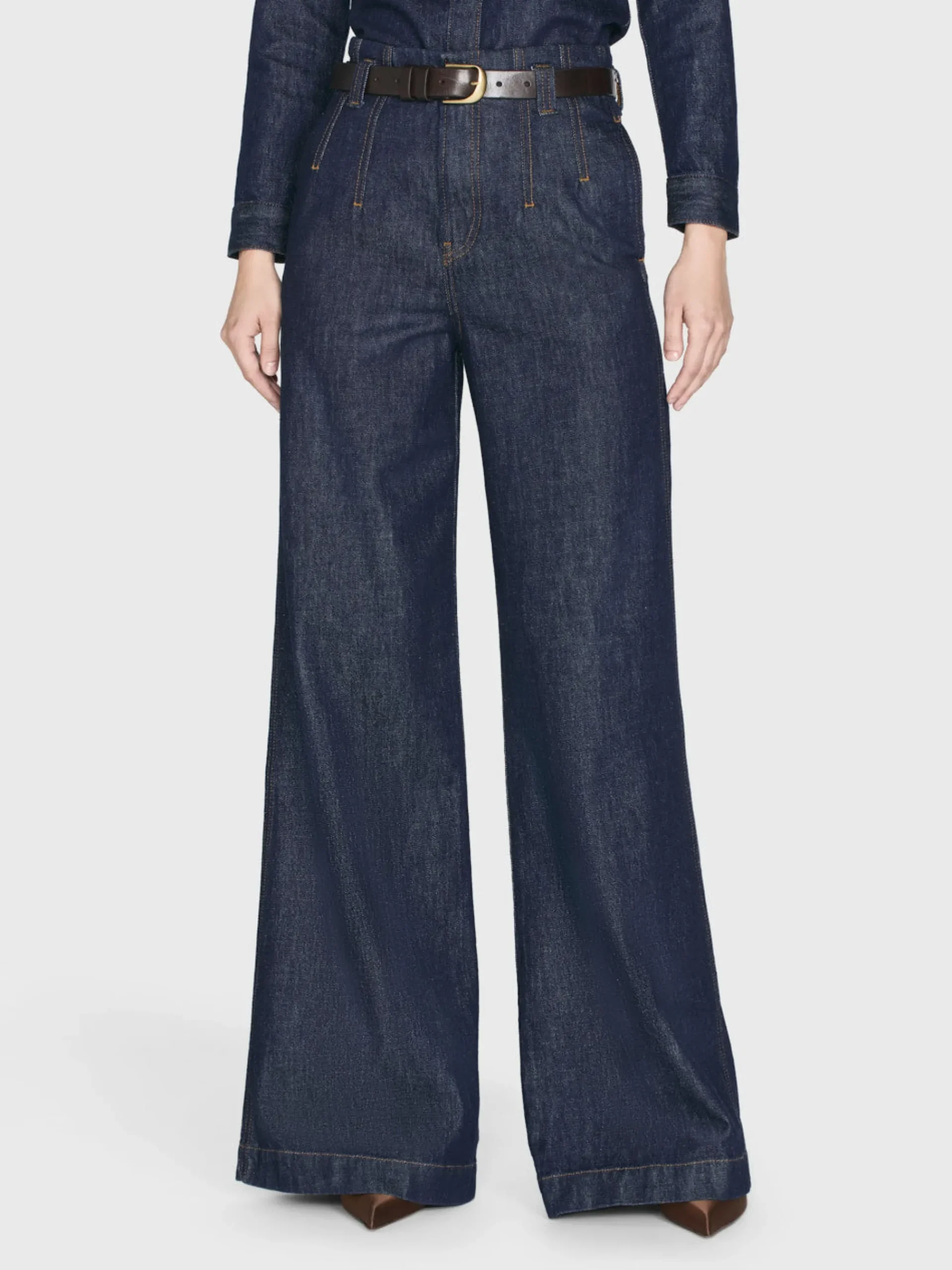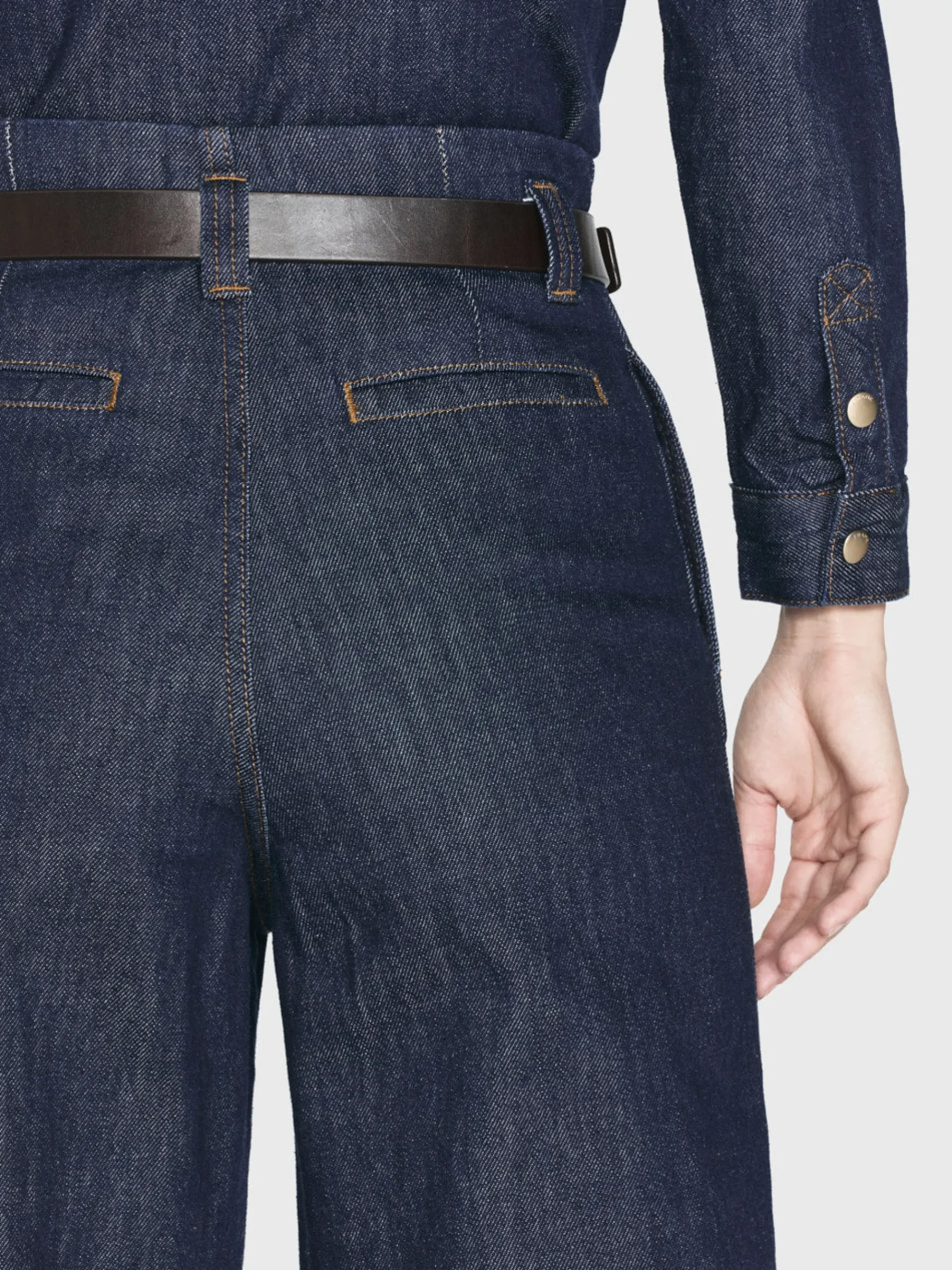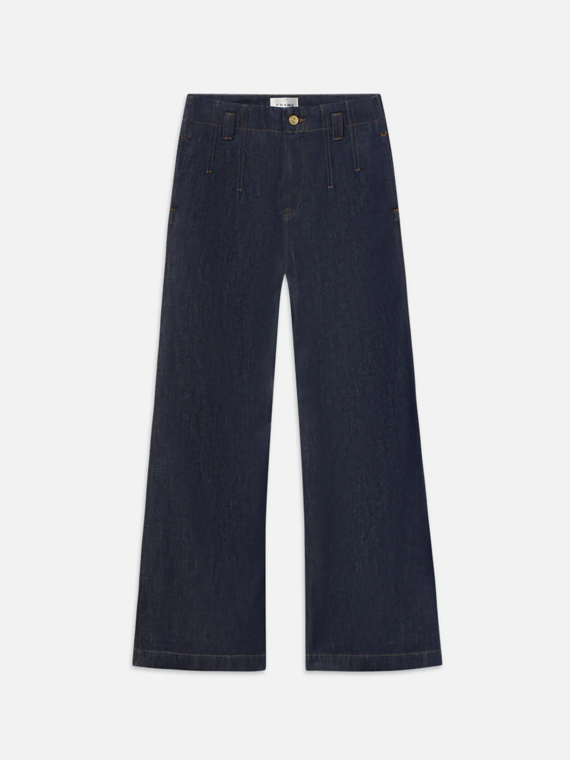 A tailored denim trouser with front and back darts for a streamlined fit at the waist. This high-rise wide-leg jean is cut from a luxurious rigid denim that breaks in beautifully with each wear. Featuring trouser pocket detailing and a leg-lengthening 33″ inseam for a modern alternative to traditional suiting.