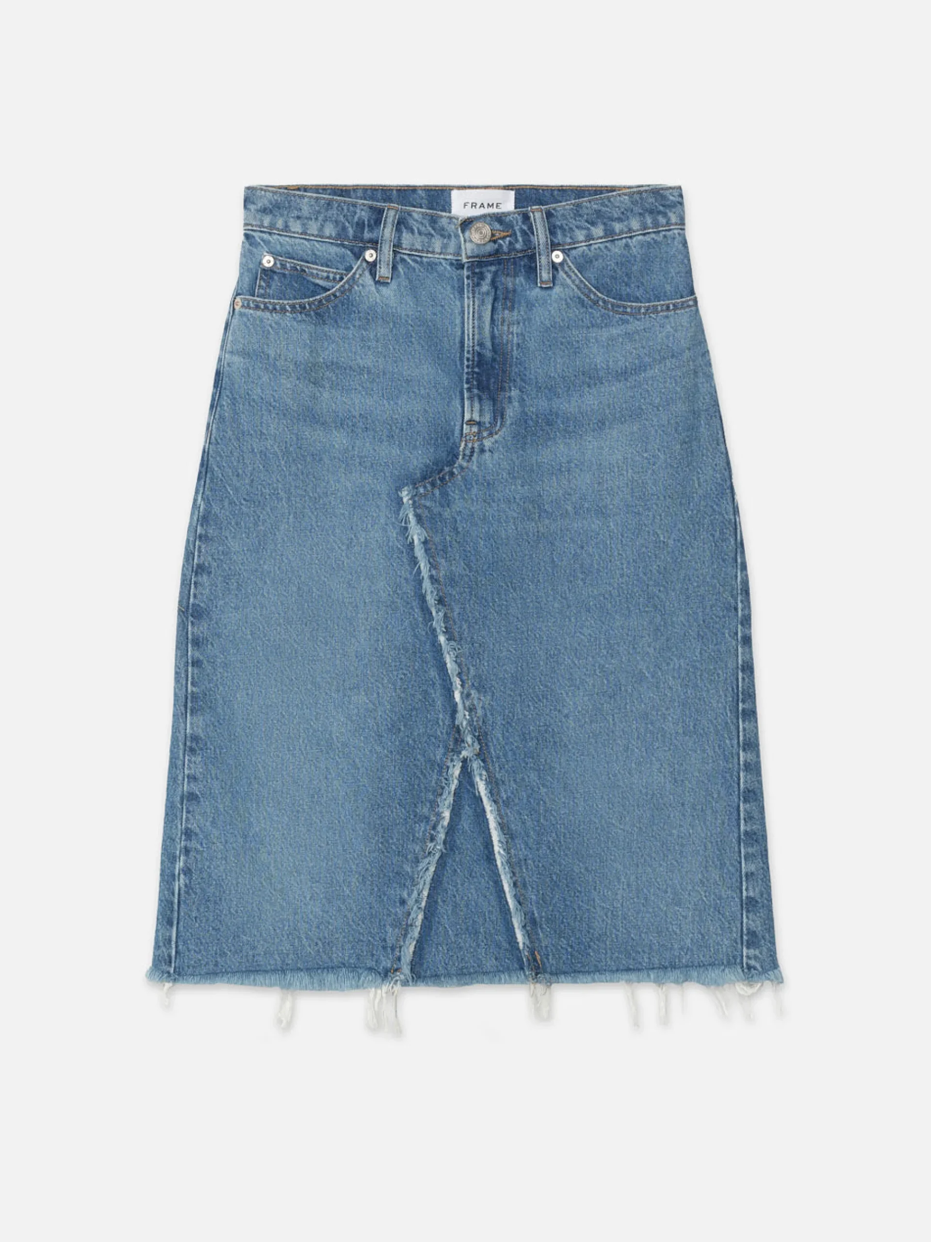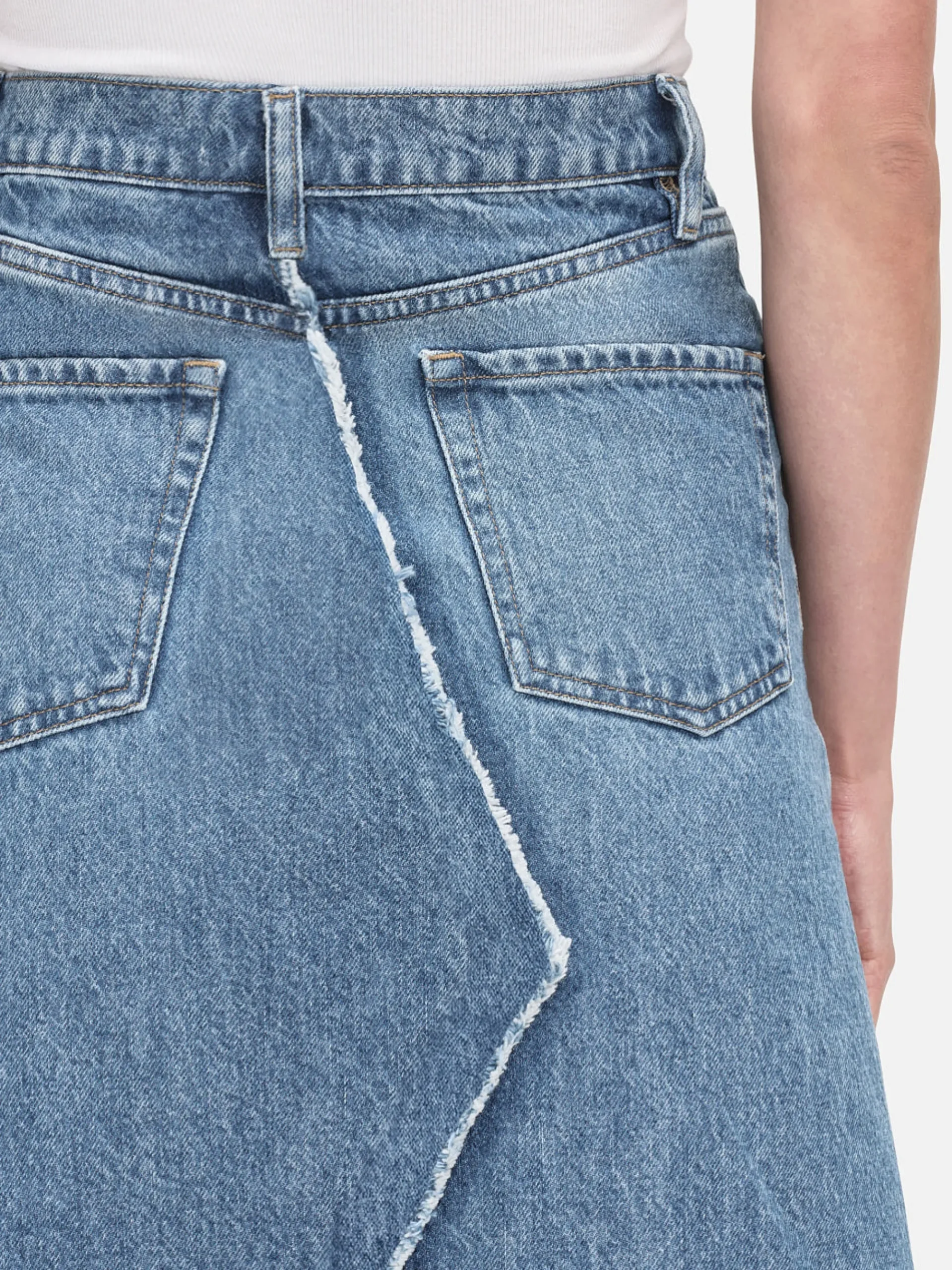 Giving the illusion of a jean that’s been reconstructed into a skirt—this high-rise midi skirt features an angled seam at the front and back with a frayed hem and patch details. It’s crafted from a FRAME sustainable denim made with recycled materials.