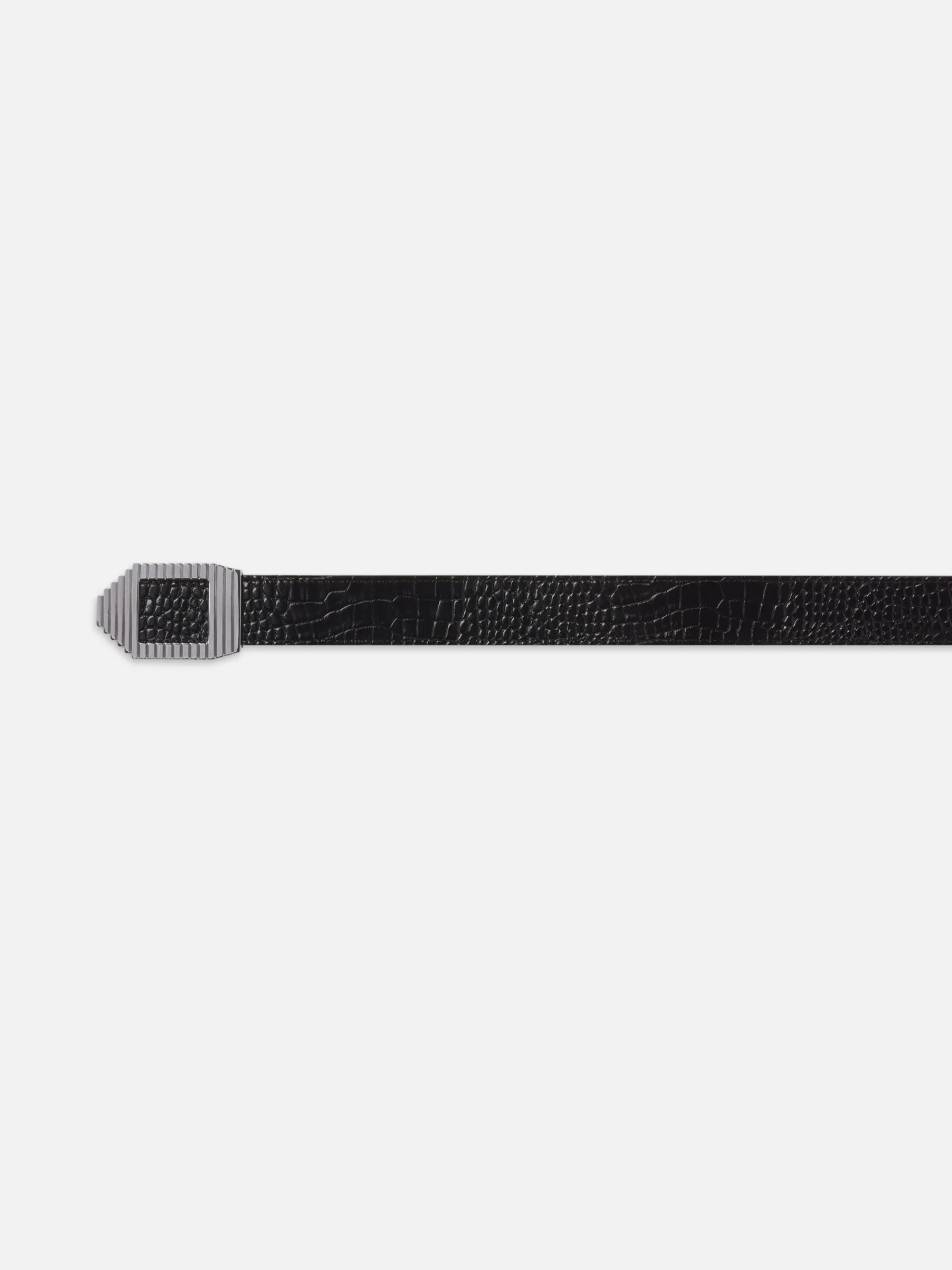Your styling secret weapon, the Geometric Buckle Belt flaunts croc-embossed leather and a unique buckle with cascading ridges. The go-to accessory to cinch dresses and jeans alike.