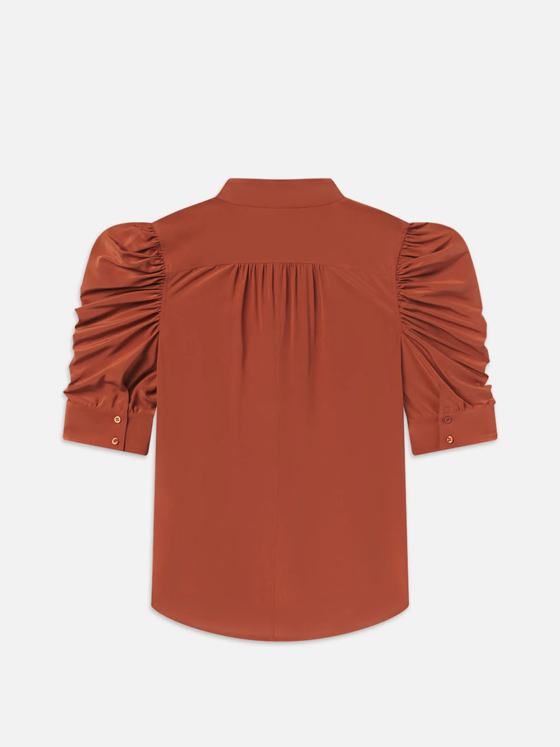 At once modern and romantic, this matte silk blouse has become a FRAME favorite. Featuring a high neckline and boldly puffed sleeves with ruched detailing, it easily complements any of your denim. Finish the look with leather boots and a slim belt.