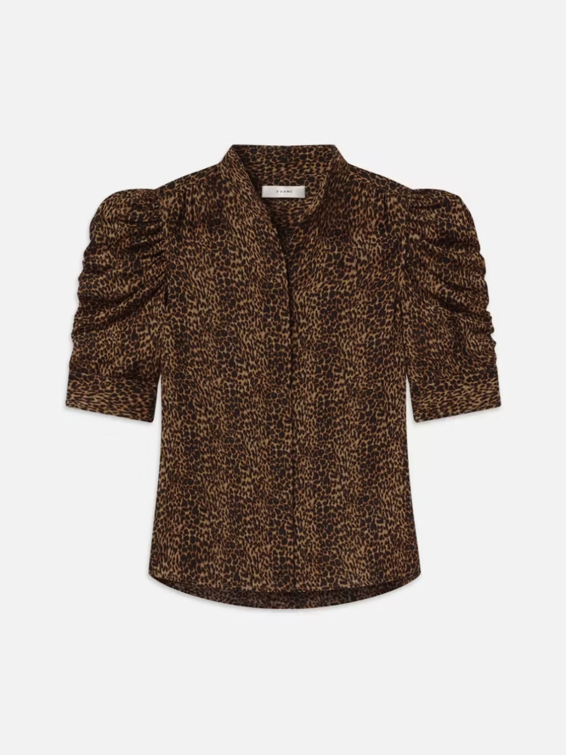 At once modern and romantic, this leopard silk blouse has become a FRAME favorite. Featuring a high neckline and boldly puffed sleeves with ruched detailing, it easily complements any of your denim. Finish the look with leather boots and a slim belt.