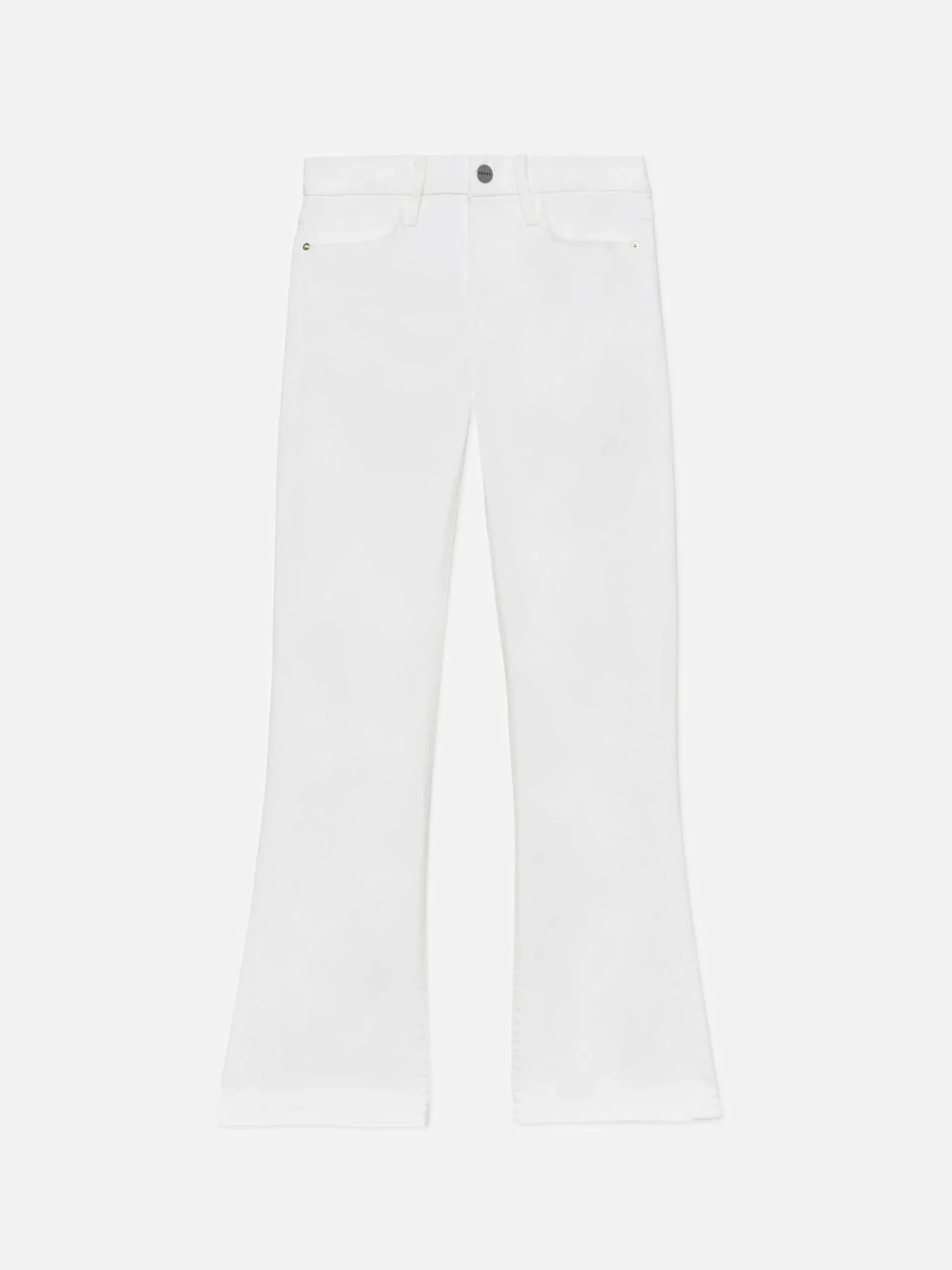 A cropped boot-cut jean, this high-rise pair is designed with a contour waistband that is form-fitting at the top and kicks from the knee.