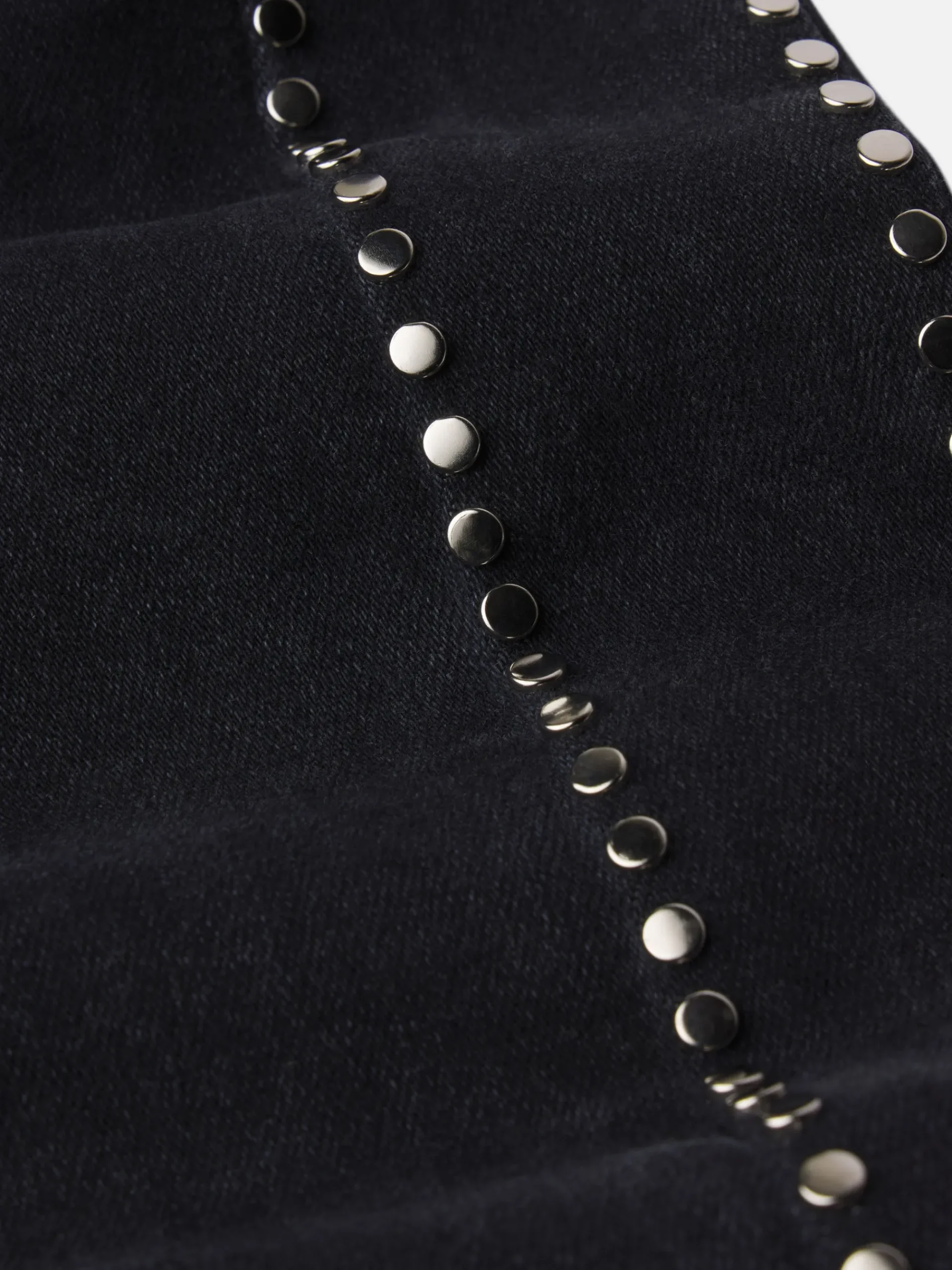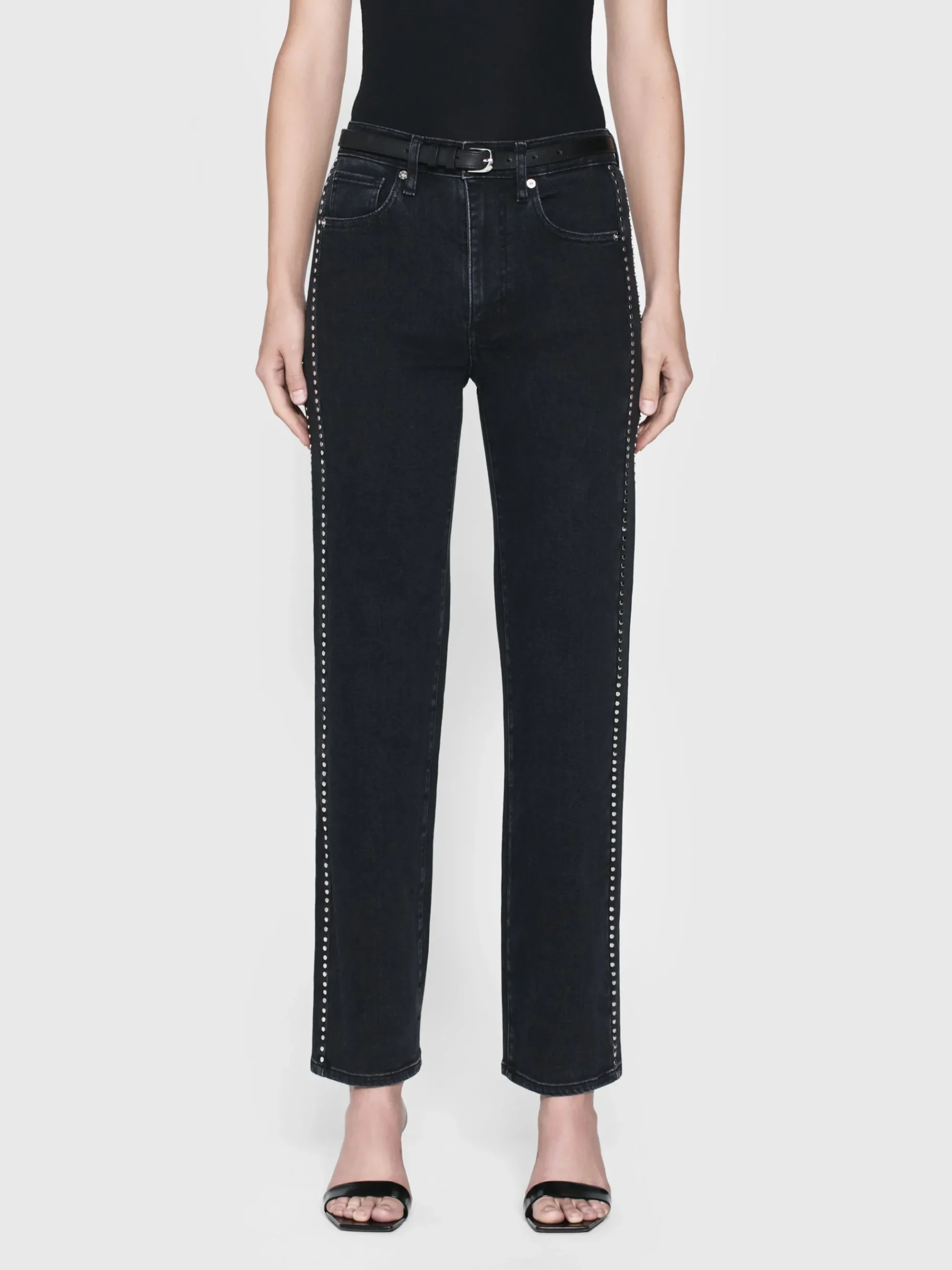 Cut in super stretch denim for all day comfort, Le Sleek Straight Studded features the same high rise and relaxed straight leg that hits at the ankle, now perfectly prepped for parties and elevated daily dressing with slender panels of silver studs shimmering down either leg.