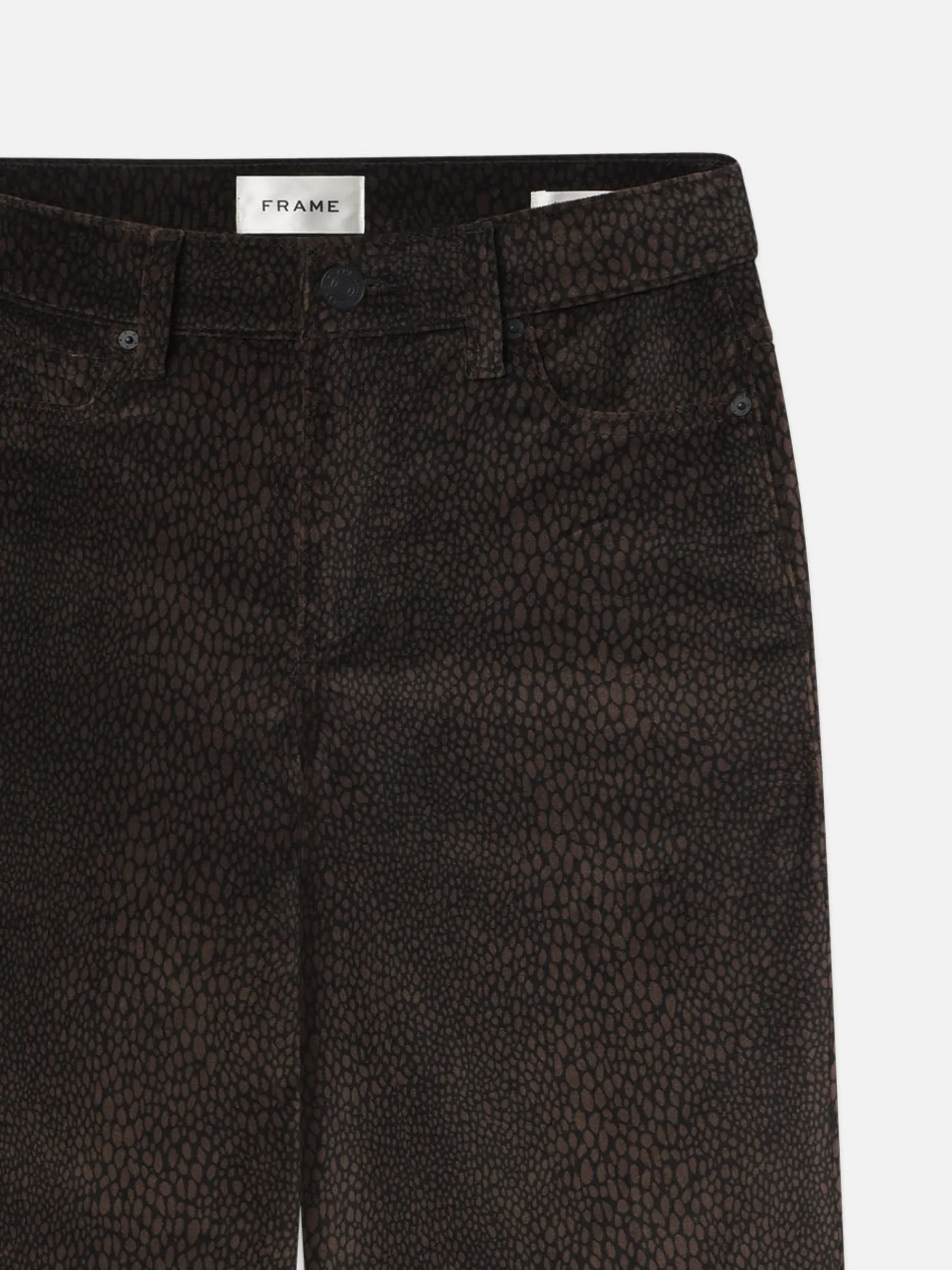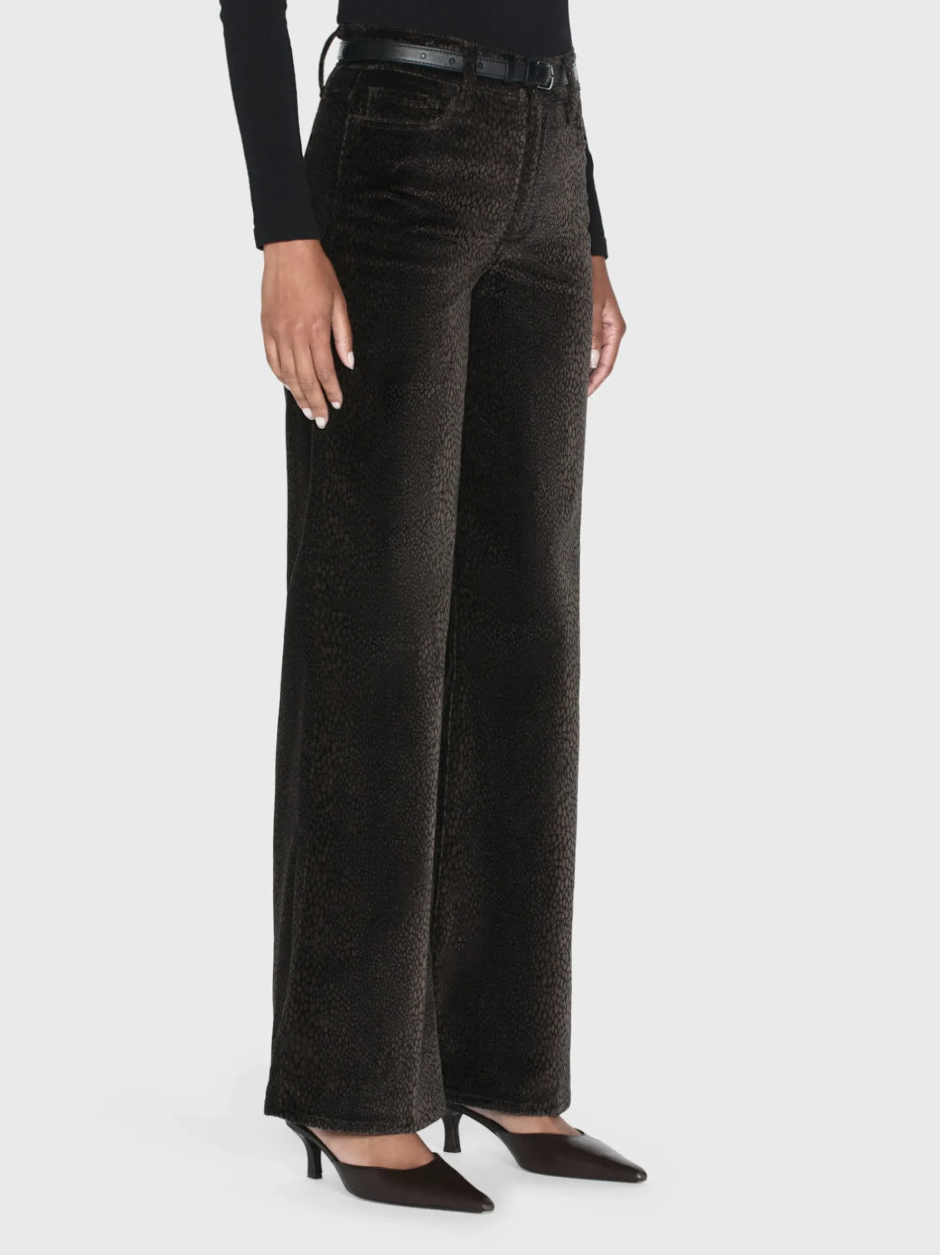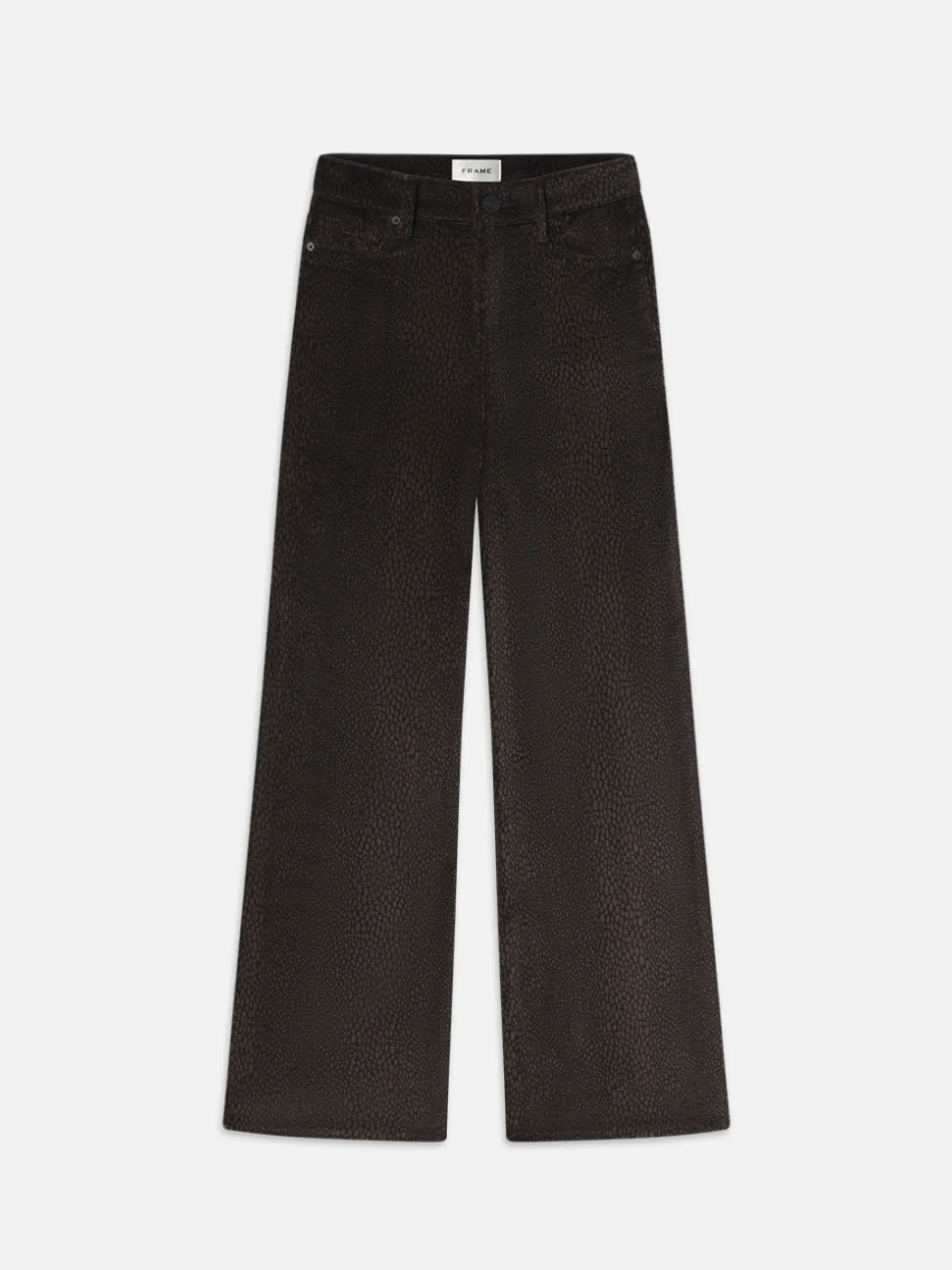 A FRAME introduction to the best-selling palazzo silhouette, this jean is designed with a flattering high rise, fitted hip, and subtle wide-leg flare that hits at the floor. Crafted from a sustainable, comfort-stretch cotton blend featuring a trend-forward animal print on a plush velvet denim.