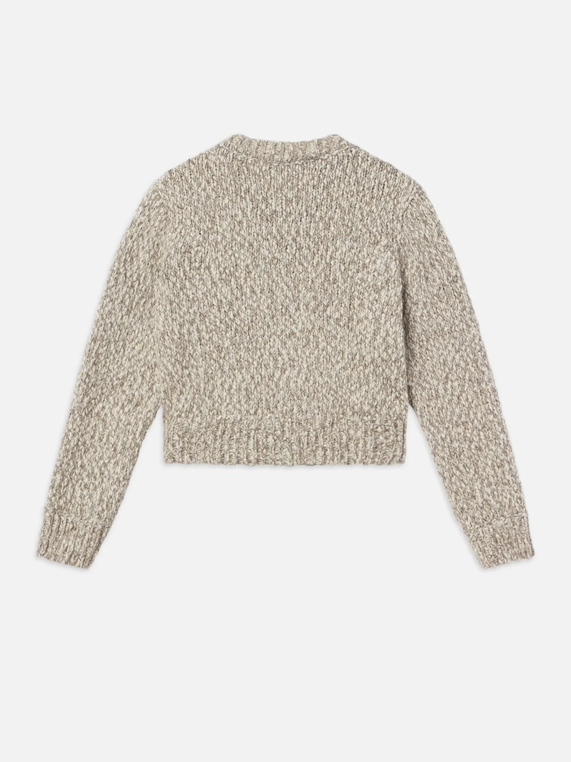 A cropped long sleeve cardi with contrasting buttons and ribbing at the sleeves and waist. Knitted from a cozy, mixed marl wool.