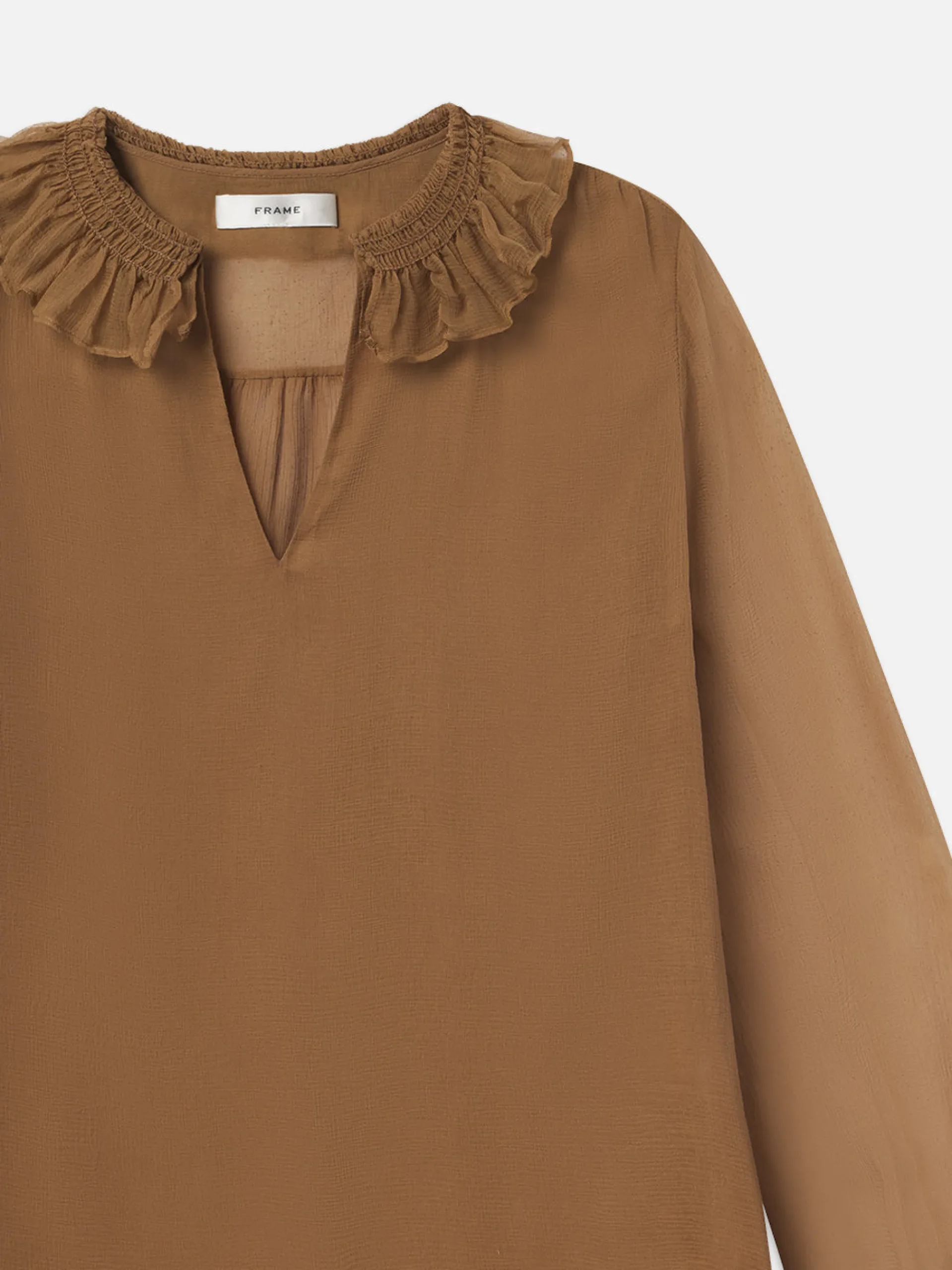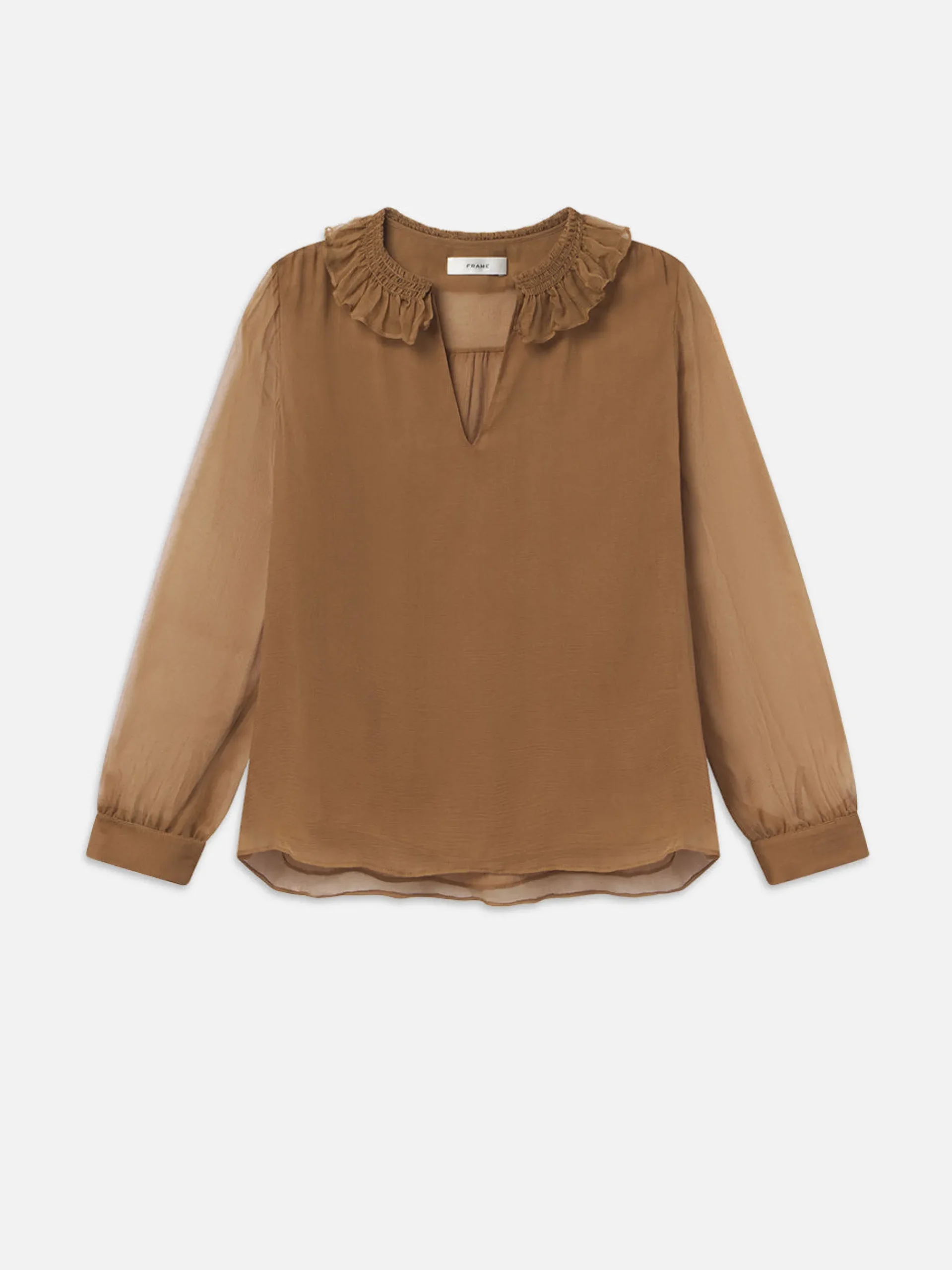 Sheer long sleeve blouse with ruffled collar, subtle v-neckline, draped silhouette with back shirring, and tonal buttons at the adjustable cuffs. Designed in ultra-luxurious 100% silk chiffon.