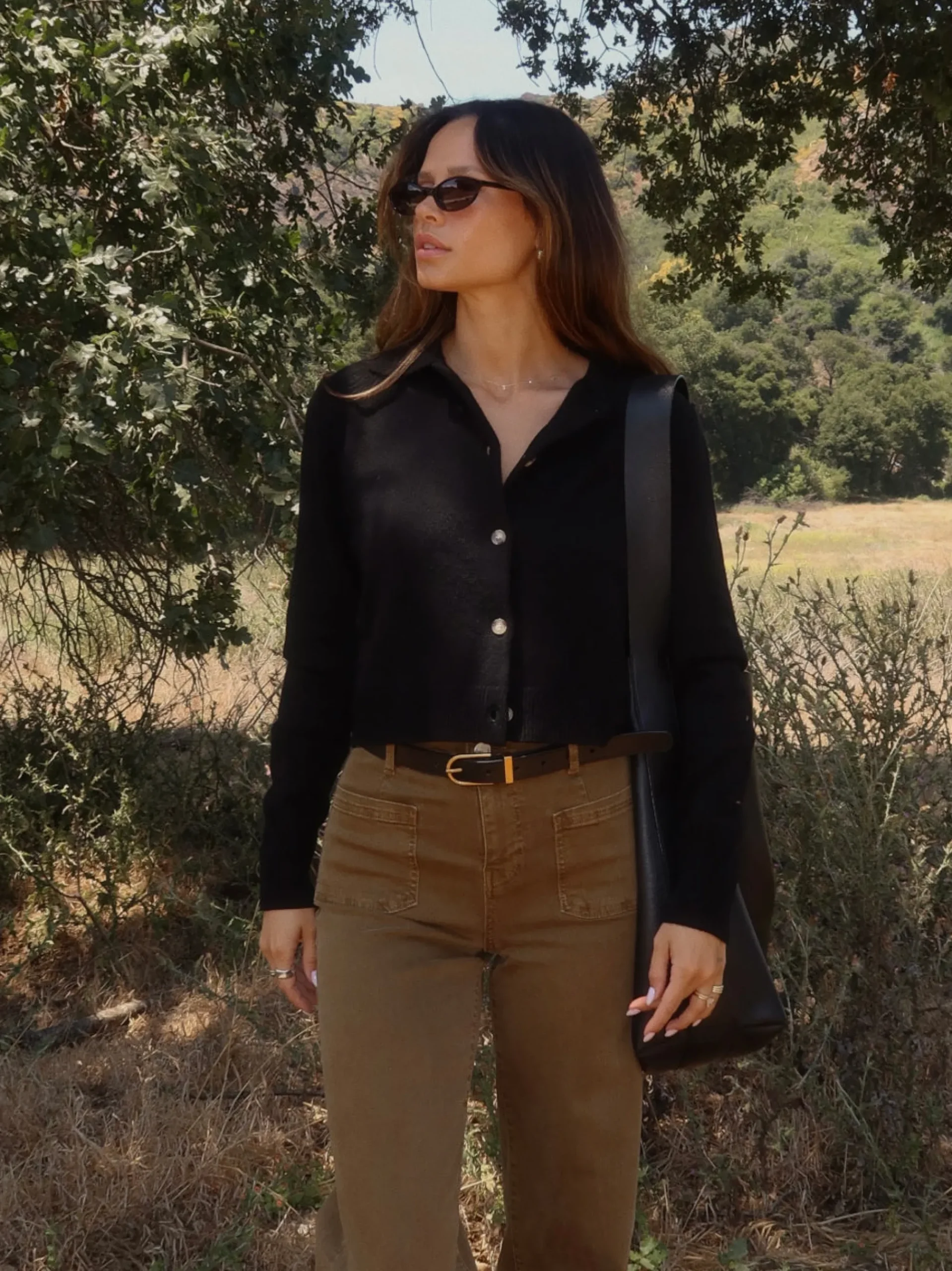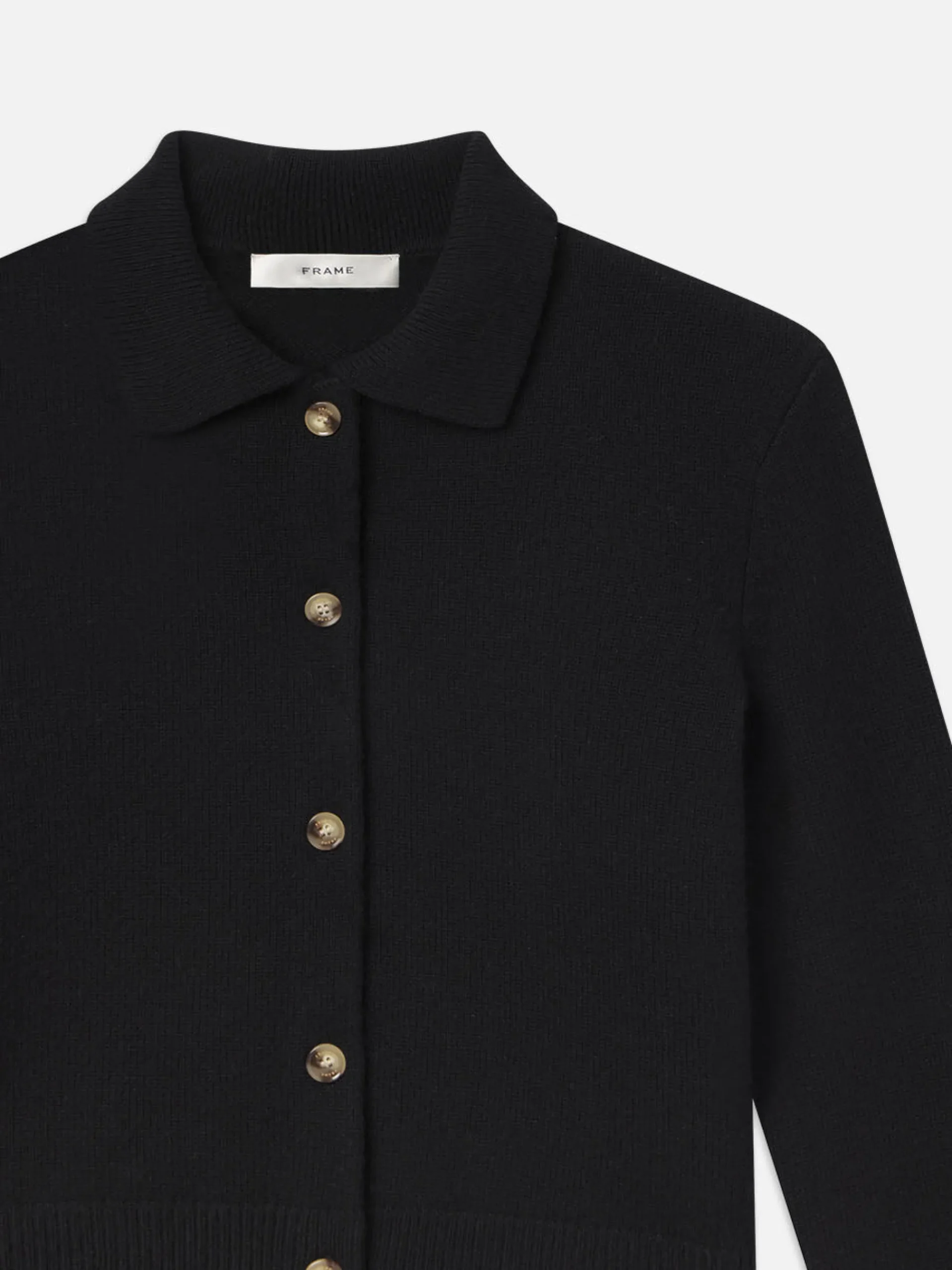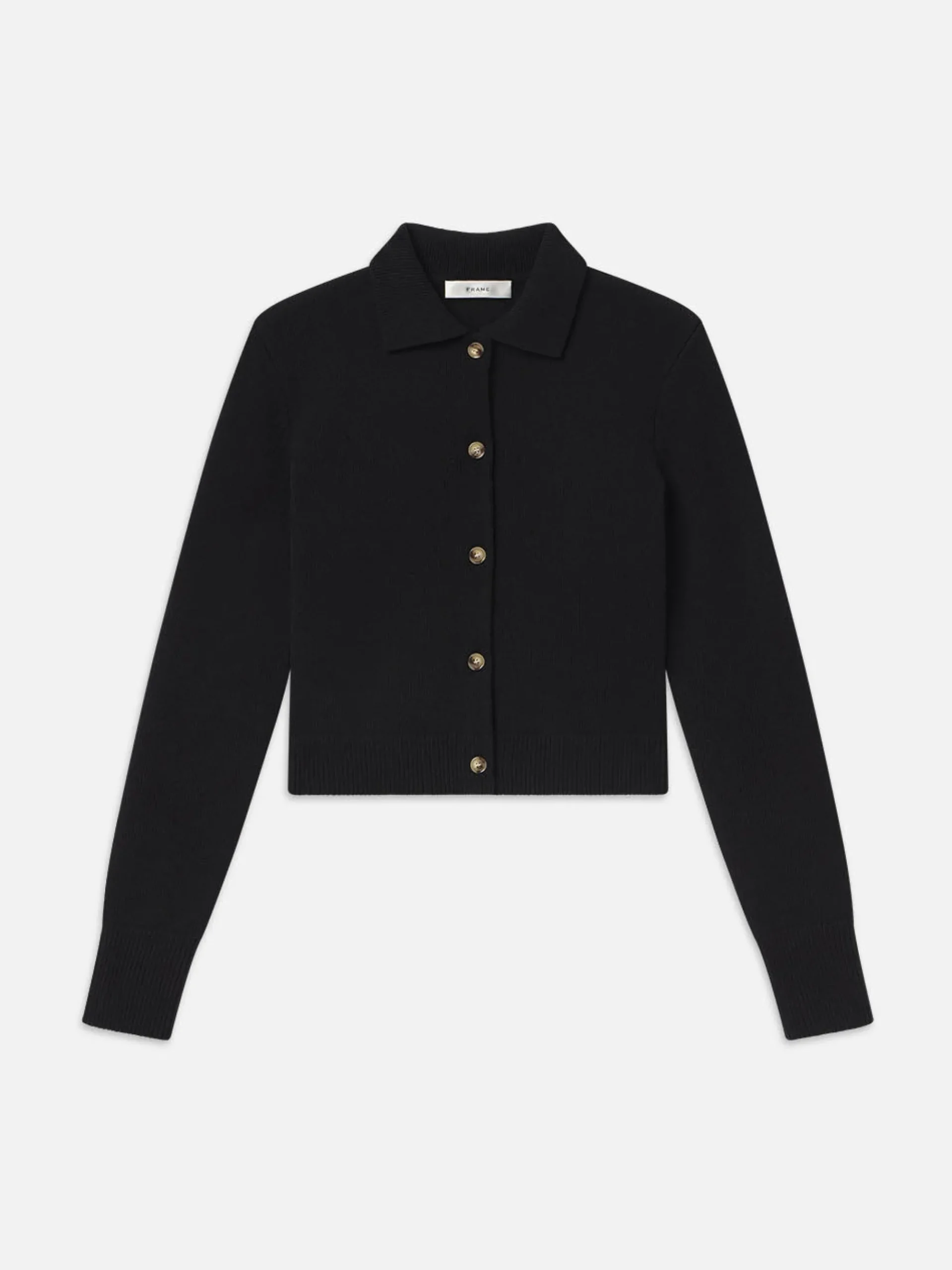 A cropped long sleeve cardi with exposed button closure, pointed collar, and ribbing at the sleeves and waist. This shrunken button-down cardigan is designed in a delicate cashmere.