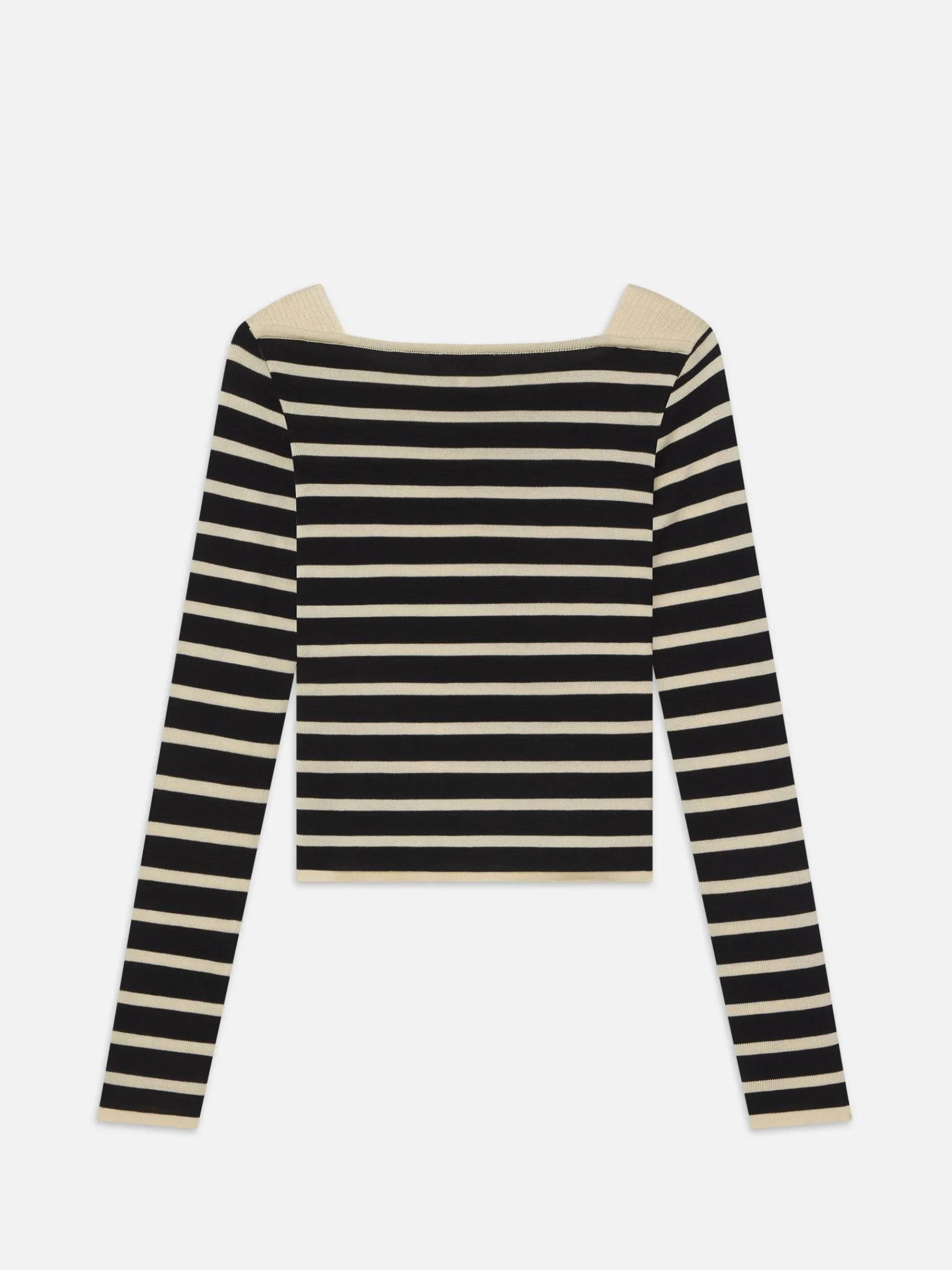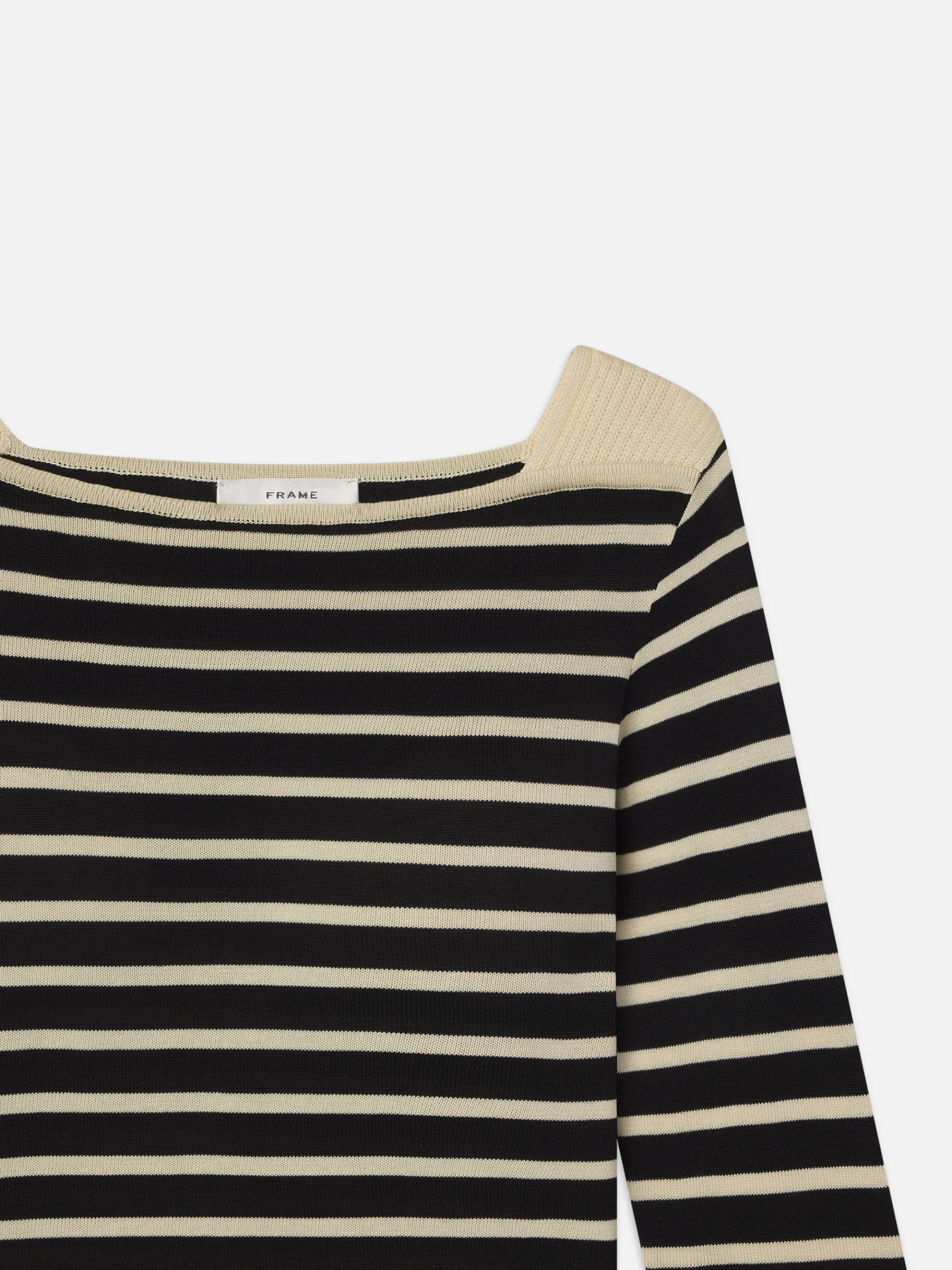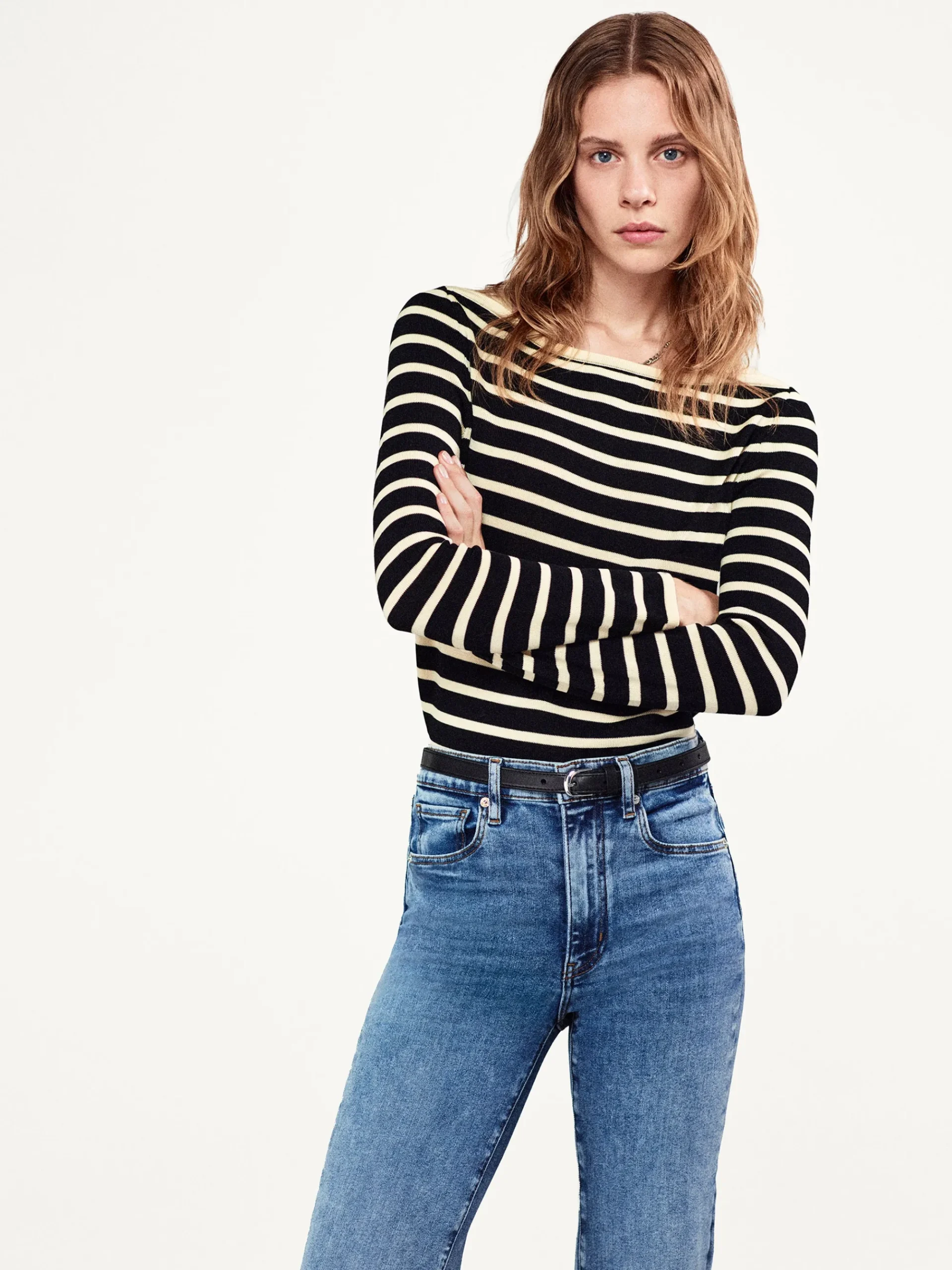 Mariner stripes and a chic boatneck give this sweater a polished look that elevates day-off outfitting. Featuring a slim-cut fit, this sweater re-envisions classic Breton stripes in Noir and Off White, for an edgier take on the original.