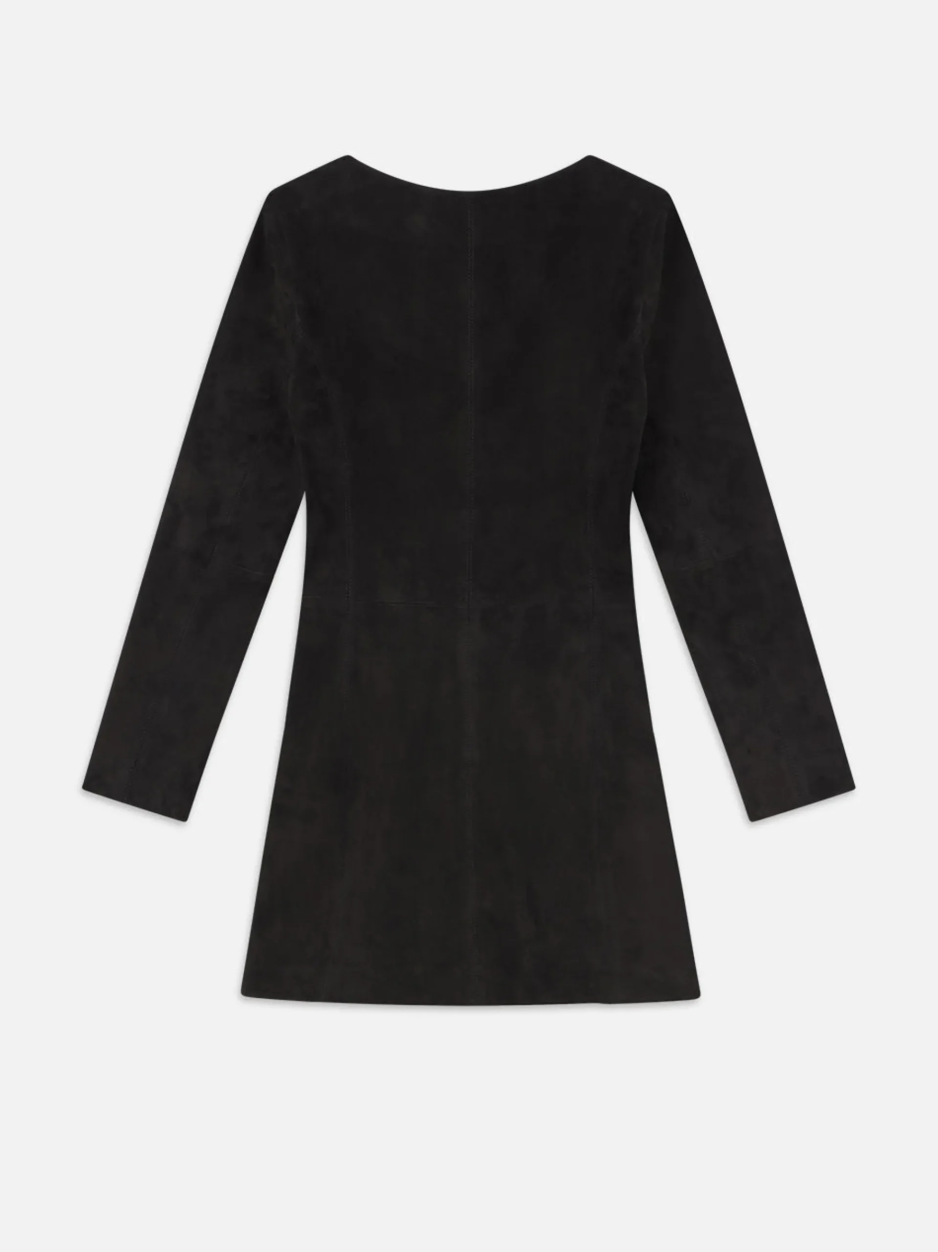 The ultimate LBD crafted from 100% suede, this long sleeve mini dress features a subtle V-neckline, and self covered button front closure with flattering curved seam.