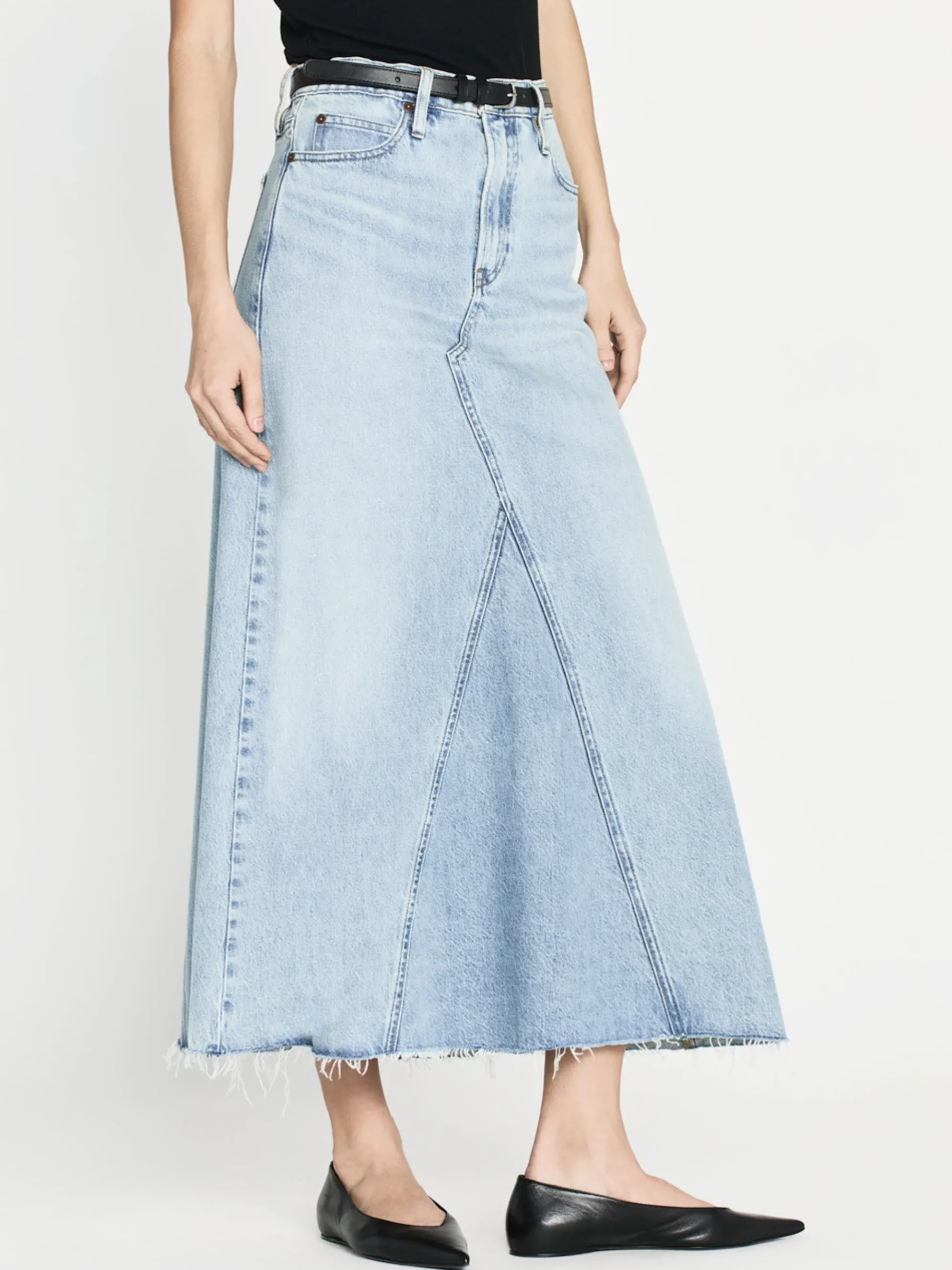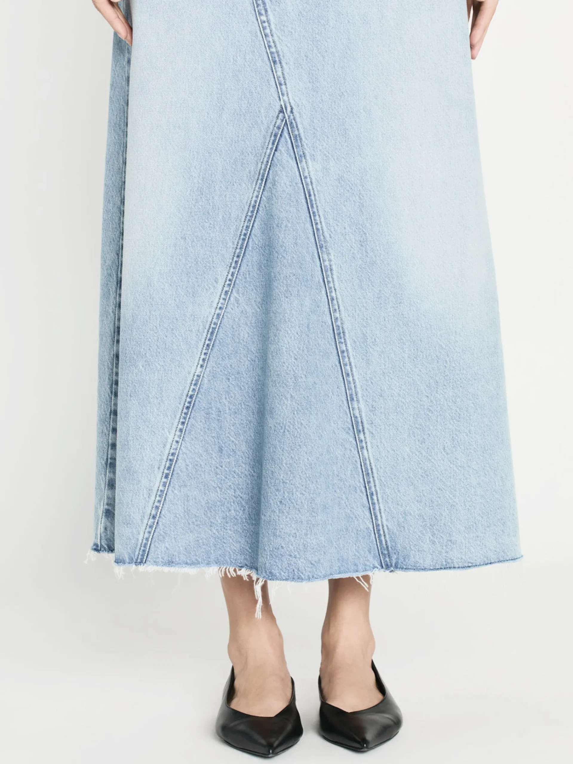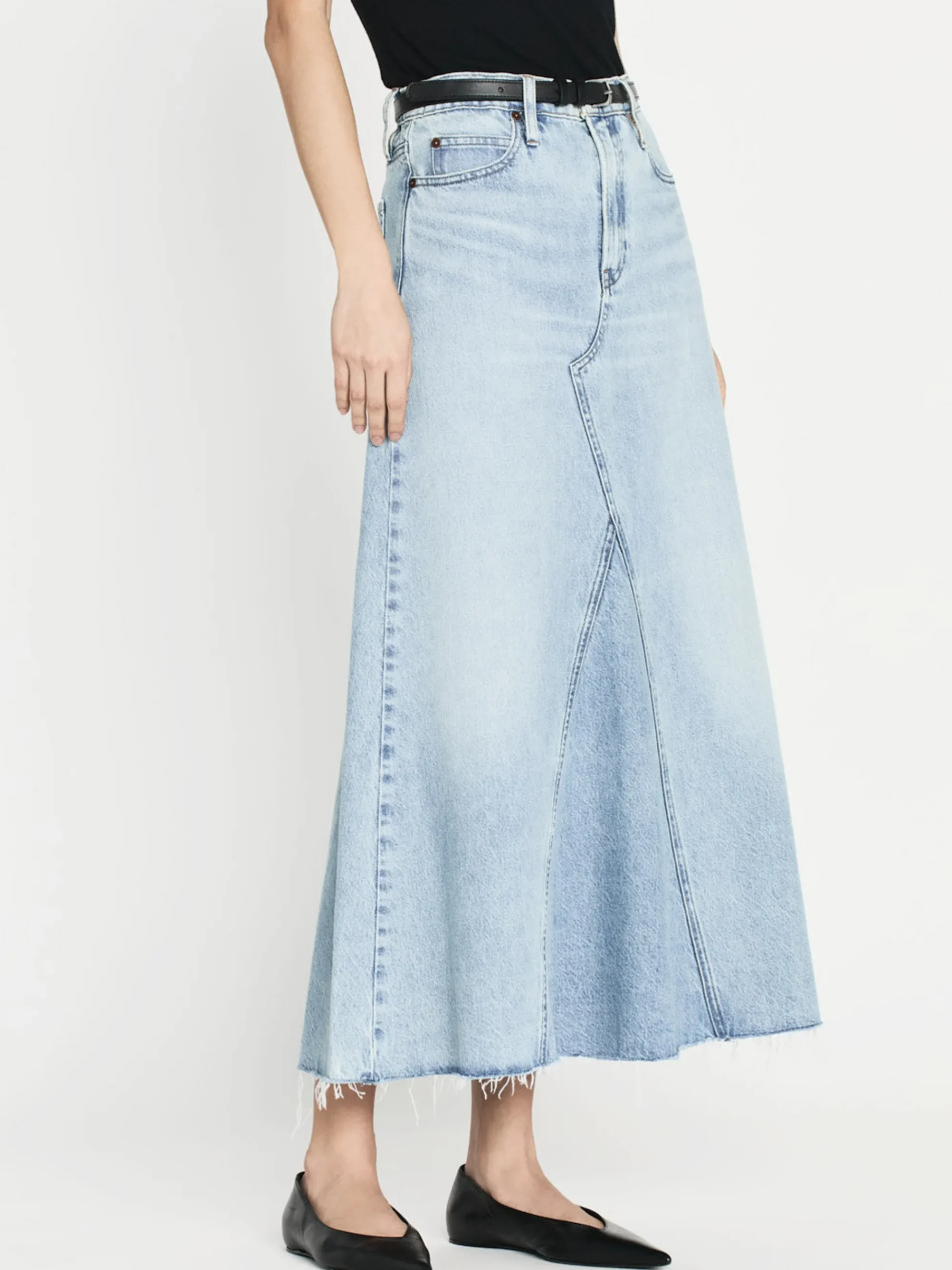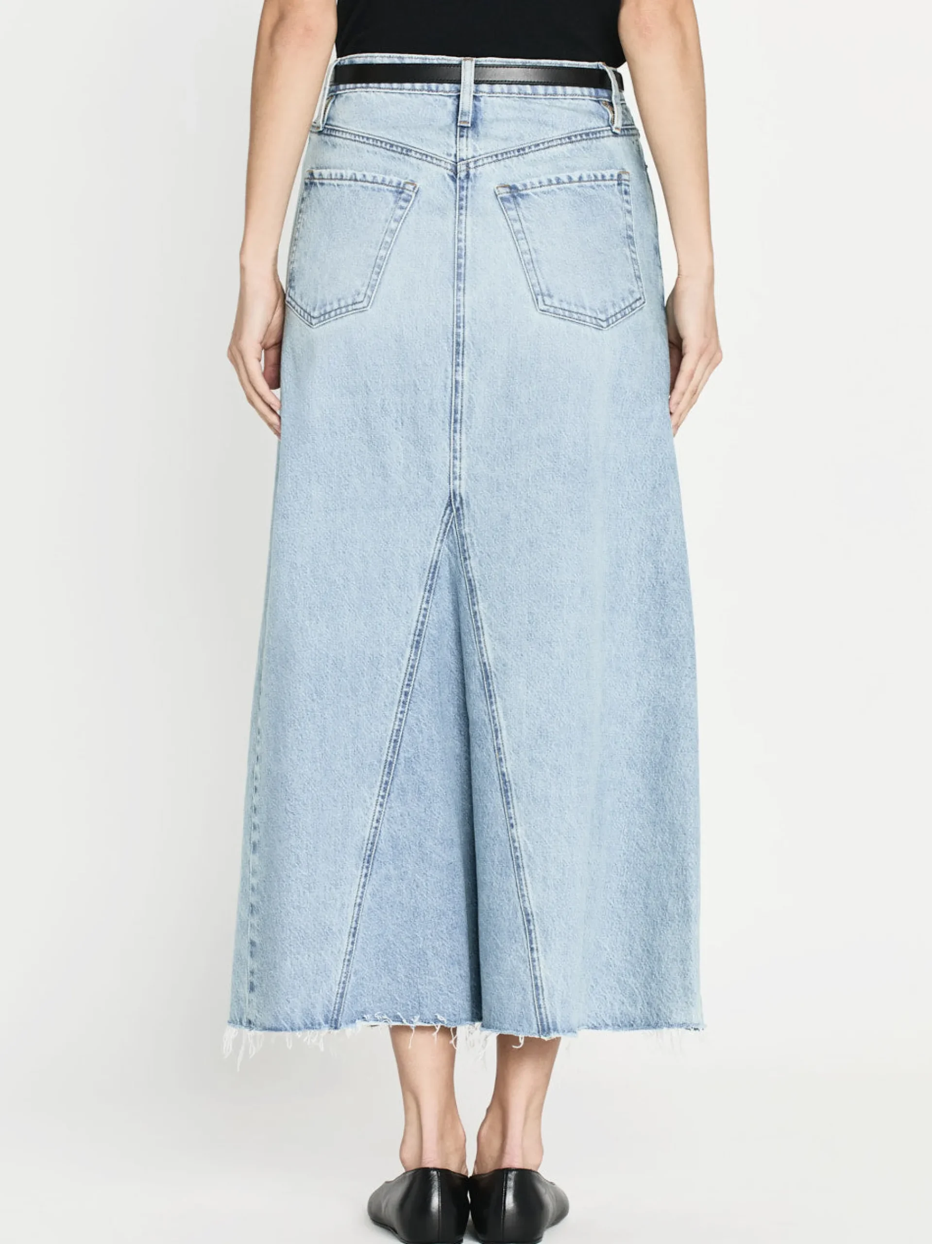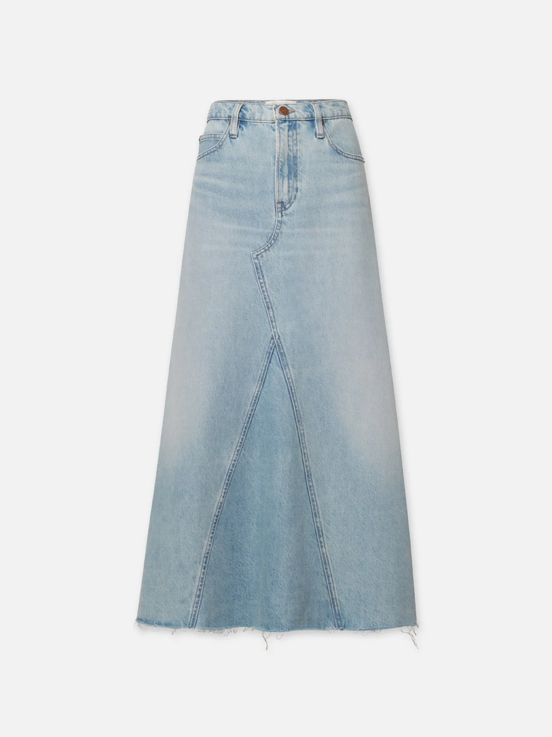 Giving the illusion of a jean that’s been reconstructed into a skirt—this high-rise maxi features an angled seam at the front and back with a frayed hem for a true vintage look. It’s crafted from a FRAME sustainable denim made with recycled materials.