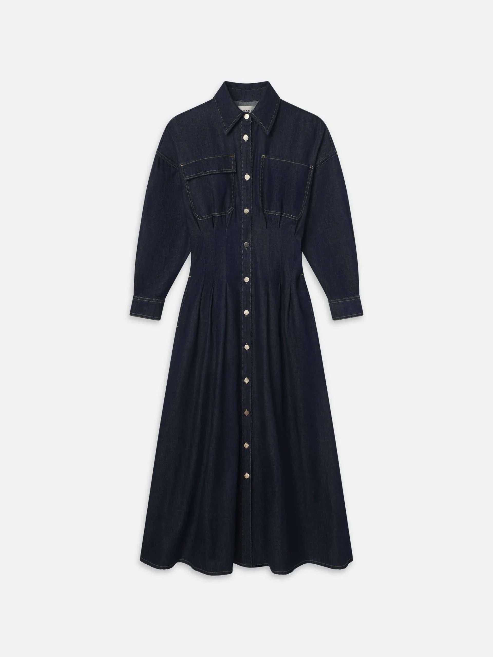 This maxi dress takes denim tailoring to new heights with carefully-placed pintucks through the bodice. The result is an effortless hourglass silhouette reinforced by rigid denim, asymmetric pockets, and a cleverly concealed zipper through the waist to prevent gaping.