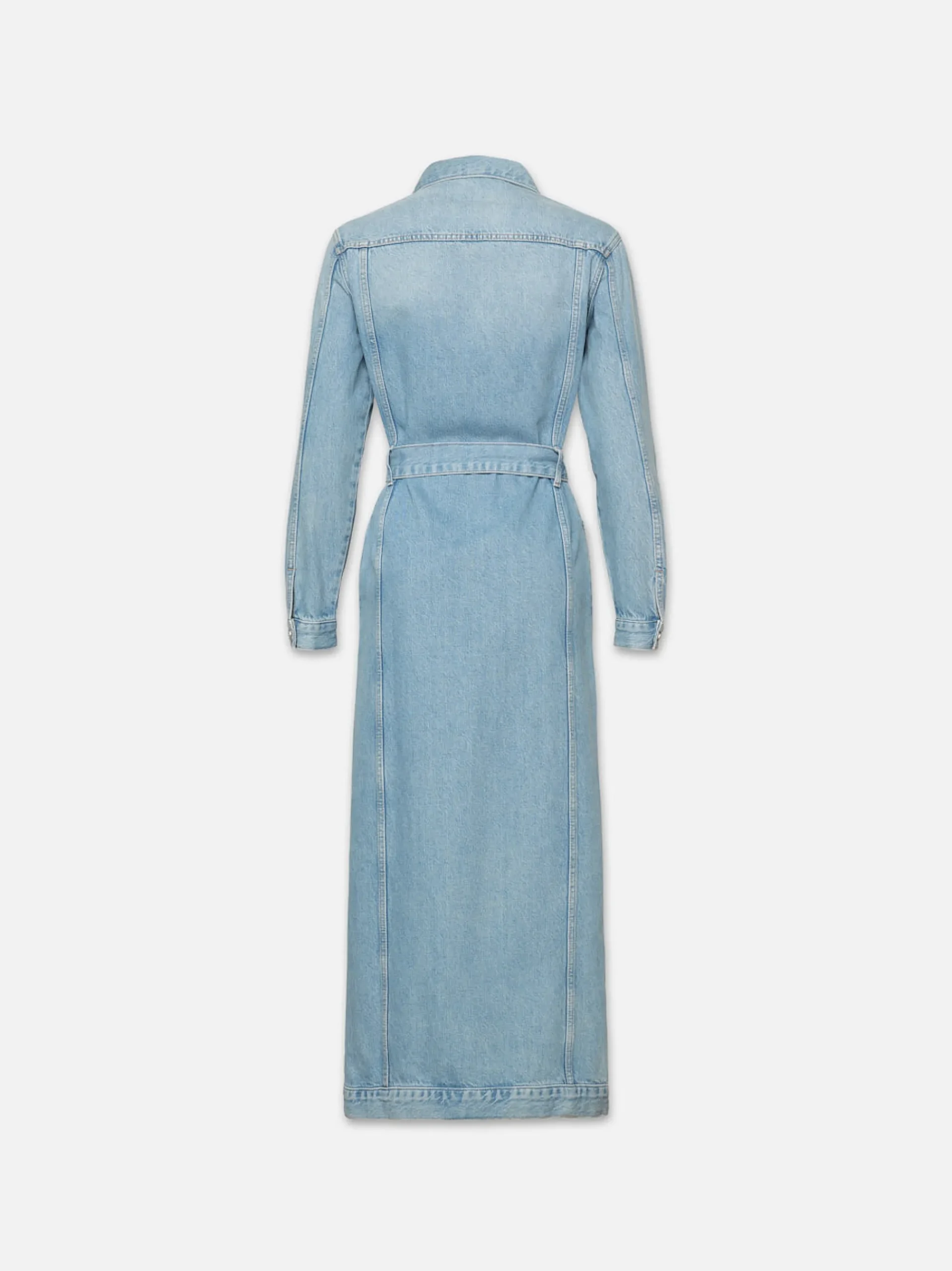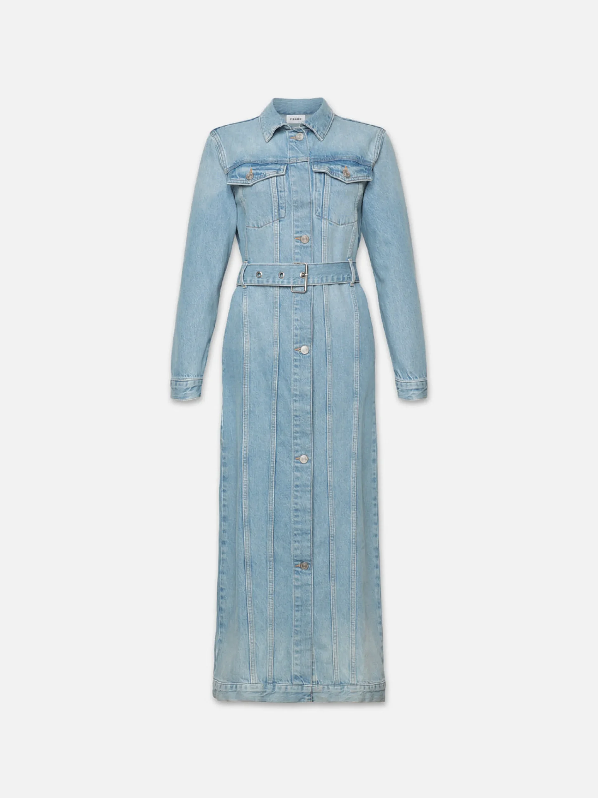 Inspired by the classic trucker jacket, this long, ankle-length style is a true statement piece. Among the design details are a belted waist, chest pockets and silver hardware. The rigid fabric and light indigo wash make it an ideal warm-weather layer.