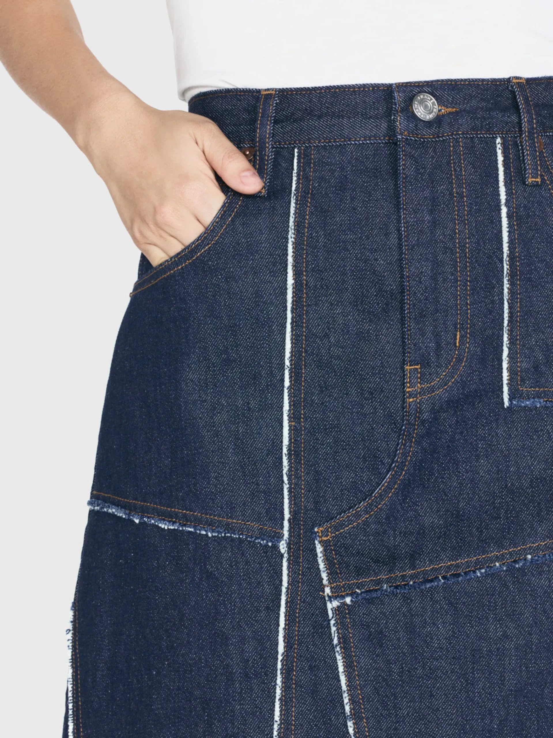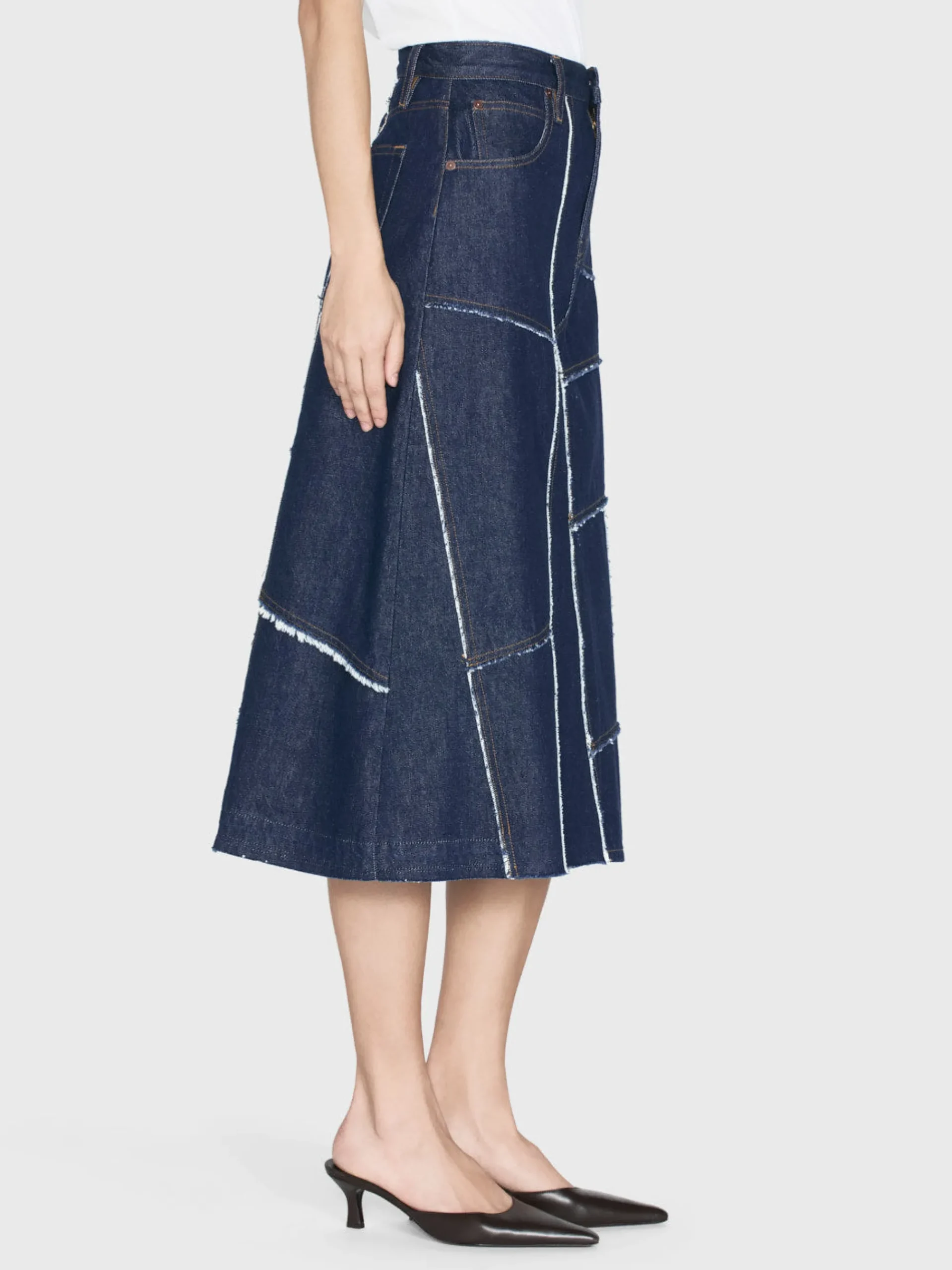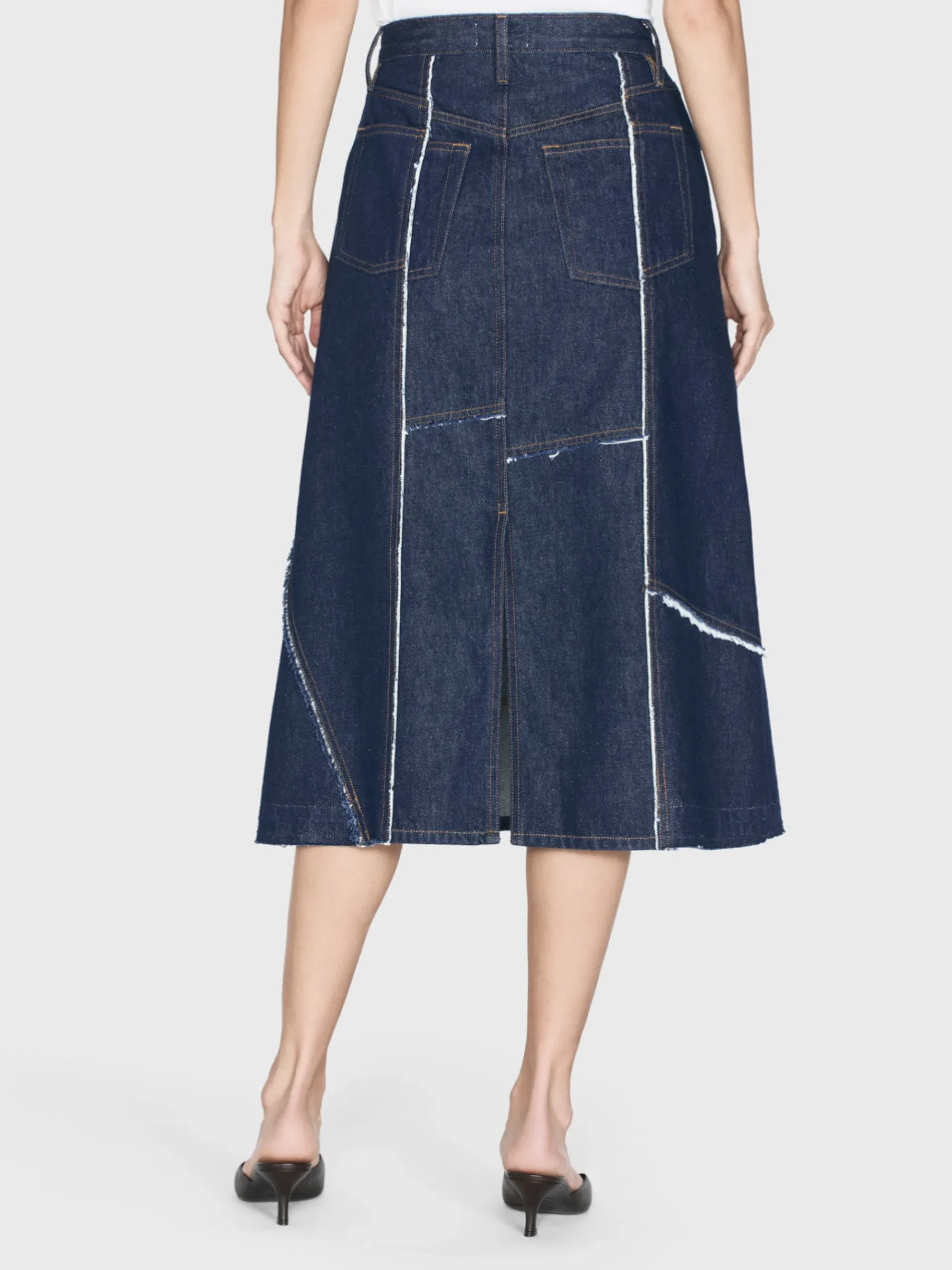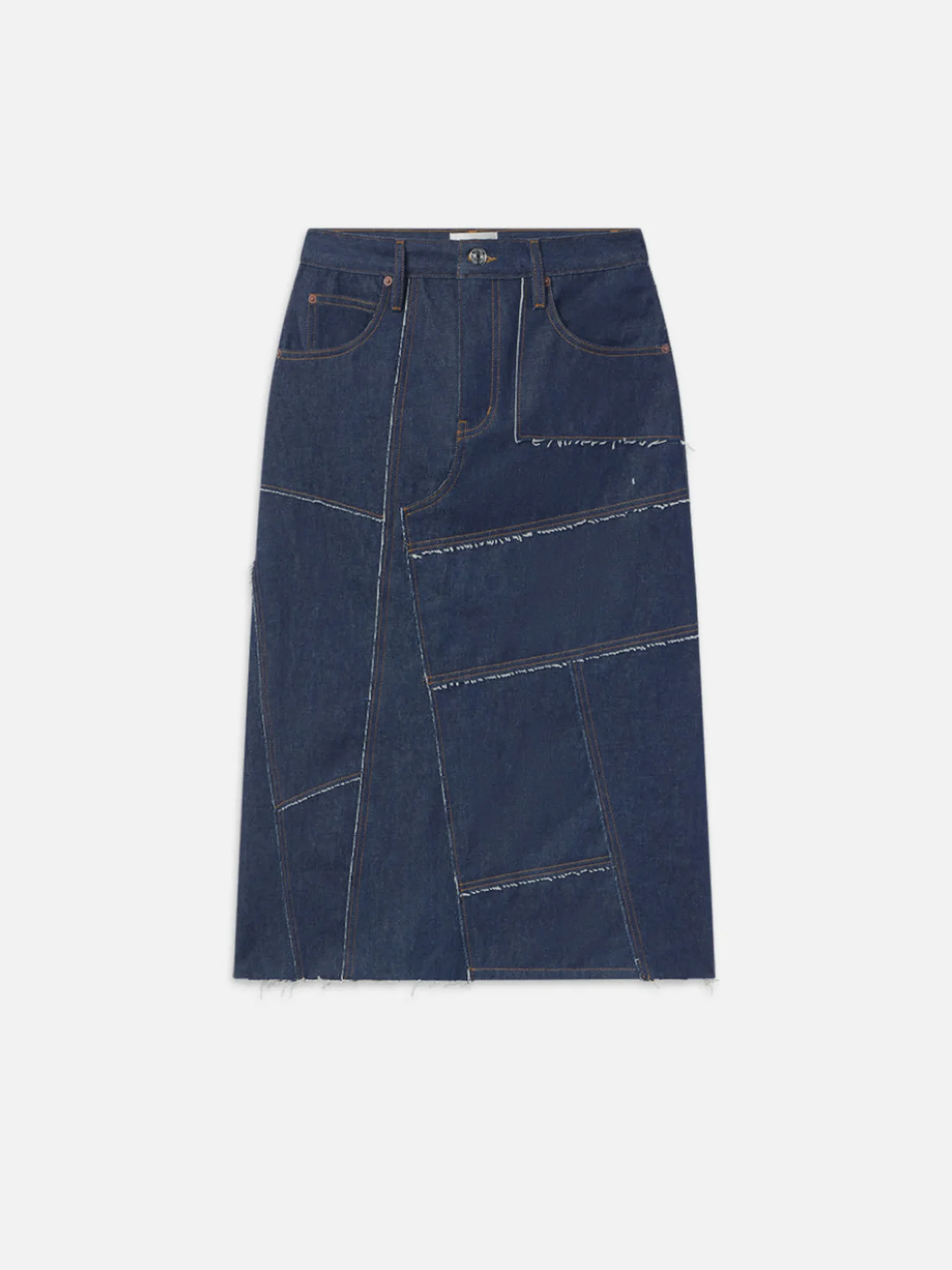 This patchwork skirt adds unexpected intrigue to the trending denim midi. Crafted from a recycled, rigid denim fabrication, each skirt is thoughtfully made by combining asymmetrical pieces for a unique reconstructed design.