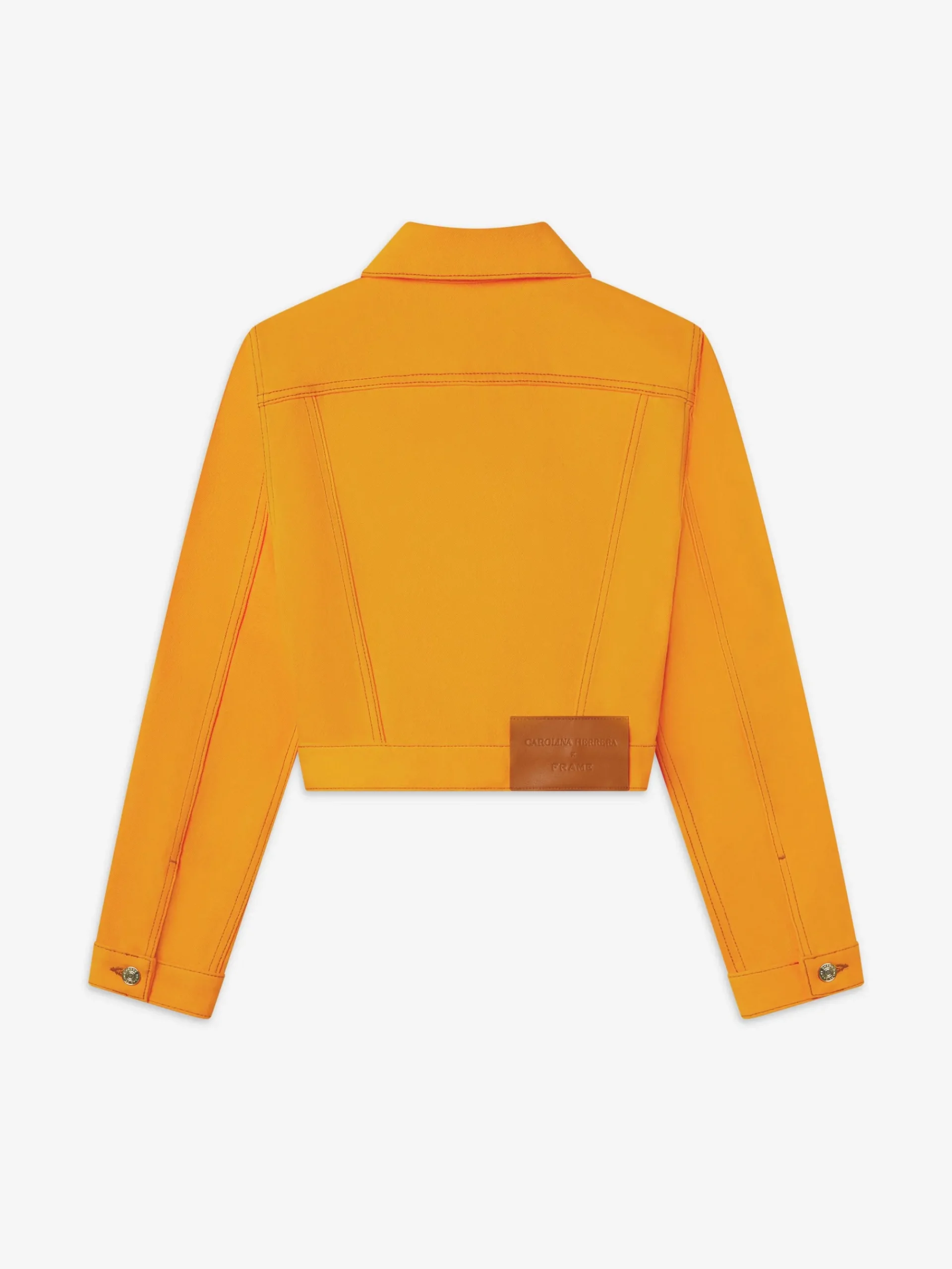 A piece from the Carolina Herrera x FRAME collab, The Tailored Denim Jacket blends ready-to-wear and denim in more ways than one. Yards of pure cotton are pre-dyed, then sewn into a shrunken silhouette for a polished fit and vivid, saturated color. Complete with a custom leather patch.