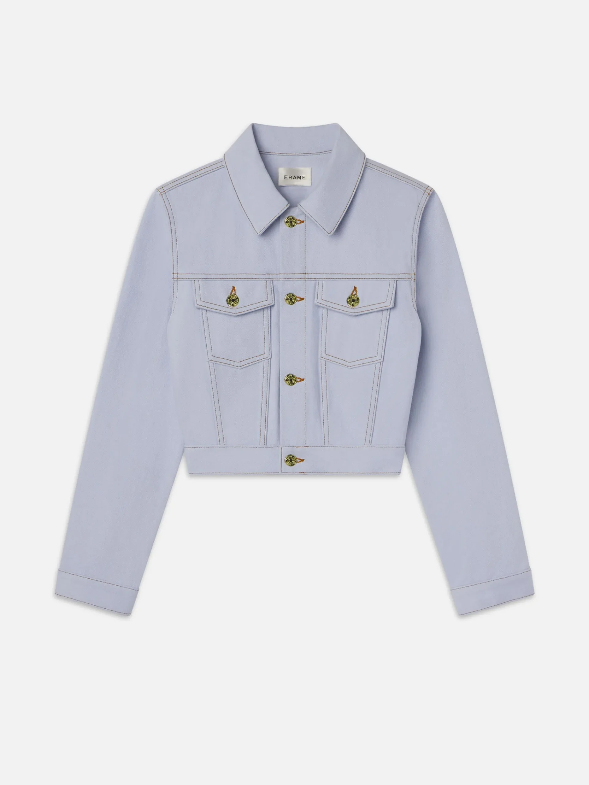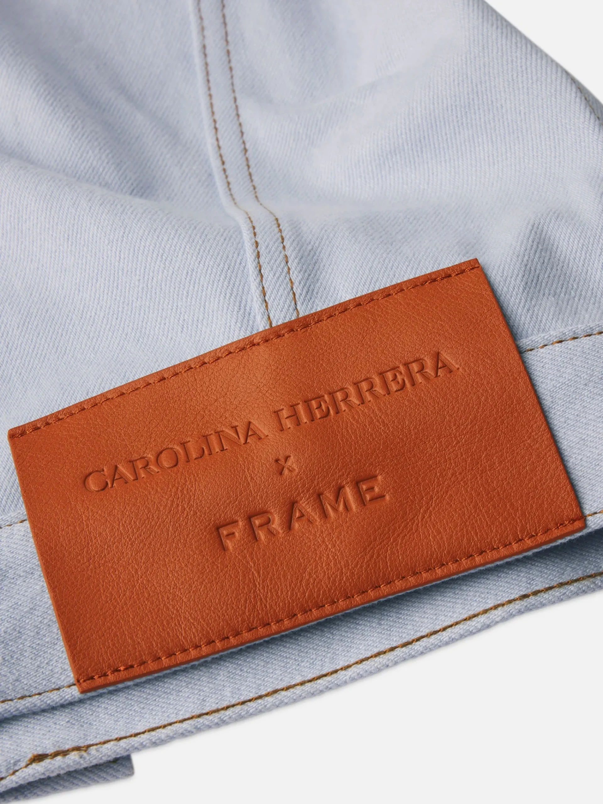 A piece from the Carolina Herrera x FRAME collab, The Tailored Denim Jacket blends ready-to-wear and denim in more ways than one. Yards of pure cotton are pre-dyed, then sewn into a shrunken silhouette for a polished fit and vivid, saturated color. Complete with a custom leather patch.