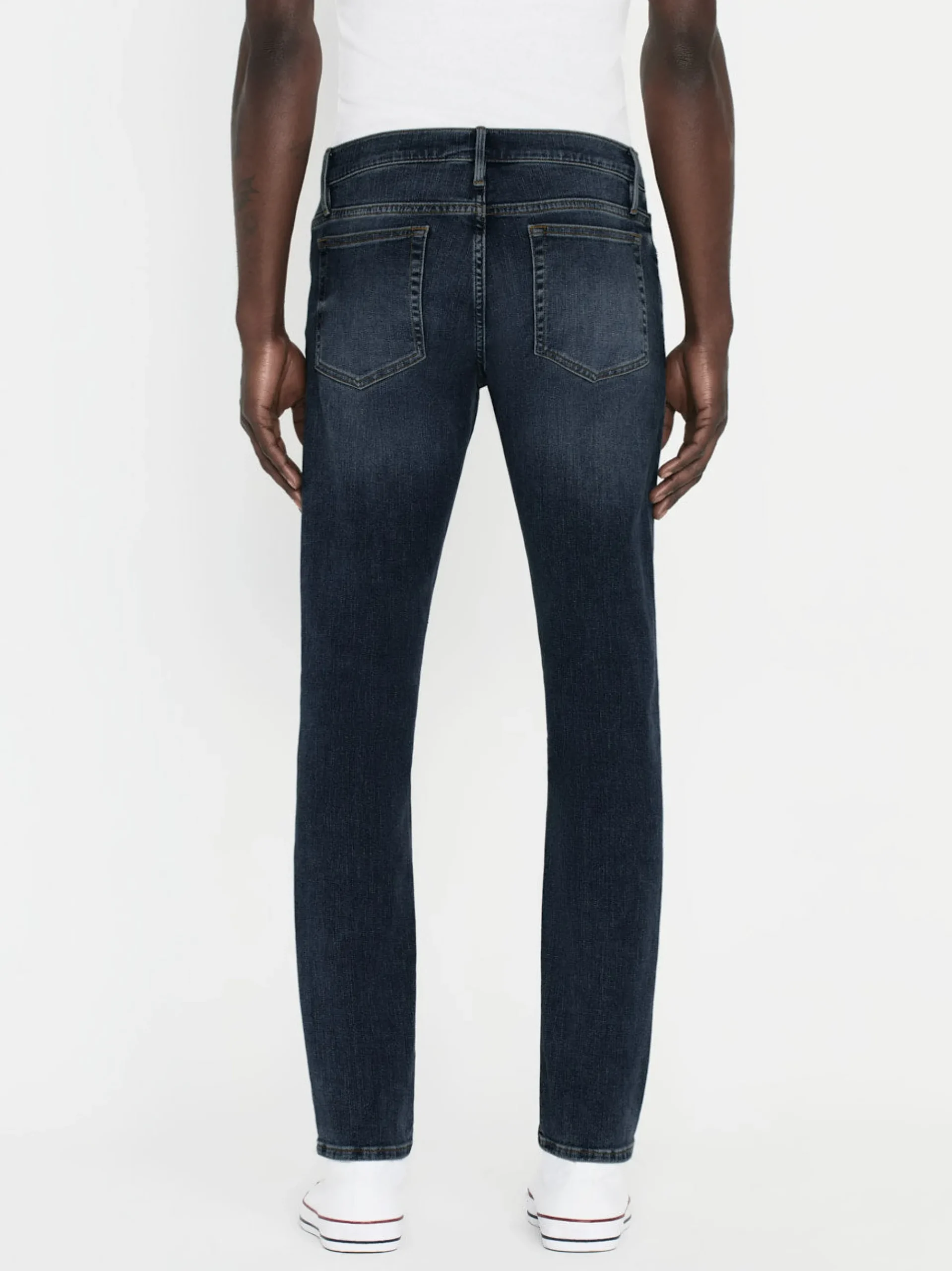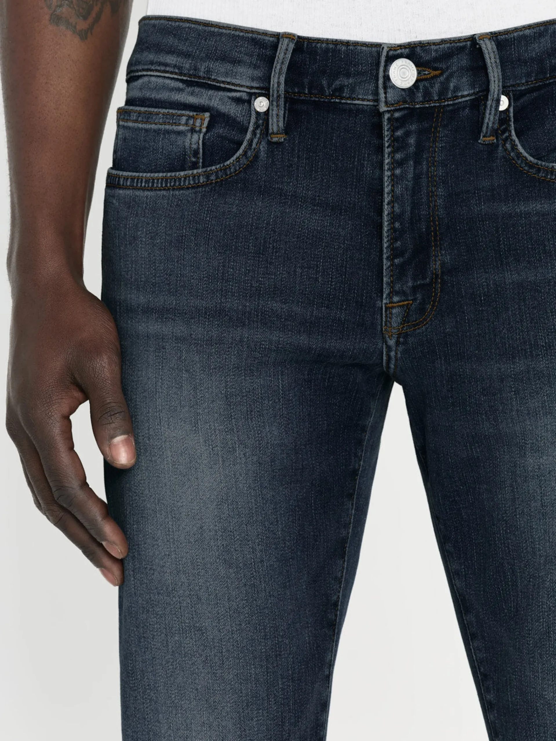 A FRAME signature jean, this style is designed with a classic 5-pocket construction, comfortable mid rise, flattering straight leg, and tapered slim fit at the leg opening. Crafted from smooth super stretch denim.