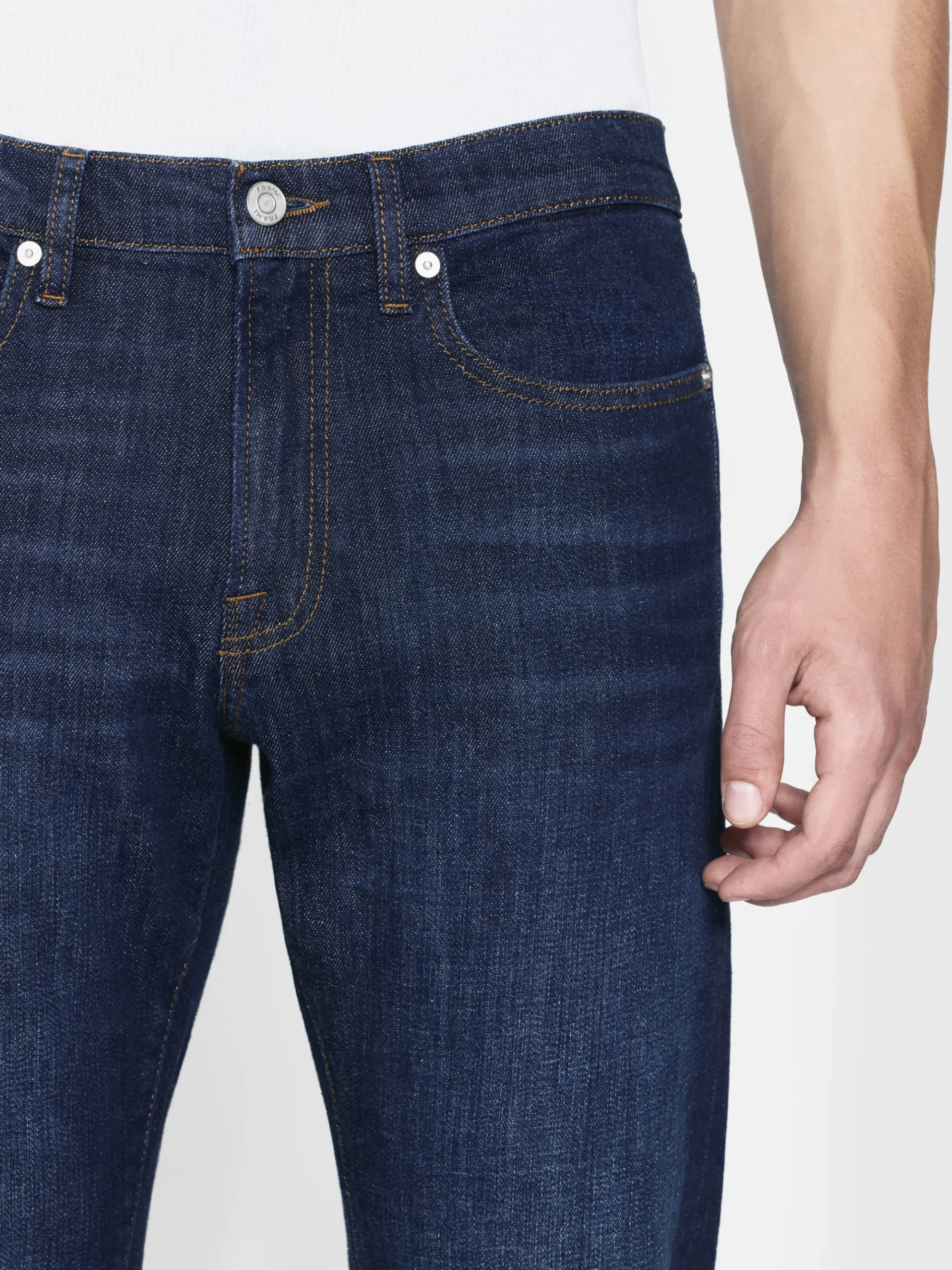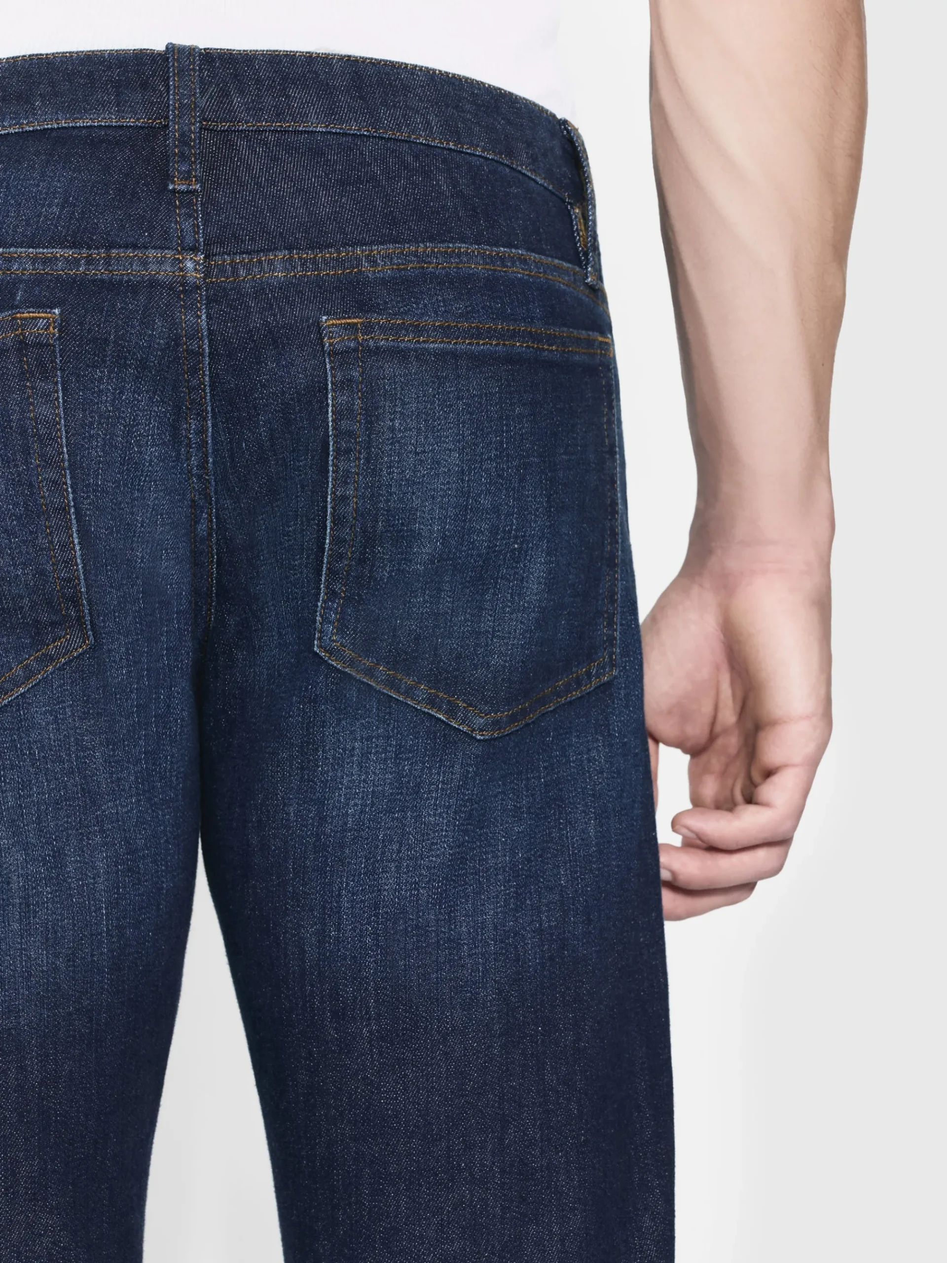 The signature slim straight leg cut from premium denim in a dark blue wash. Classic 5-pocket construction, standard mid rise waist and slim straight leg with slight tapering to the cuff.