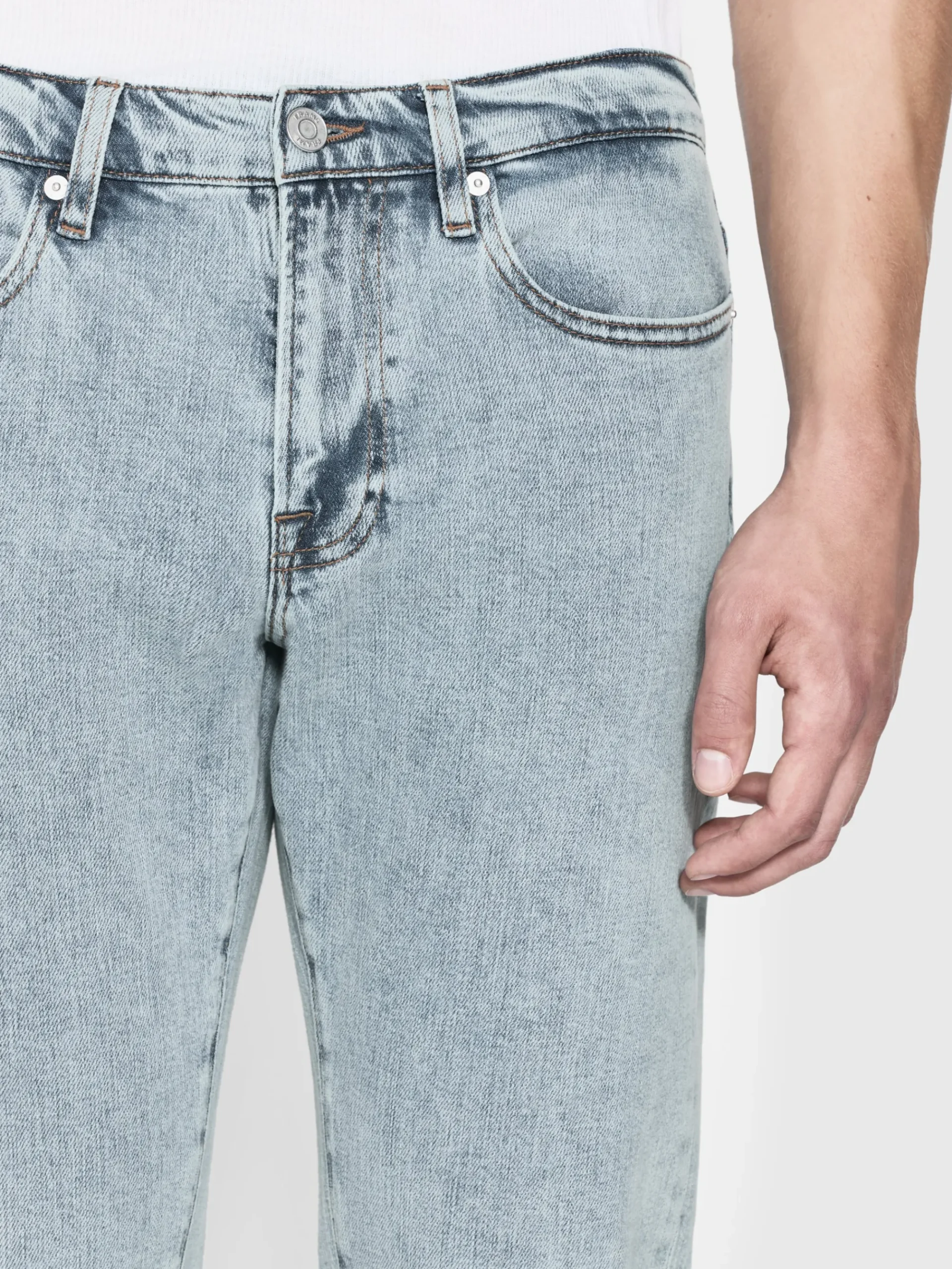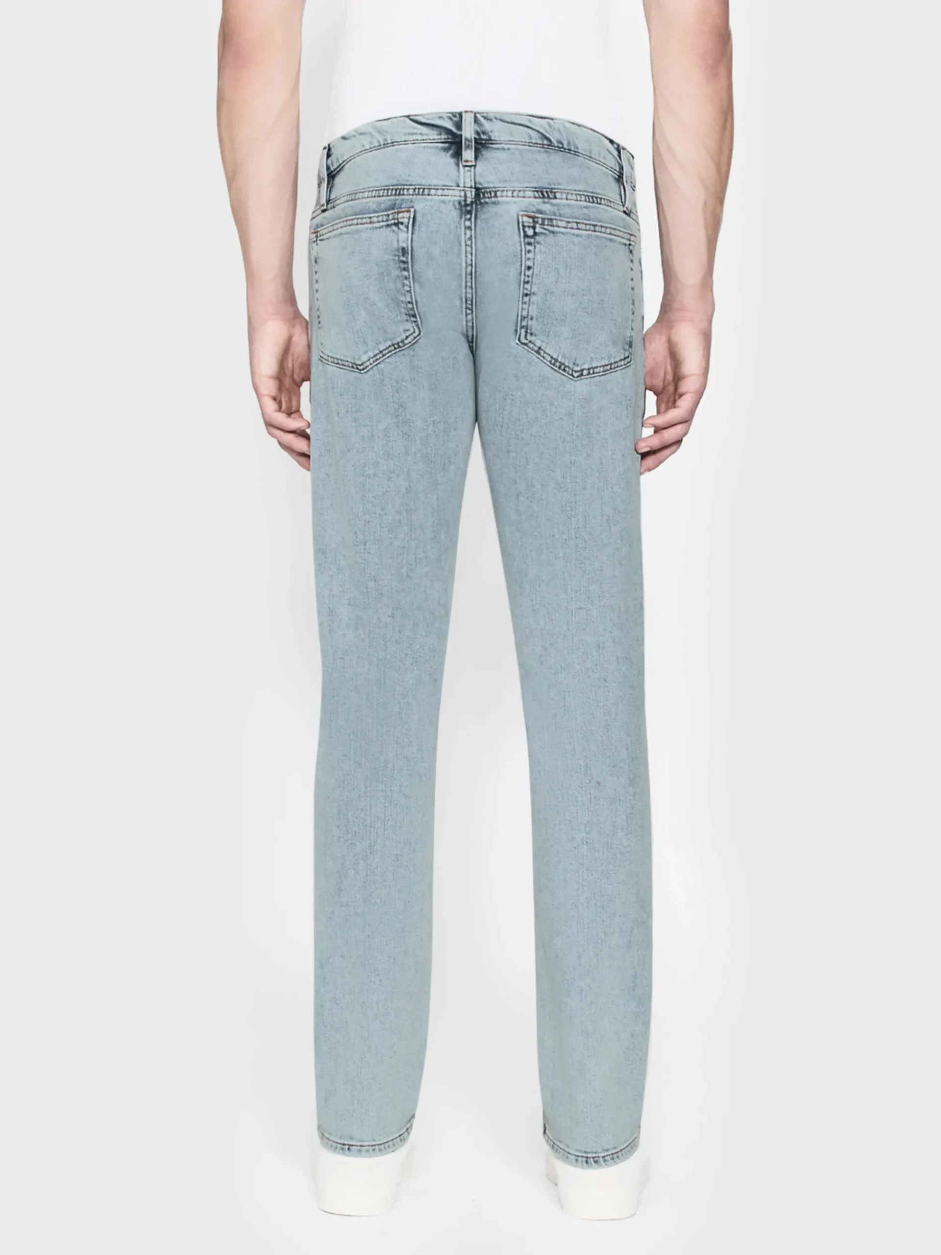 A FRAME signature jean, this style is designed with a classic 5-pocket construction, comfortable mid rise, flattering straight leg, and tapered slim fit at the leg opening. Crafted from smooth, comfort-stretch denim in a light blue wash.