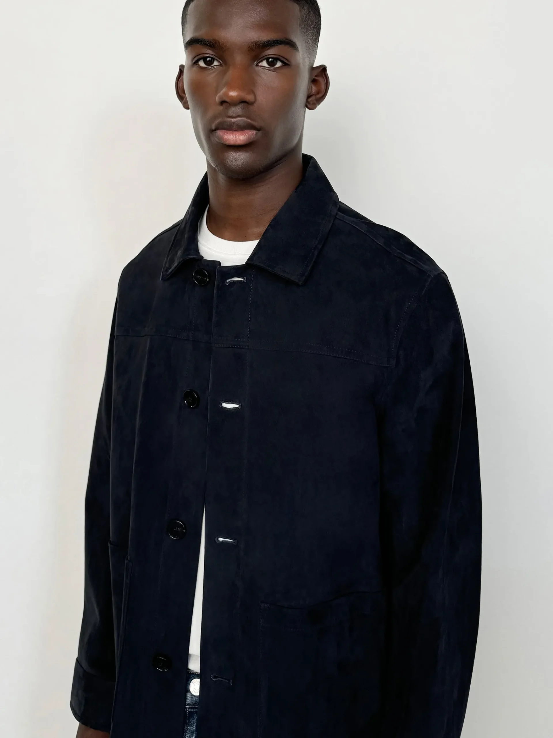 FRAME Unlined Suede Chore Coat in Dark Navy