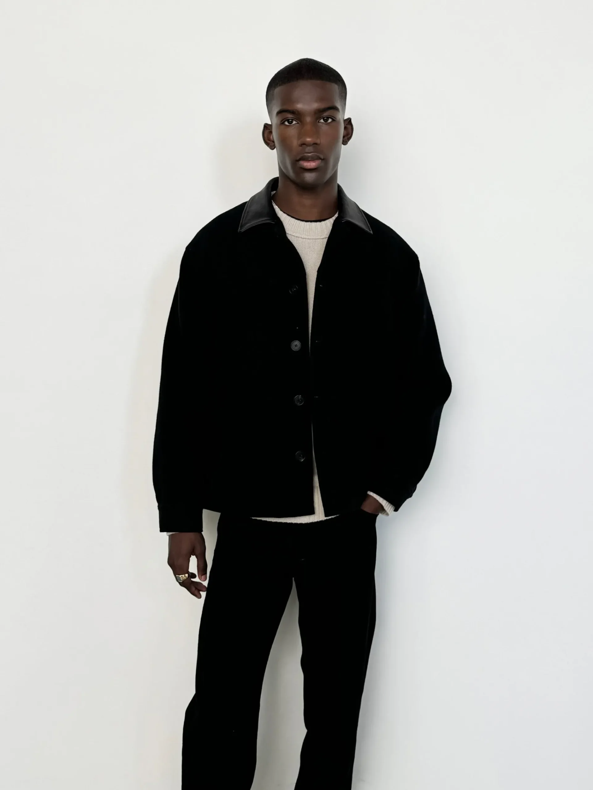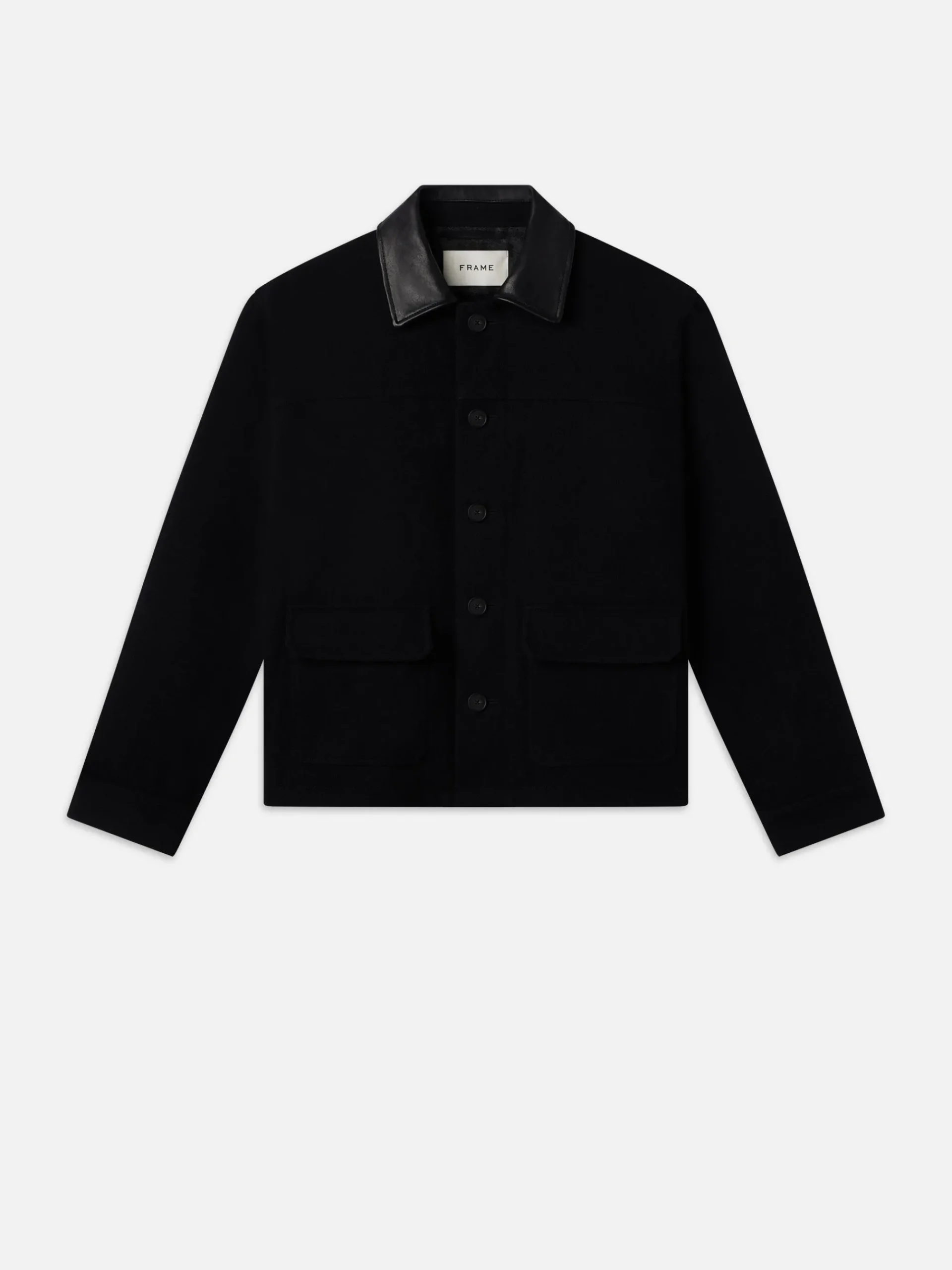 Adopt workwear’s durability and wearability with this luxe wool-blend design. The dark, inky black hue stays consistent with tone-on-tone buttons and waist flap pockets. What it keeps in tone, it switches up in texture: Note the sleek leather collar for a subtle, supple contrast.