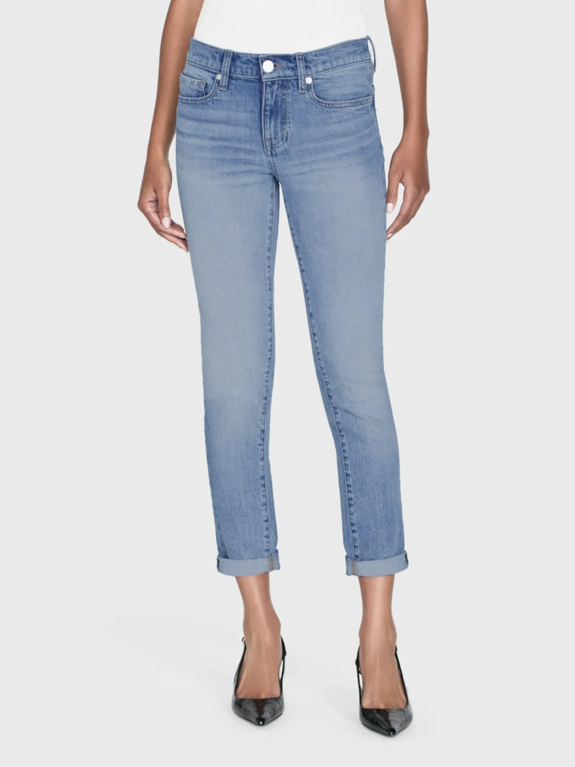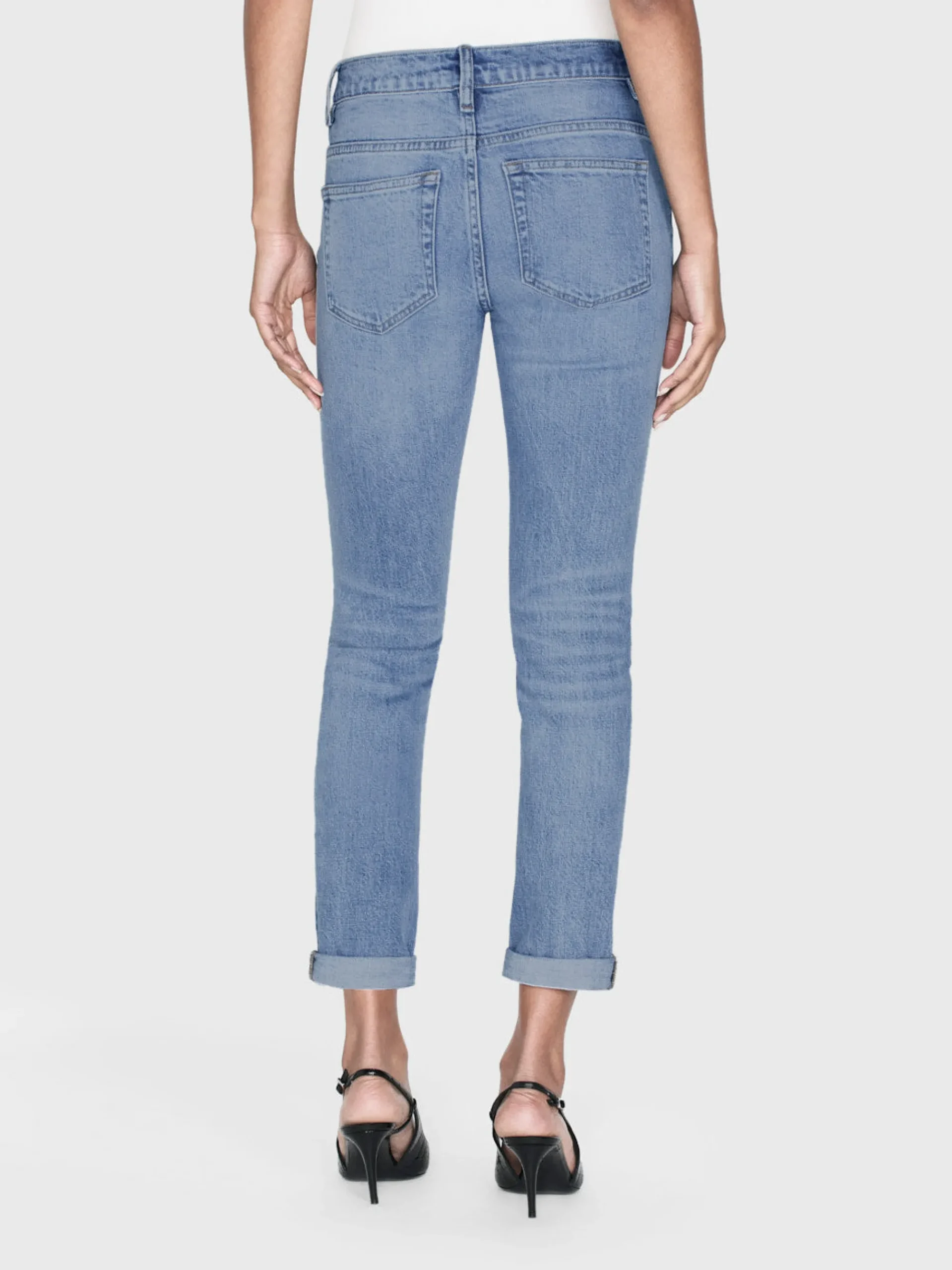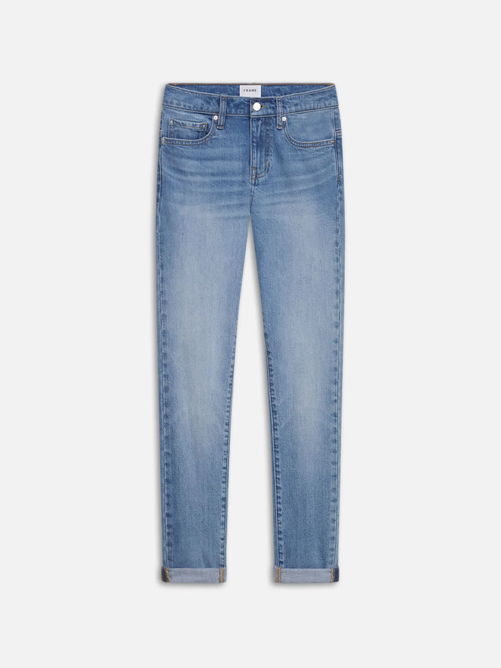 A FRAME classic, our mid-rise boyfriend fit is a relaxed take on the classic skinny jean. Crafted from comfort stretch denim, it has a rolled hem and a slightly higher rise in the back. Wear yours a bit oversized and slung from the hips with everything from a relaxed button-down to a fitted sweater.