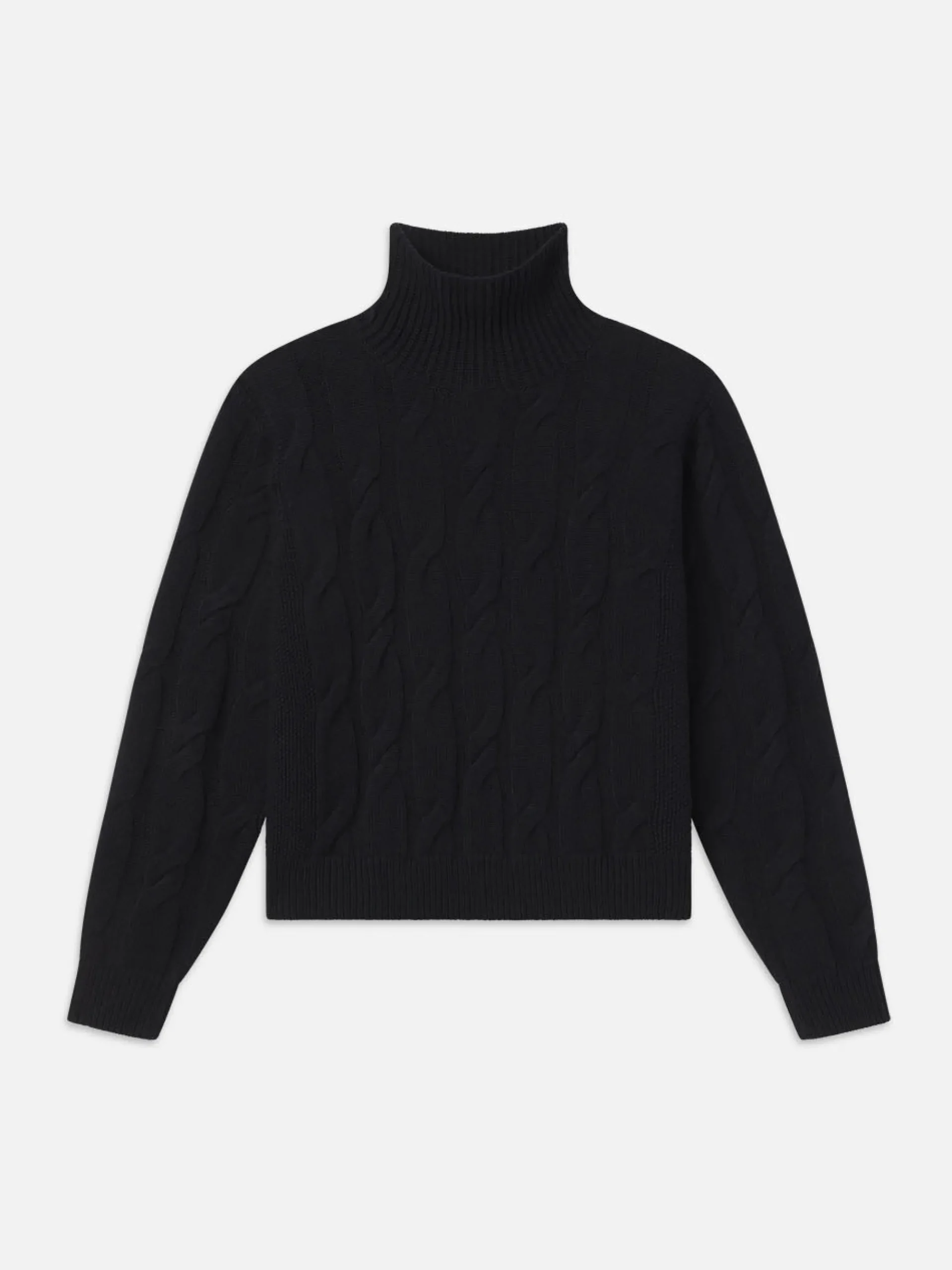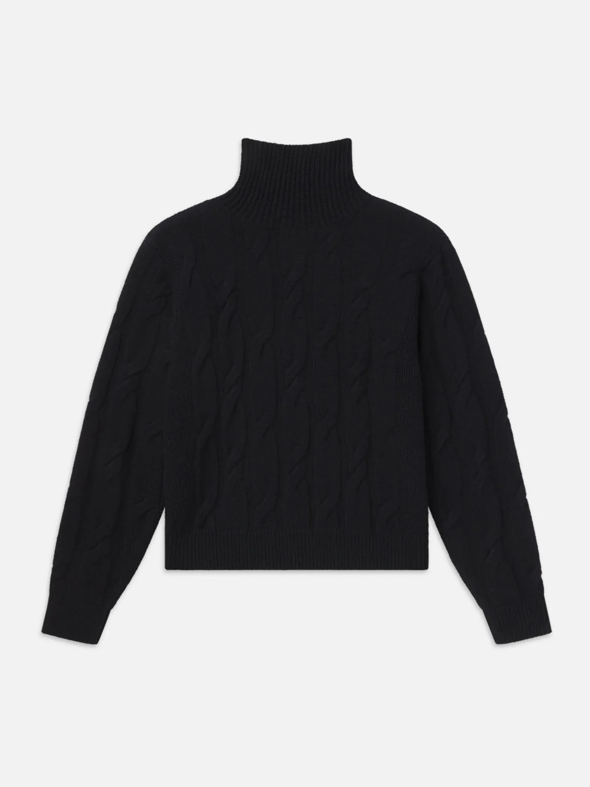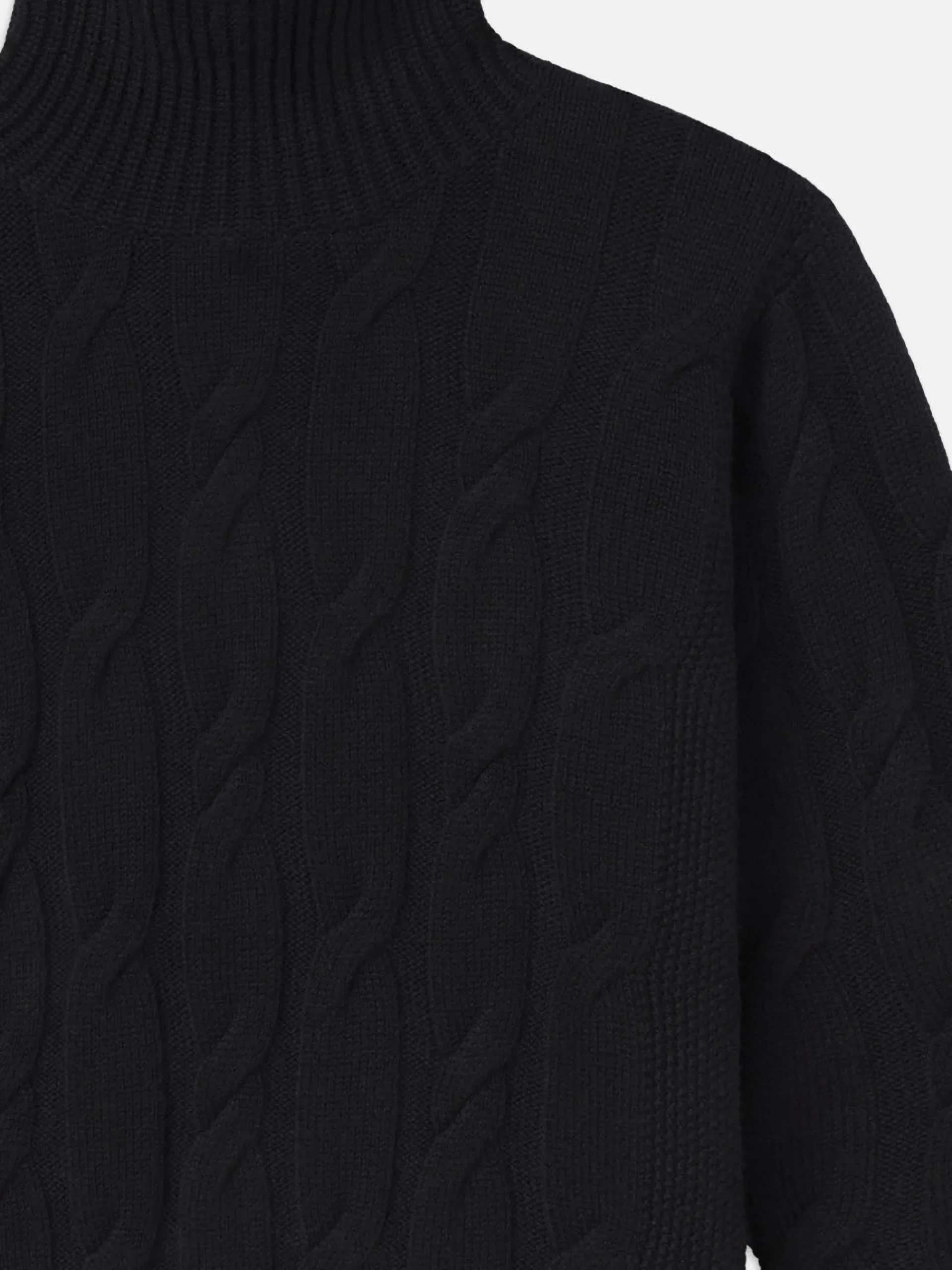Crafted from luxurious woolen cashmere blend, this cable knit sweater features a chic ribbed turtleneck, dropped shoulder, plus a classic ribbed cuff and hem.