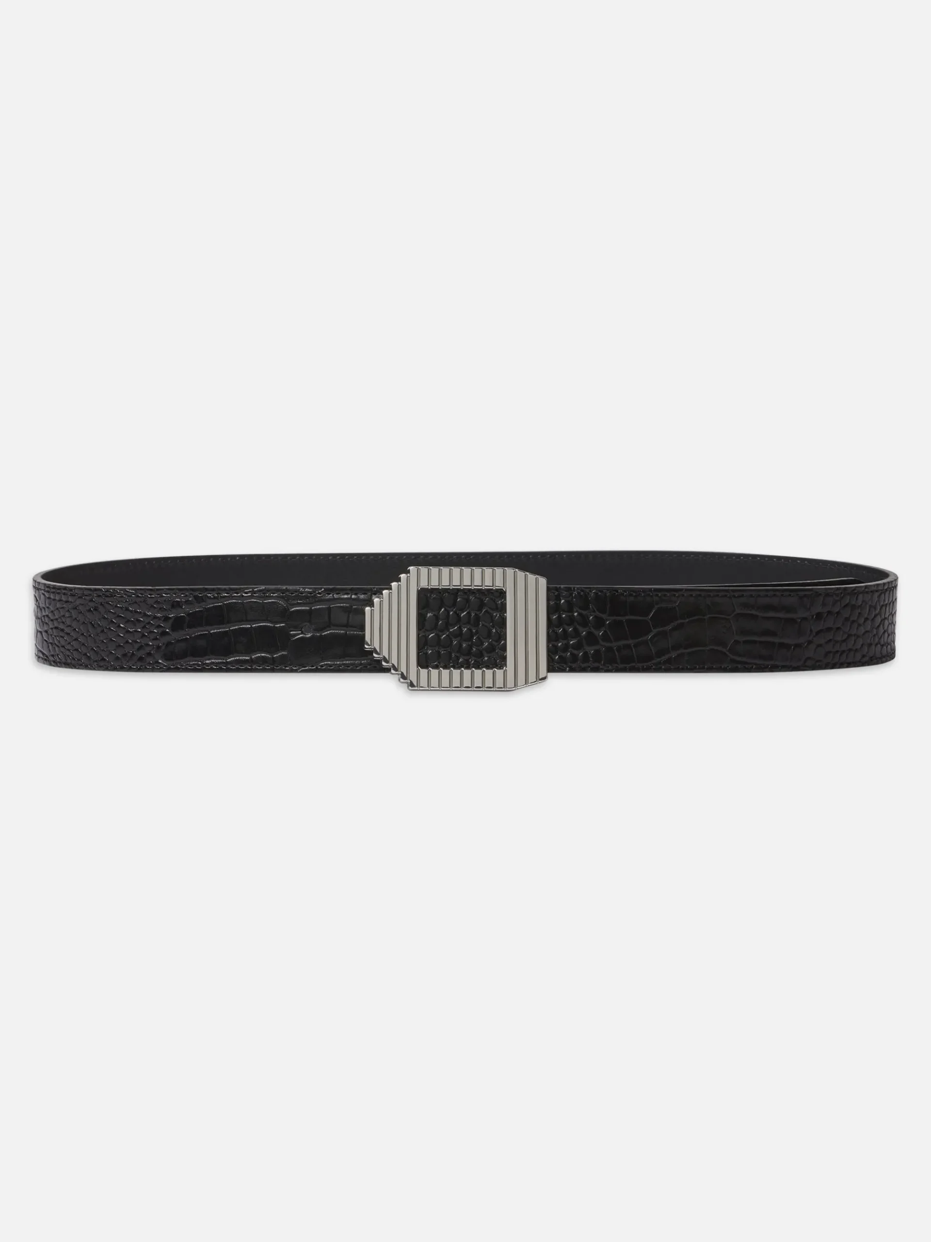 Your styling secret weapon, the Geometric Buckle Belt flaunts croc-embossed leather and a unique buckle with cascading ridges. The go-to accessory to cinch dresses and jeans alike.