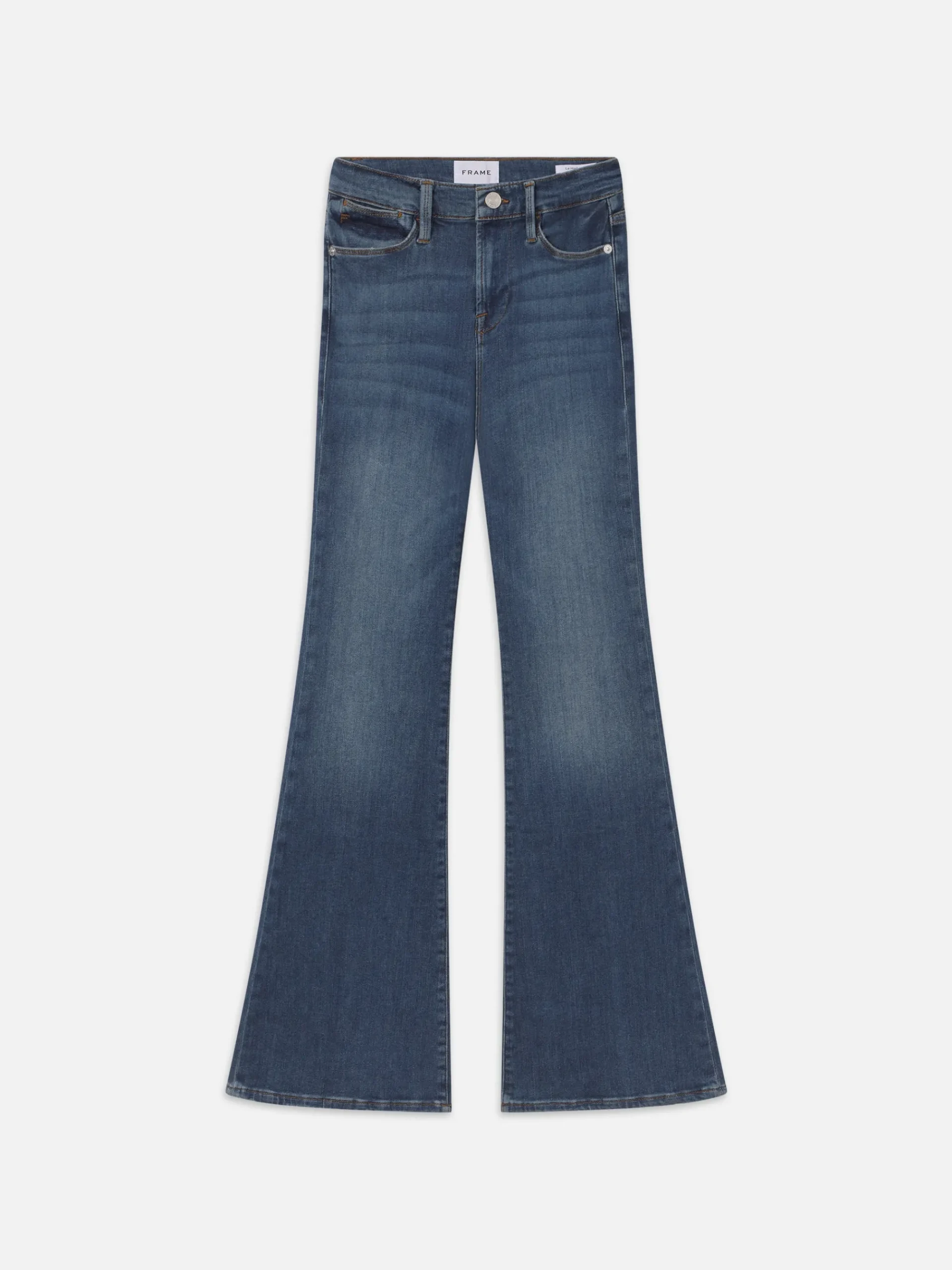 This high-rise jean puts a fresh spin on retro style with a form-fitting silhouette through the leg, generous flare from the knee and leg-lengthening 34.5″ inseam.