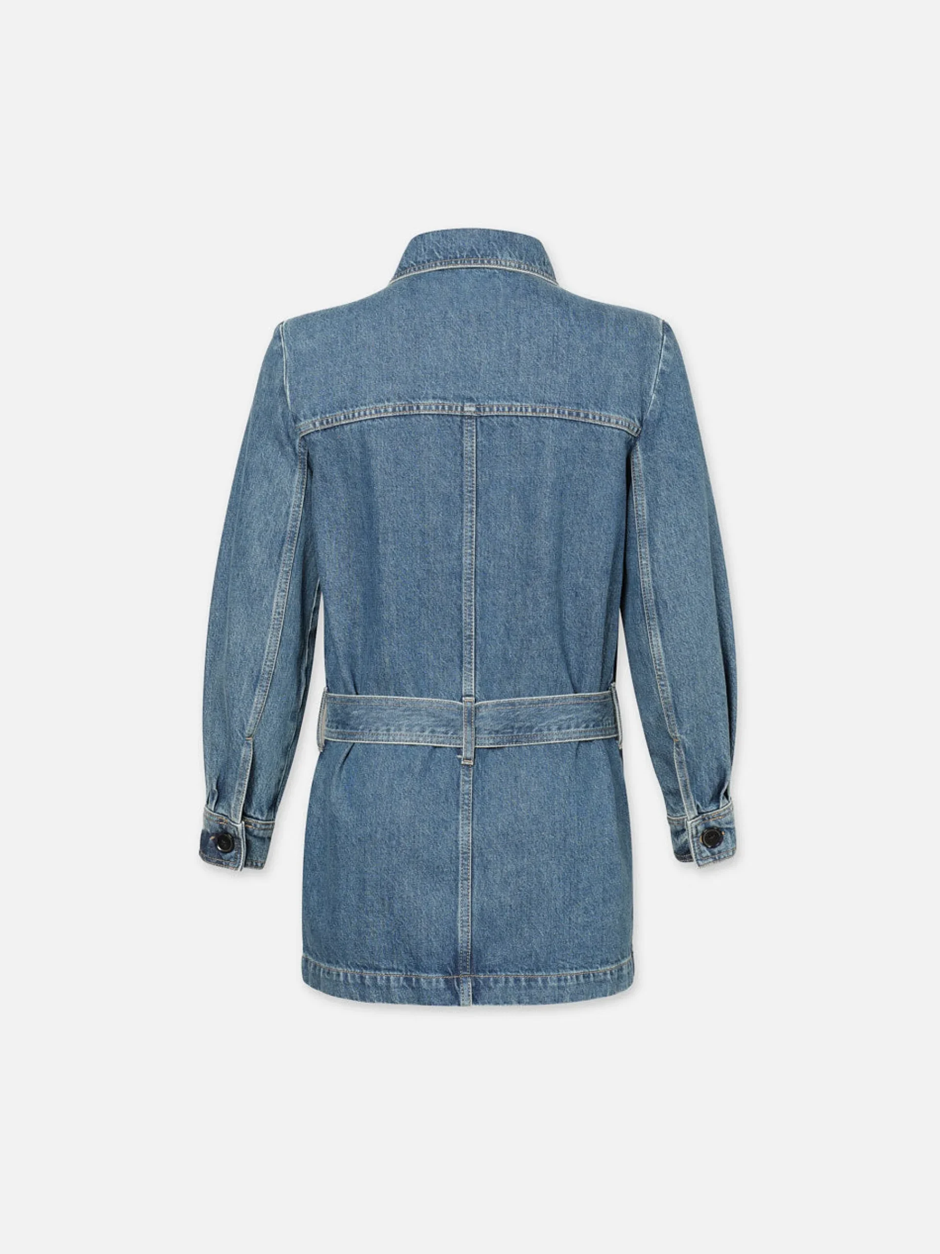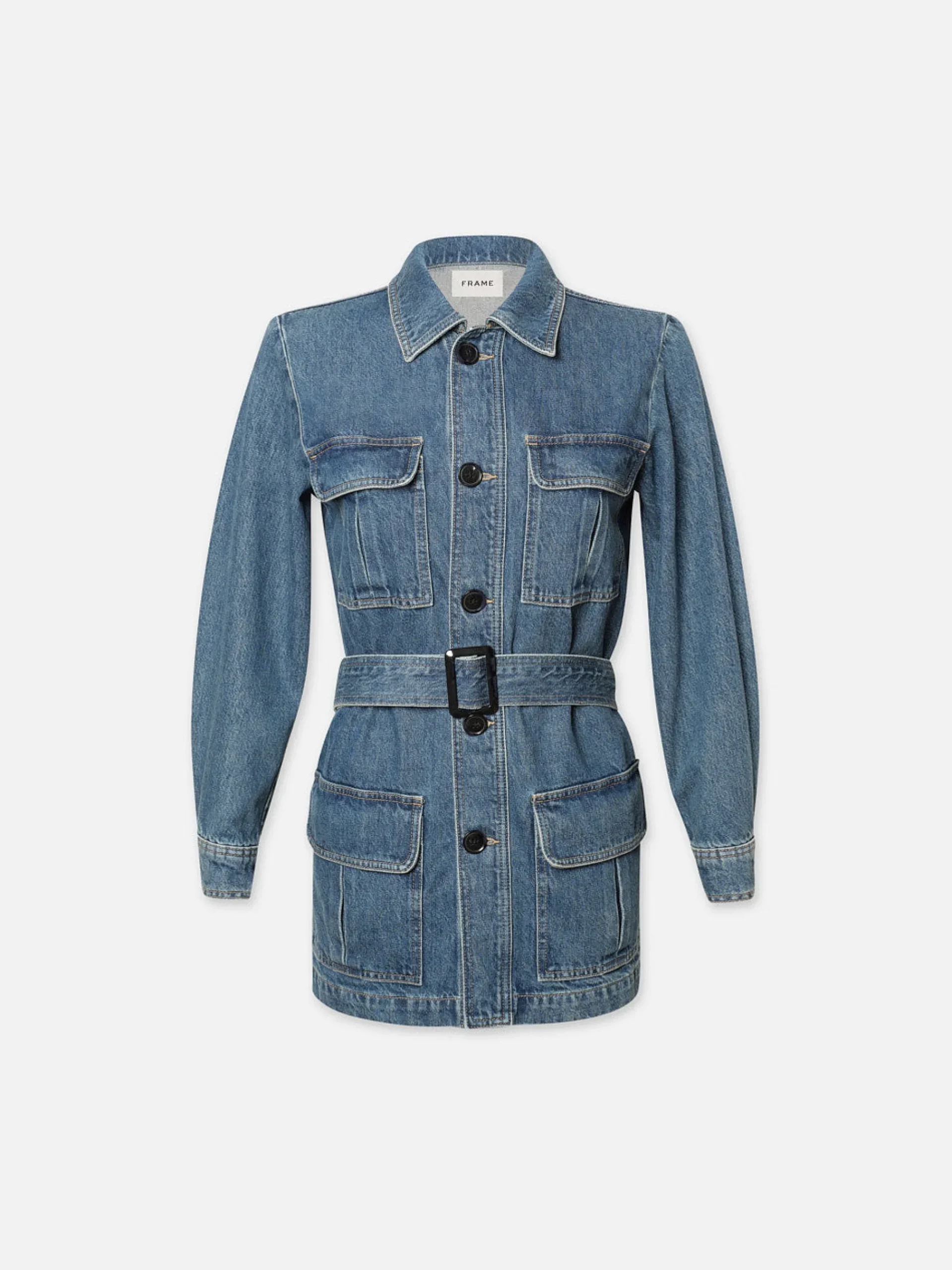 The ultimate throw-on-and-go style, this is a clean, minimal take on the traditional safari jacket silhouette. Crafted from a sustainable denim, it features utility pockets, blouson sleeves, and contrast button and belt buckle—plus the belt is removable.