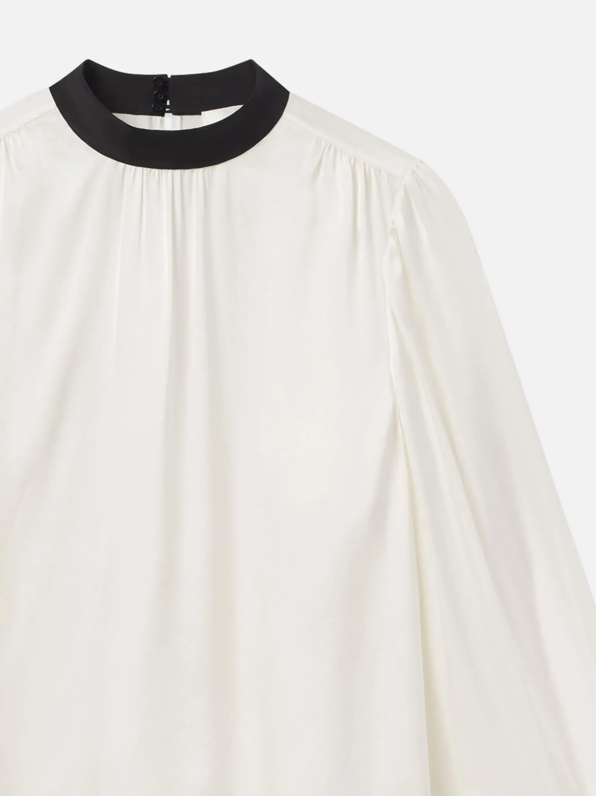 The Shirred Mock Neck Blouse is the definition of quiet, understated luxury. Crafted from pure silk, this elegant style is complete with shirred shoulder detailing, delicate pleats at the chest, keyhole button closure at the back, and an effortless billow at the cuffed long sleeves.