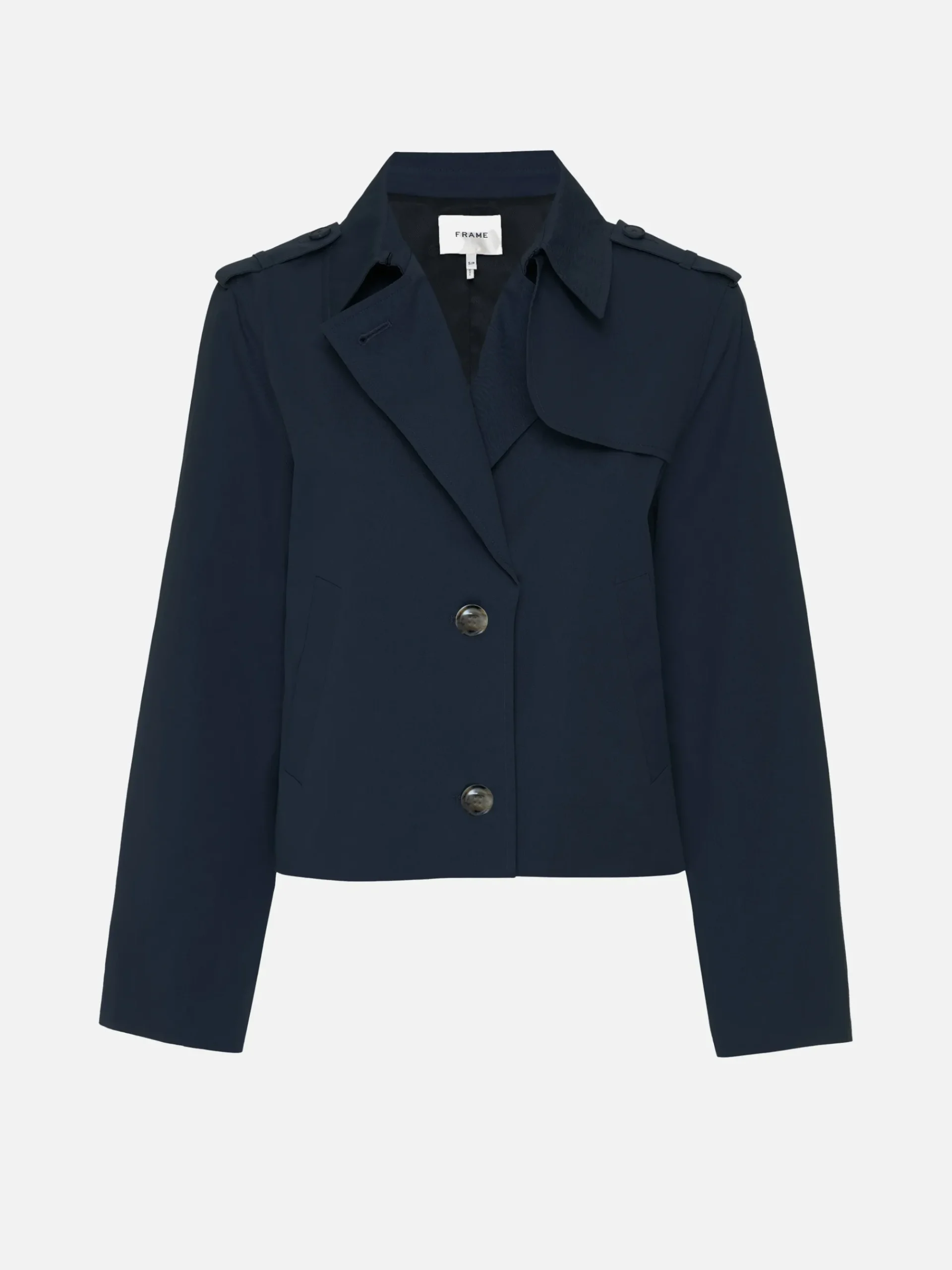 The timeless silhouette of a trench, updated for warmer weather with a cropped length. Featuring wide lapels, epaulettes, traditional back storm flap, horn buttons, and a modern straight hem, this piece elevates casual looks and gives your daily uniform a polished finish.