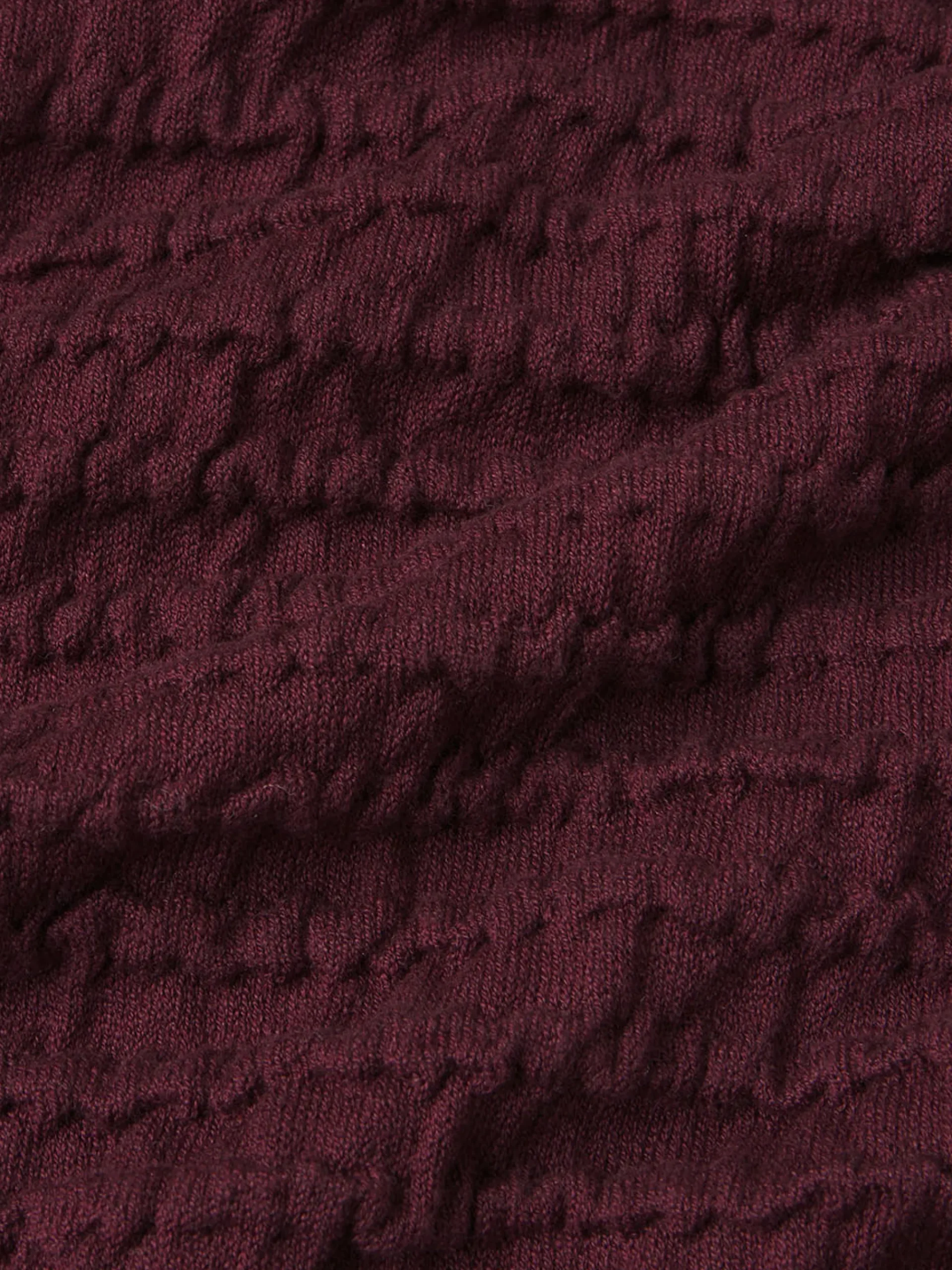 Crafted from a deep red silk crepe fabric in a minimal silhouette, this long-sleeve knit features a smocked texture that elevates everyday outfitting instantly, without sacrificing comfort or ease.