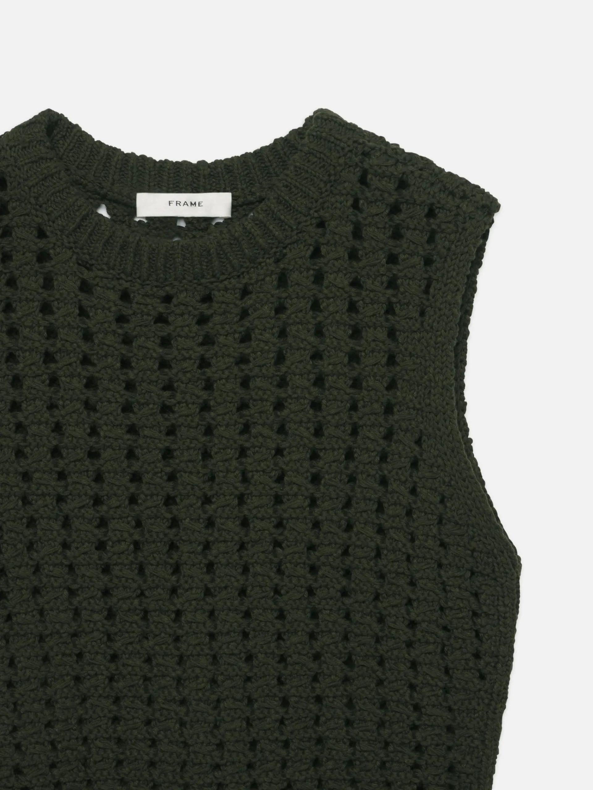 This sweater vest is knit in a crochet-like stitch from cotton tape yarn that offers a chic textured look. Given the slightly shrunken fit, it pairs especially well with high-waisted jeans and pants.