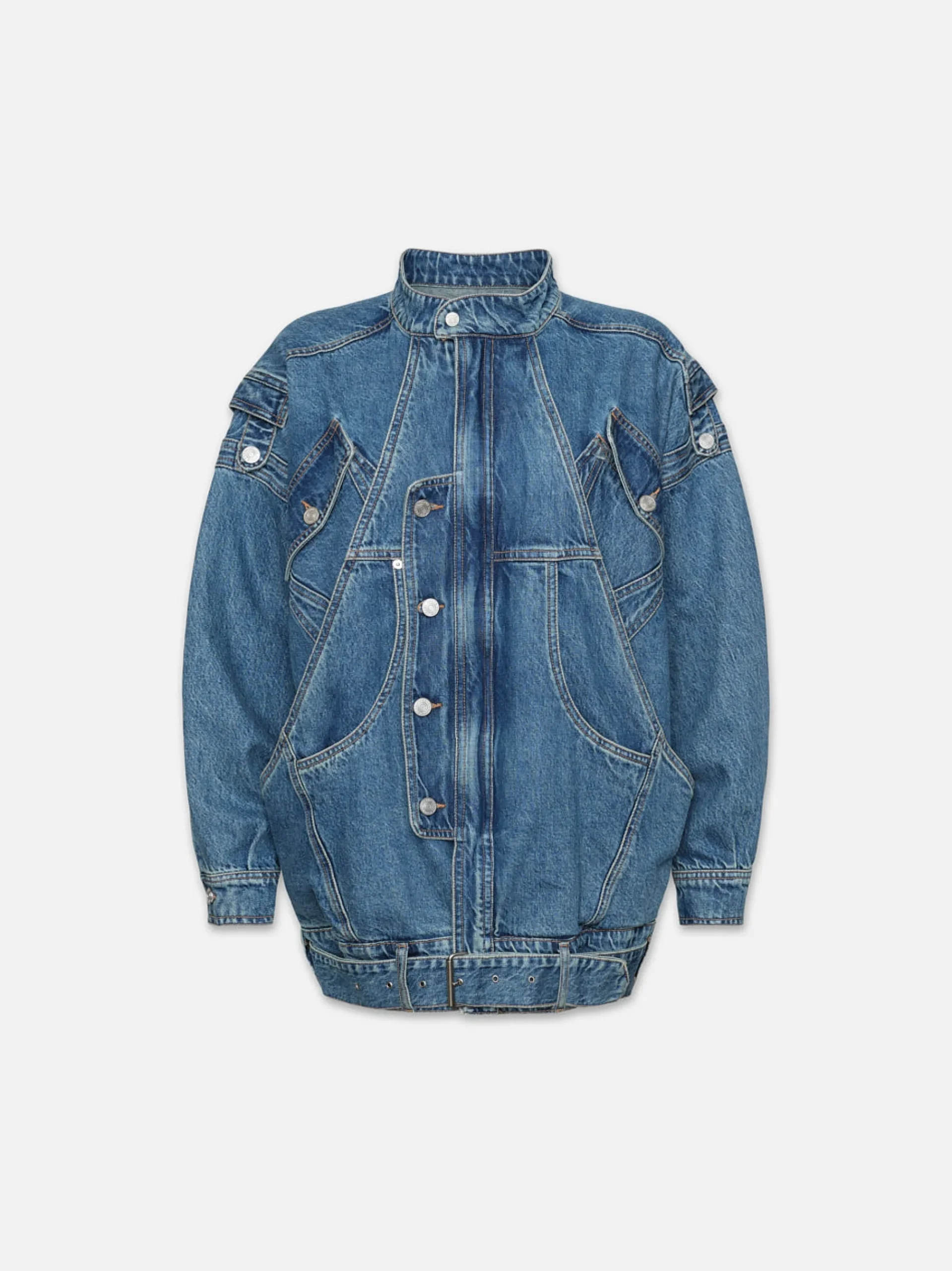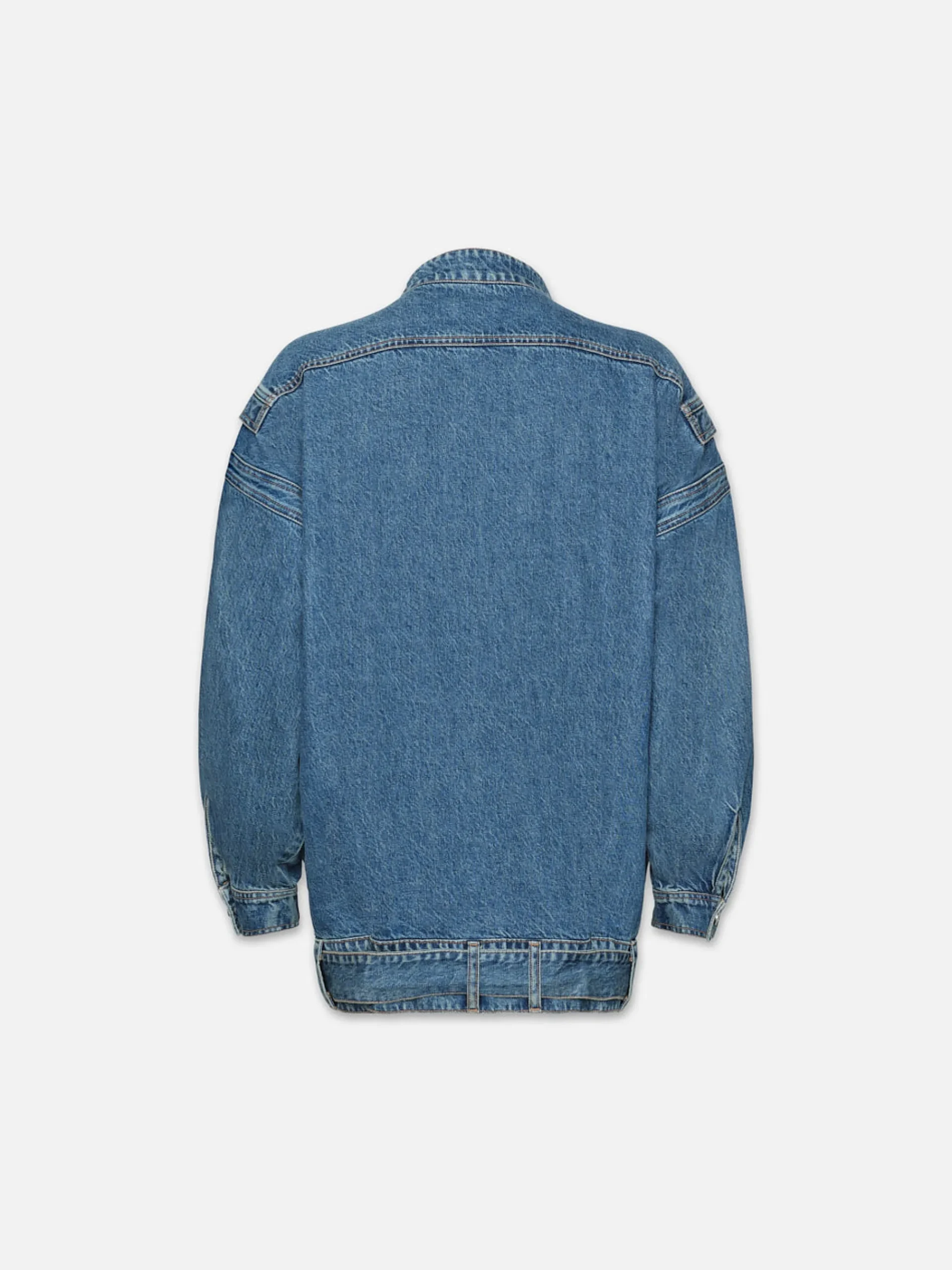 This oversized denim jacket has true star power. Featuring multiple pockets, shank buttons, epaulettes, and a drop waist belt—this utilitarian-inspired shape can be styled as a statement outer layer or as a dress for an off-kilter look on nighttime occasions. Crafted from a FRAME sustainable denim made with recycled materials.